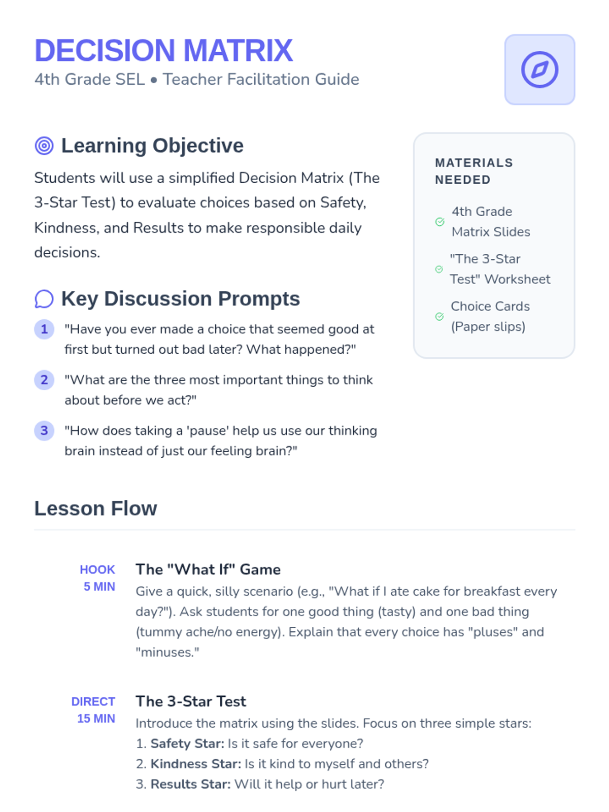 Empowers 5th-grade students to make responsible choices by evaluating the potential consequences of their actions.
