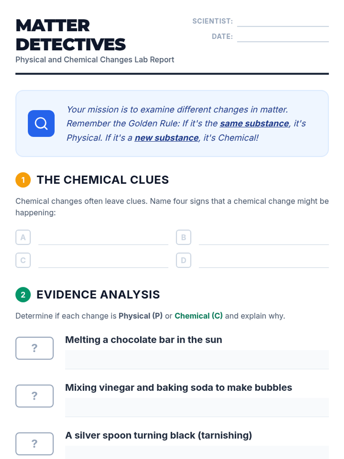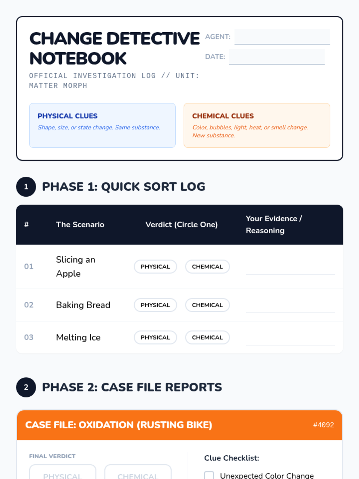 A high-energy lesson where students become 'Change Detectives' to identify and justify the differences between physical and chemical changes through two distinct 30-minute investigations.