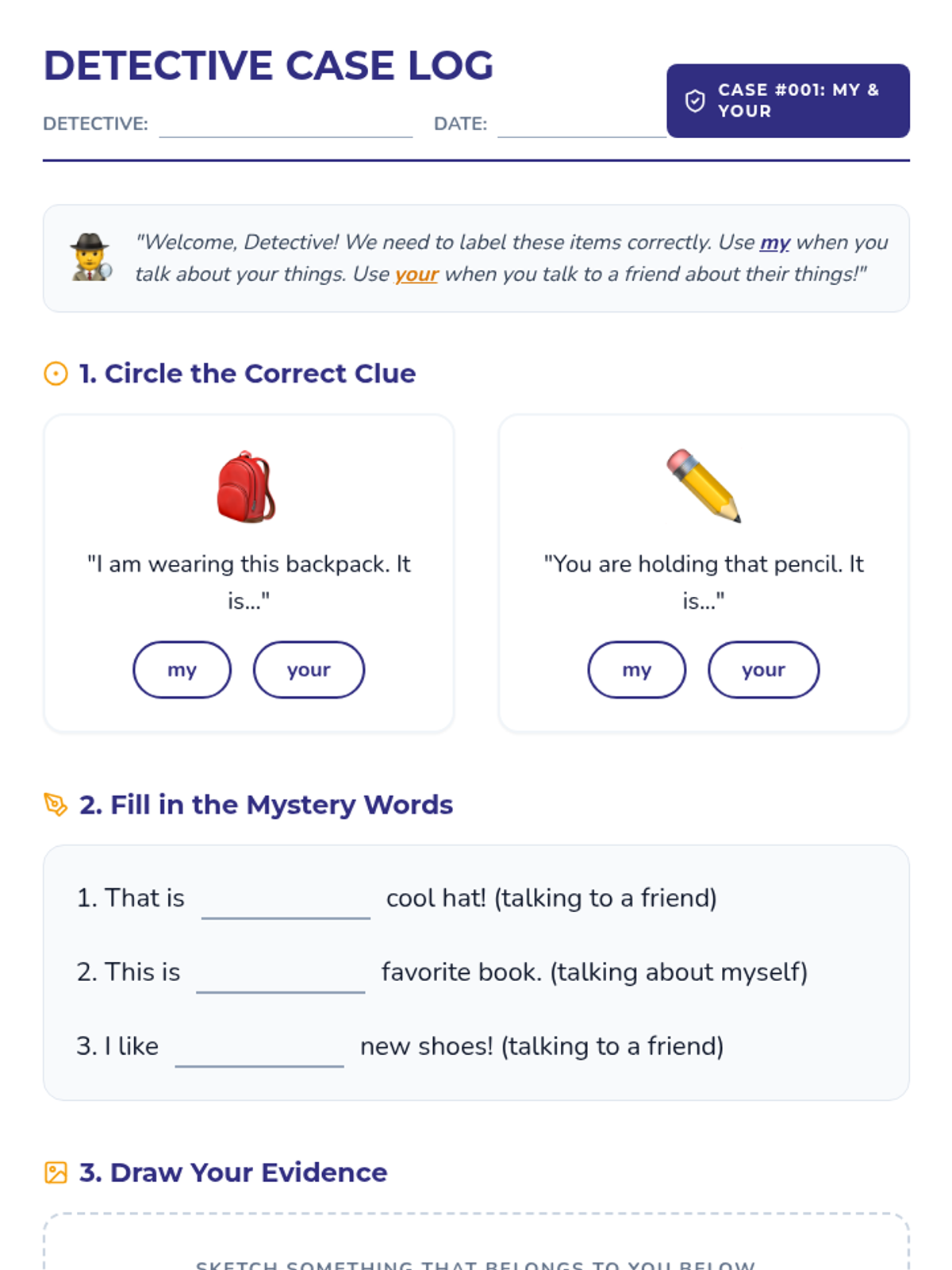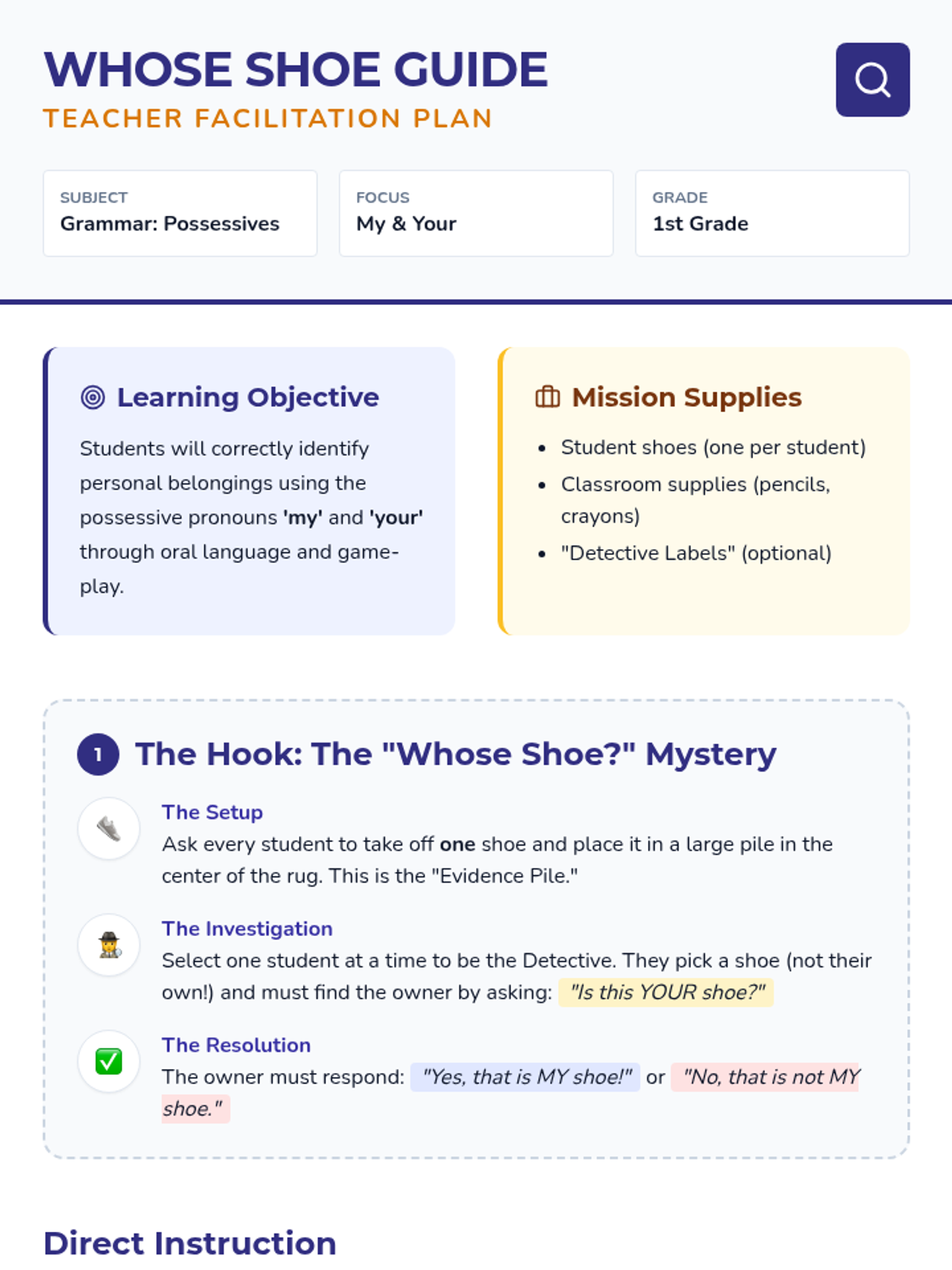 Students explore 'my' and 'your' through the 'Whose Shoe?' game and partner activities with classroom supplies.