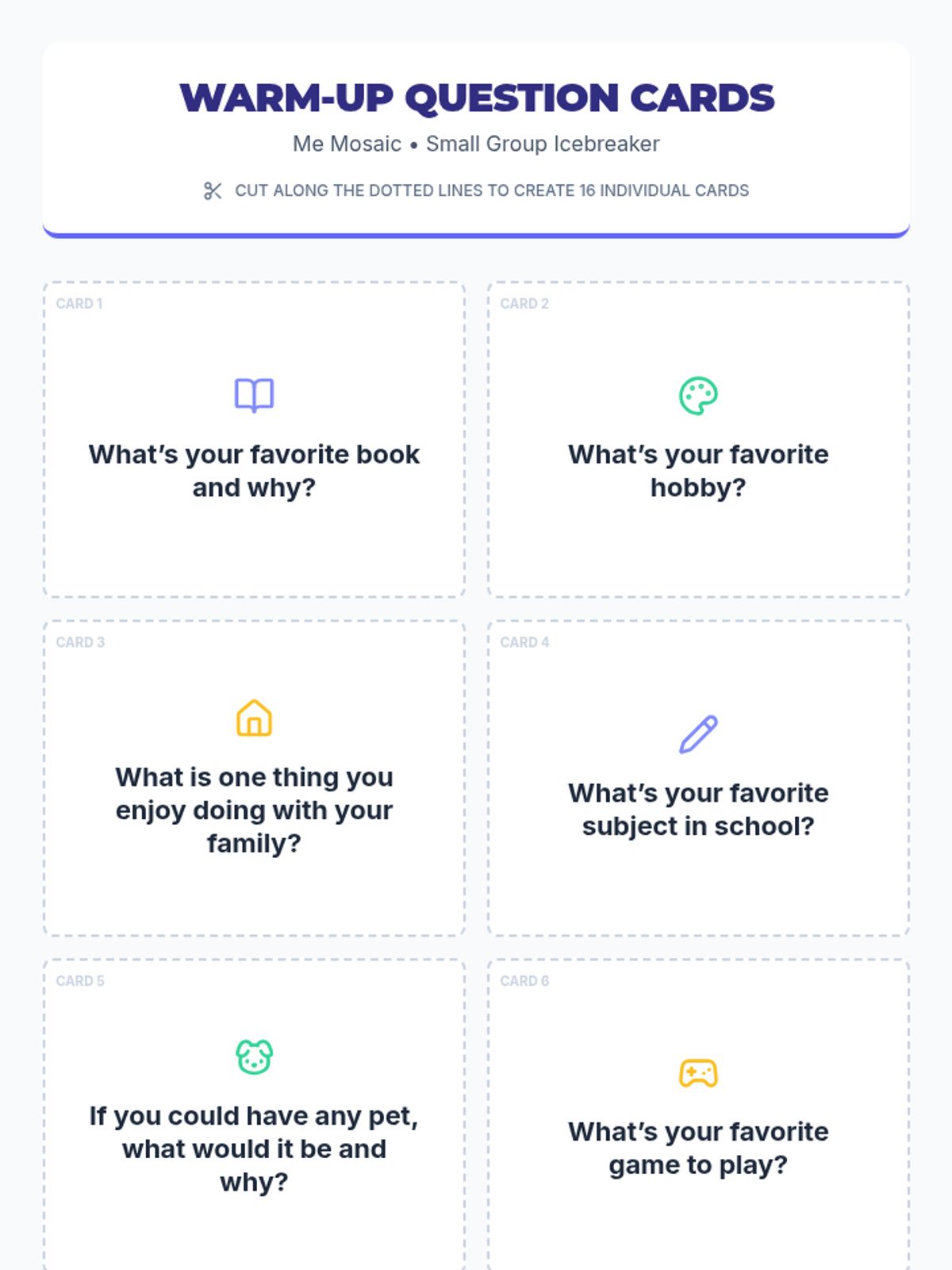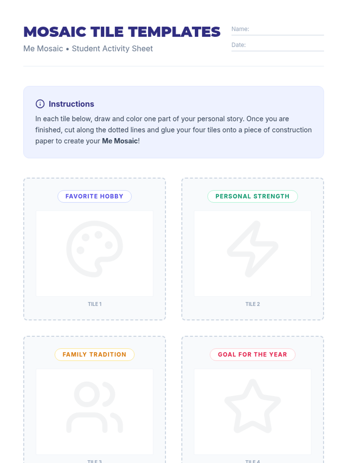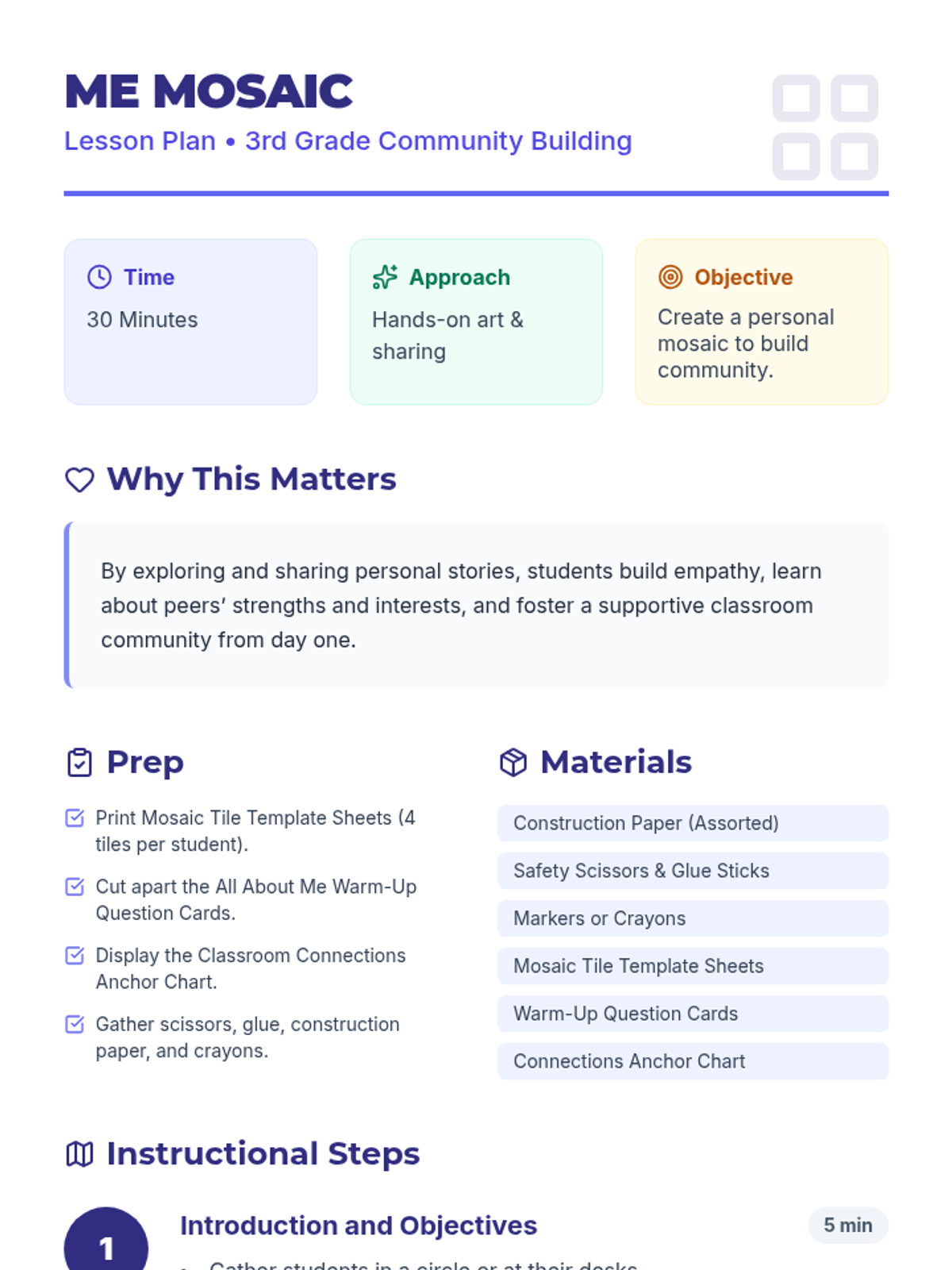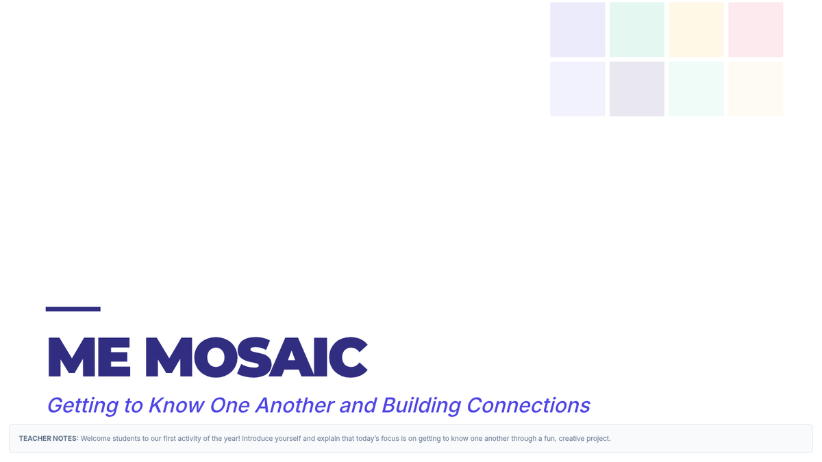 A one-session community-building lesson where 3rd graders explore personal interests, strengths, and backgrounds through a creative mosaic activity and guided reflection.