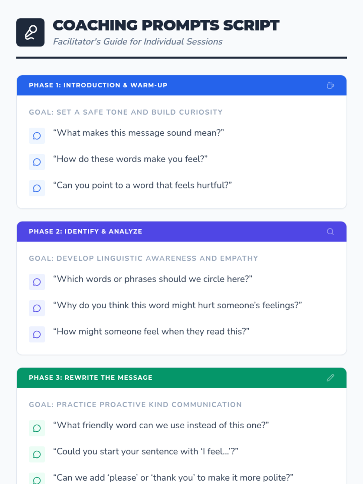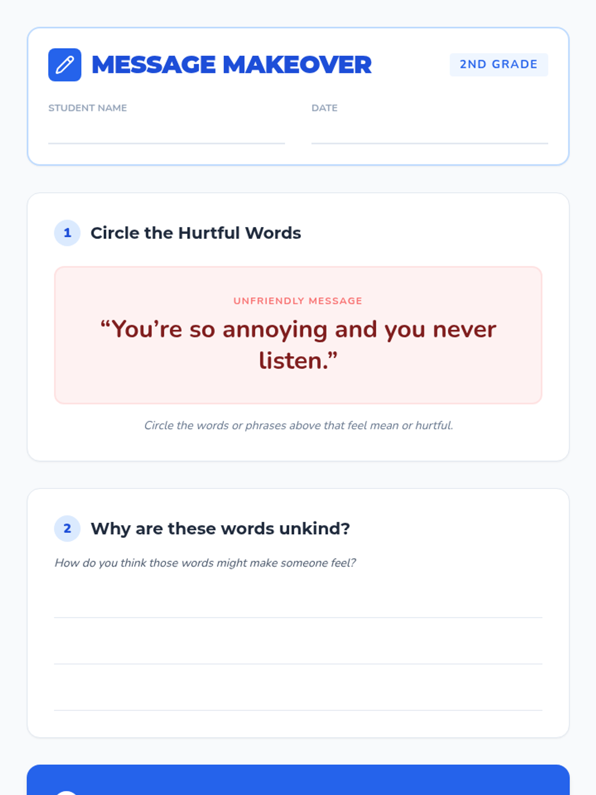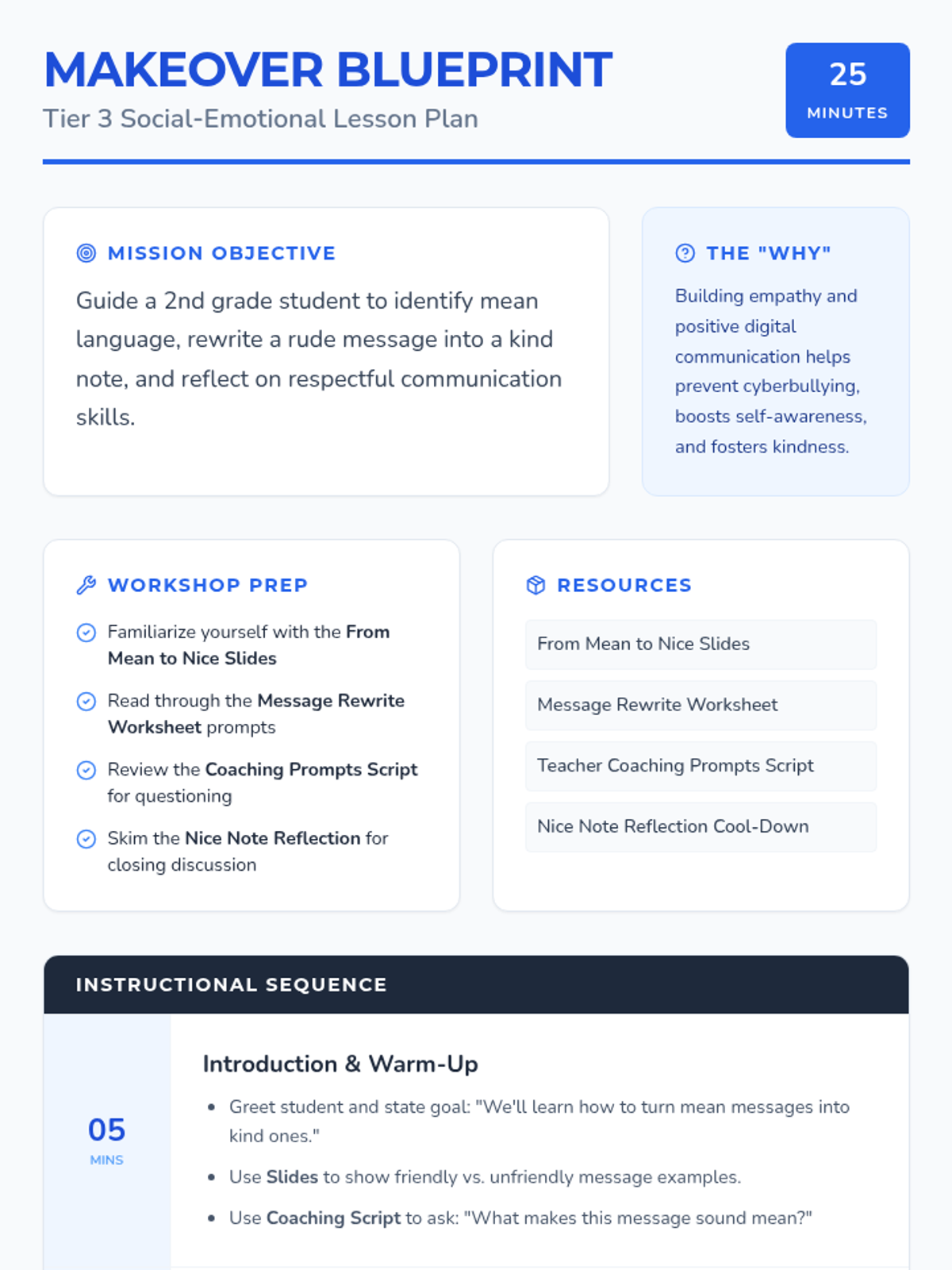A 25-minute one-on-one Tier 3 session for 2nd graders to learn how to transform rude digital messages into kind, polite communication, building empathy and social-emotional skills.