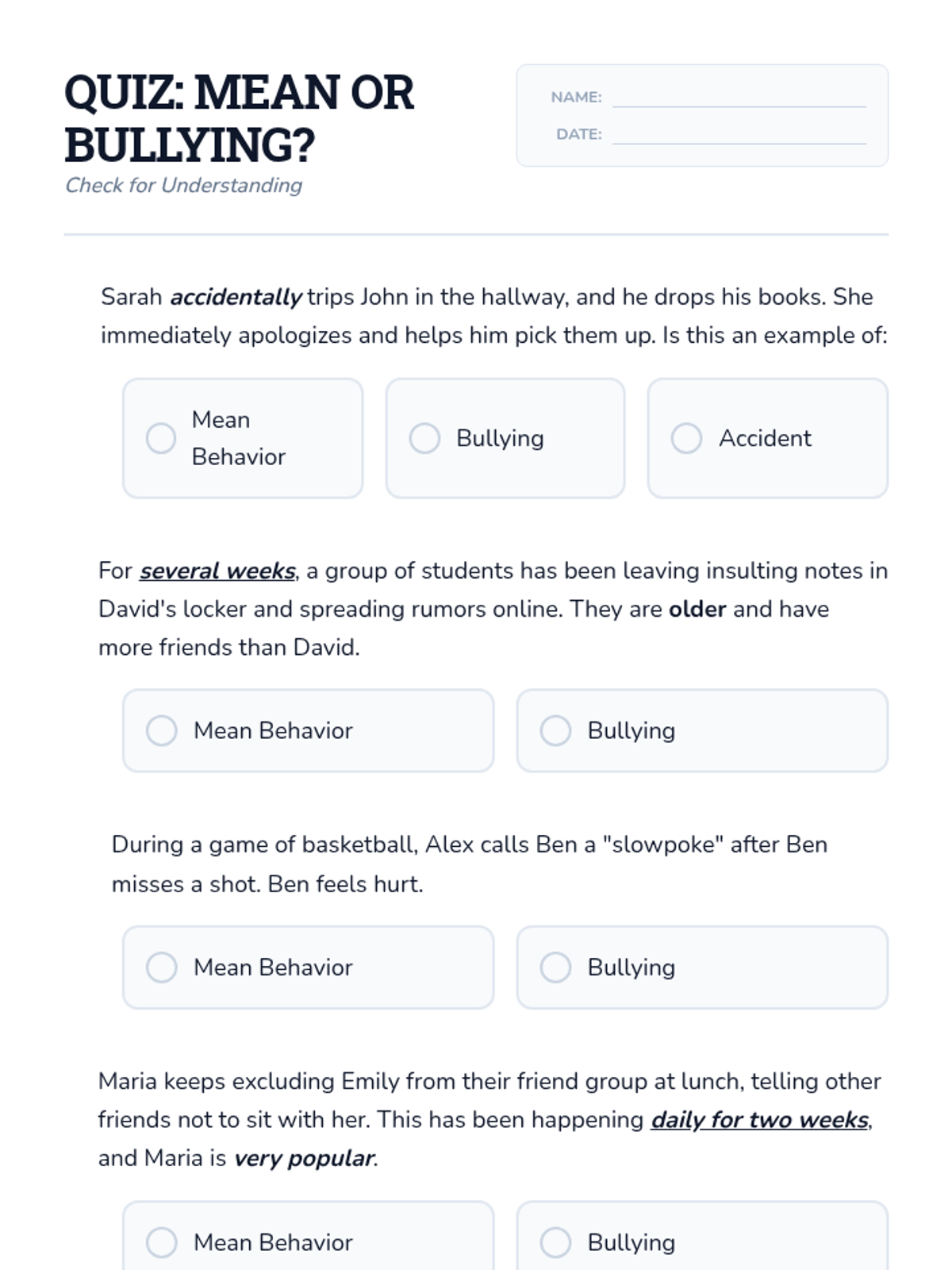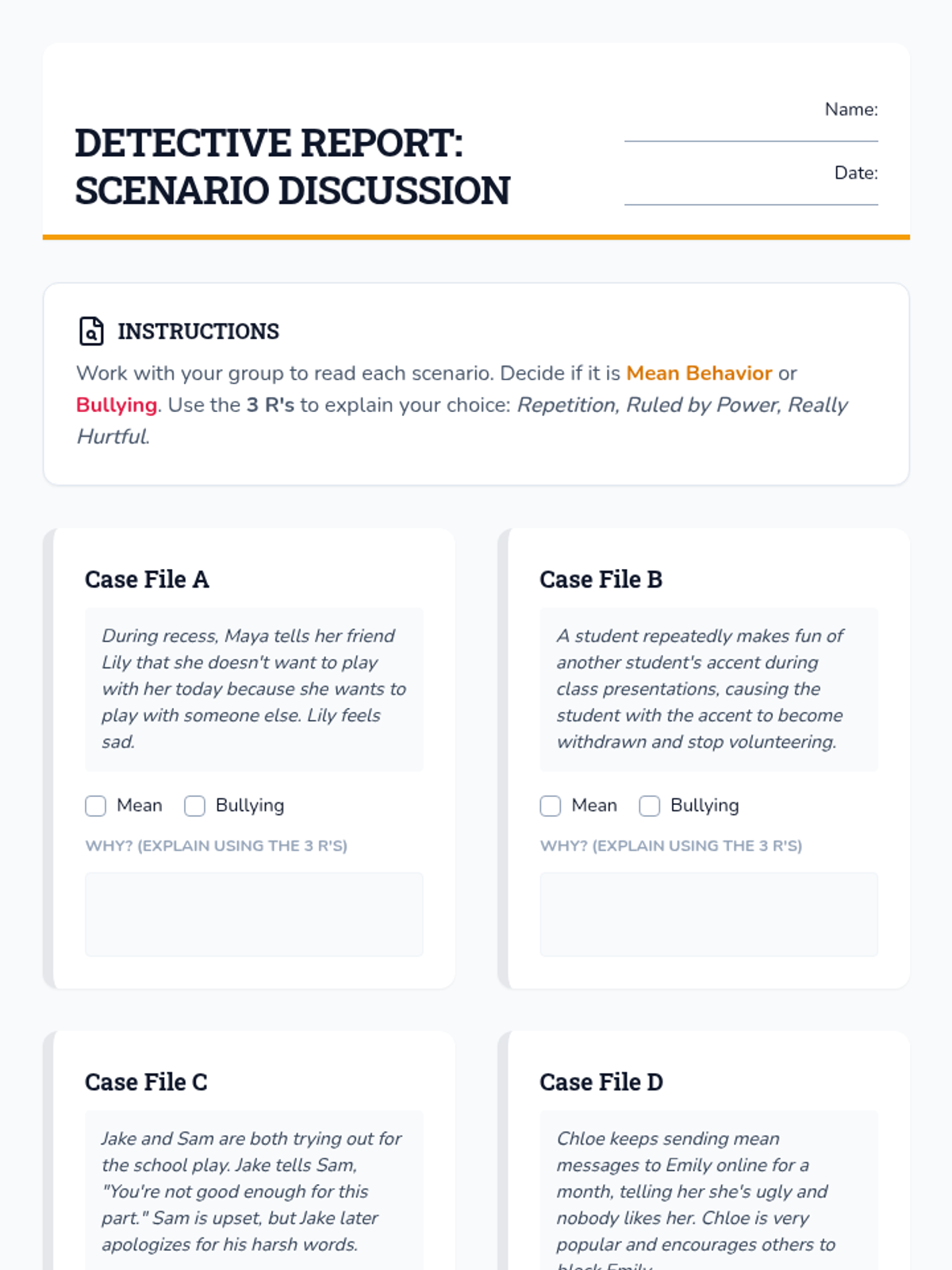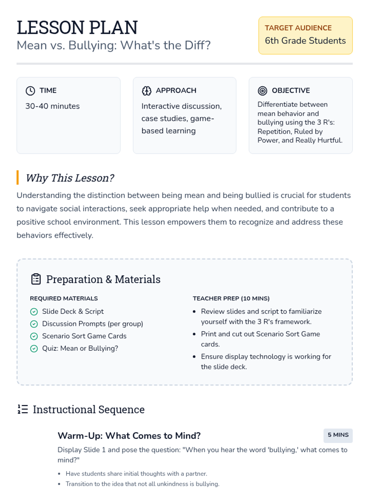 This lesson helps 6th-grade students understand the critical difference between being mean and being bullied by identifying key characteristics such as intent, repetition, and power imbalance. Students engage in interactive discussions, case studies, and a scenario sorting game to apply their knowledge.