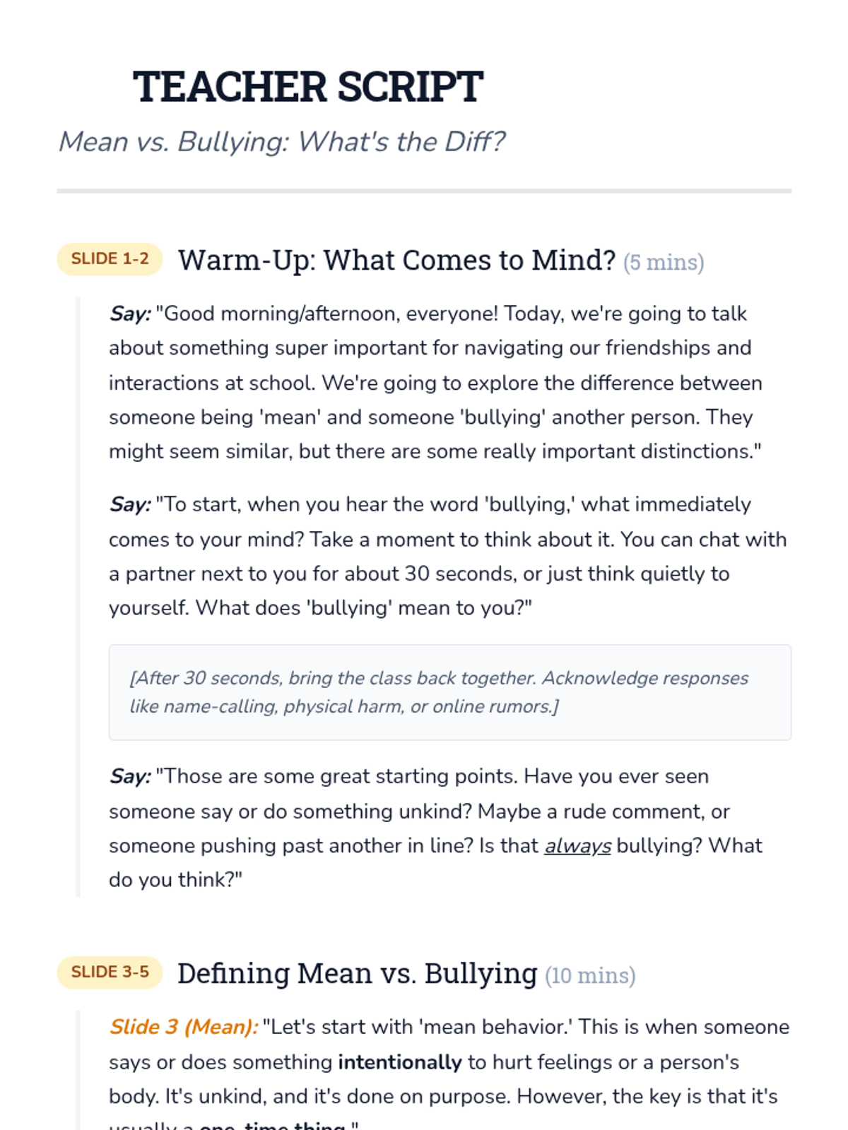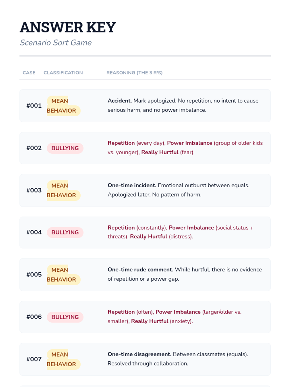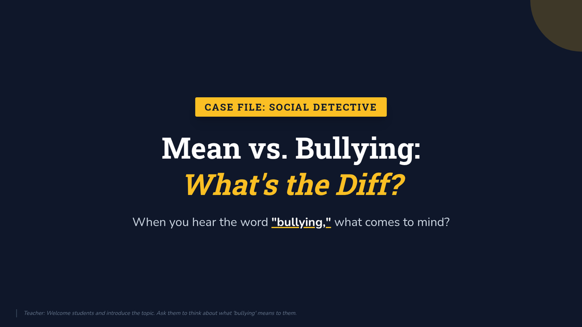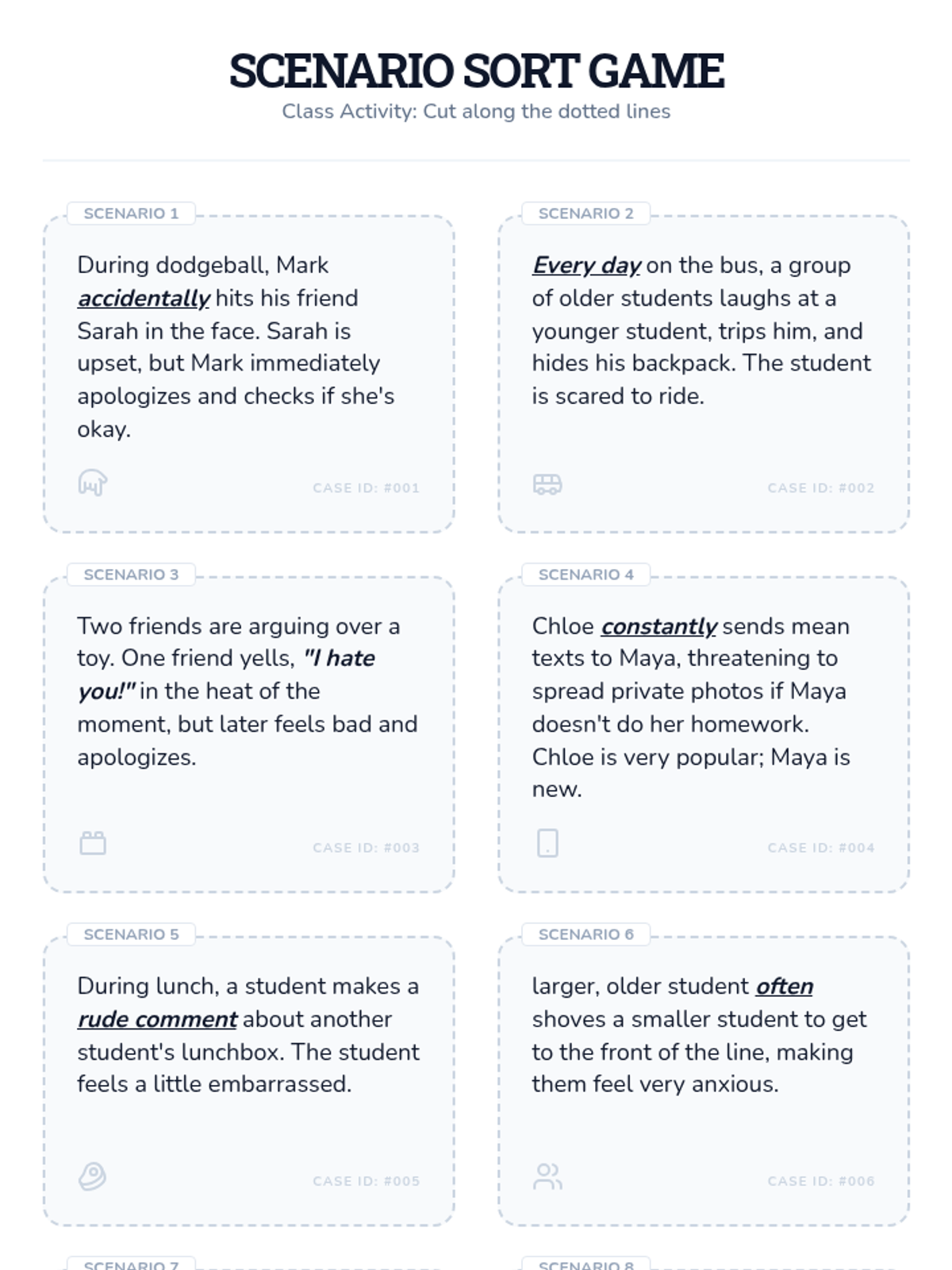 This lesson helps 6th-grade students understand the critical difference between being mean and being bullied by identifying key characteristics such as intent, repetition, and power imbalance. Students engage in interactive discussions, case studies, and a scenario sorting game to apply their knowledge.