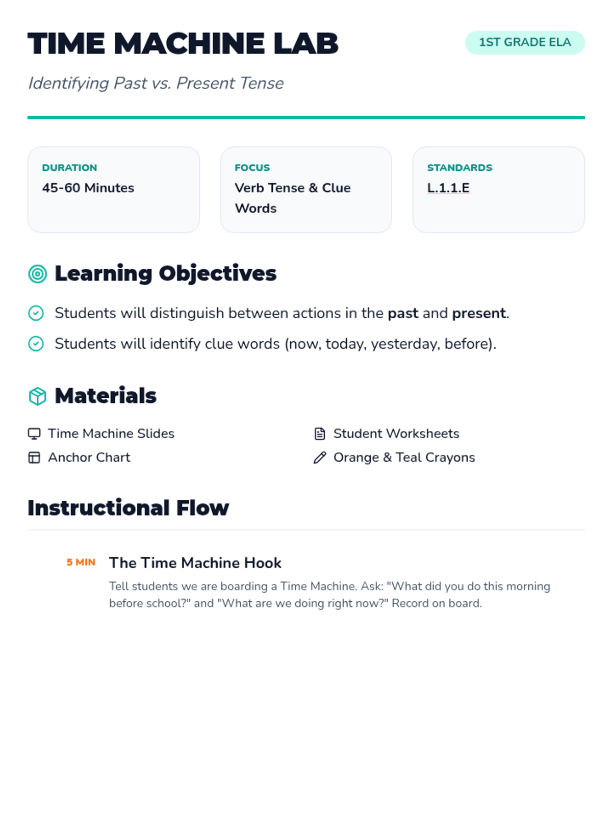 A foundational lesson for 1st grade students to distinguish between past and present tense using time markers and verb endings. Students will learn to identify 'now' versus 'before' through interactive slides, visual aids, and hands-on practice.