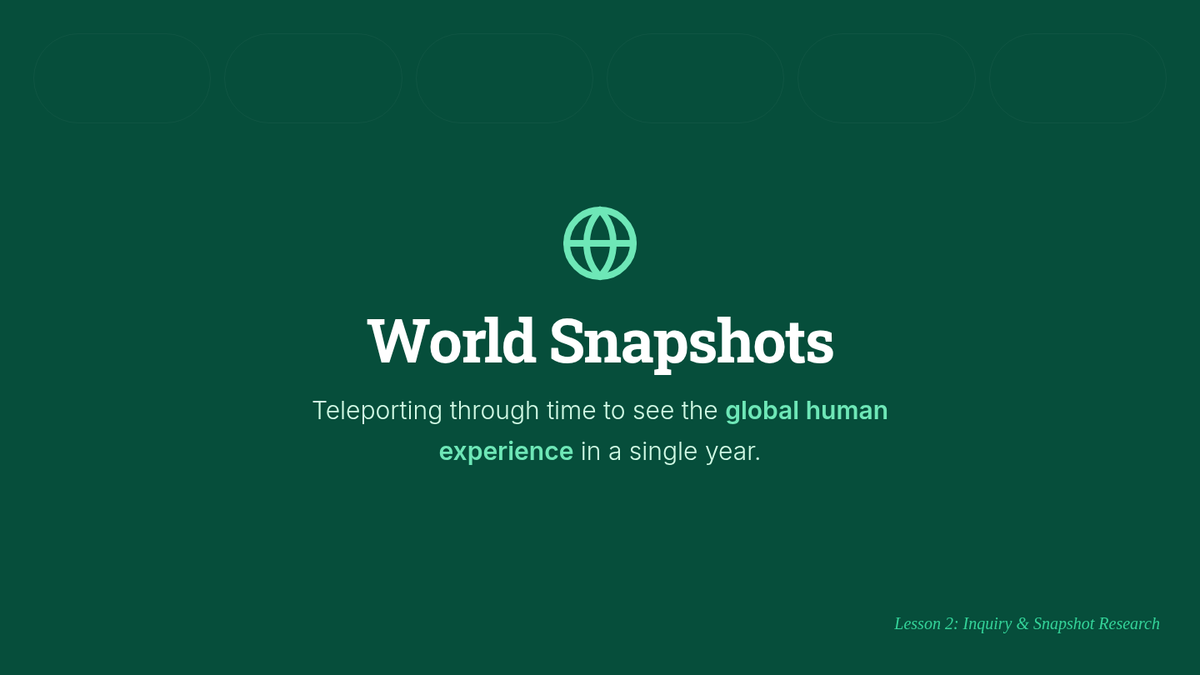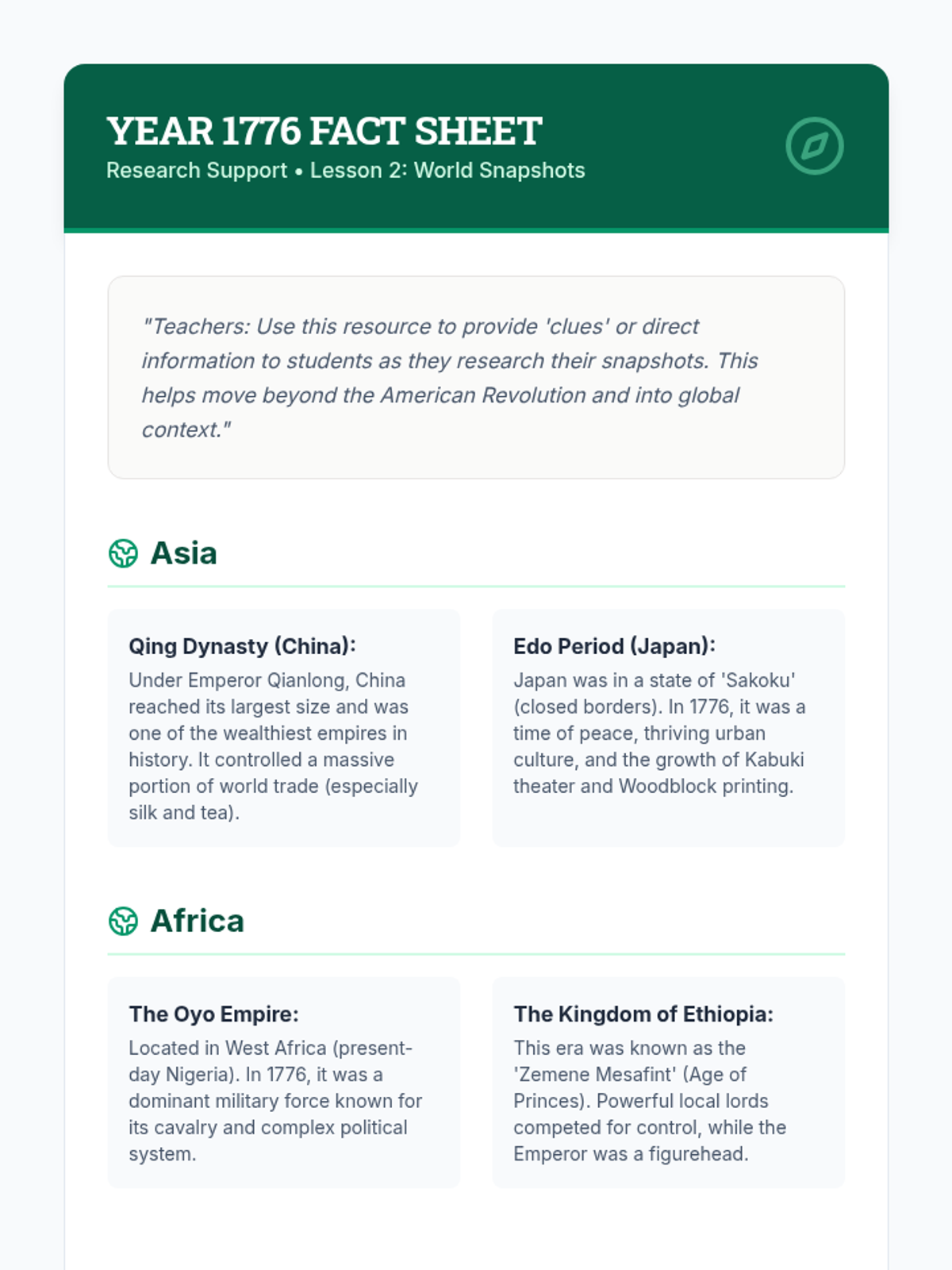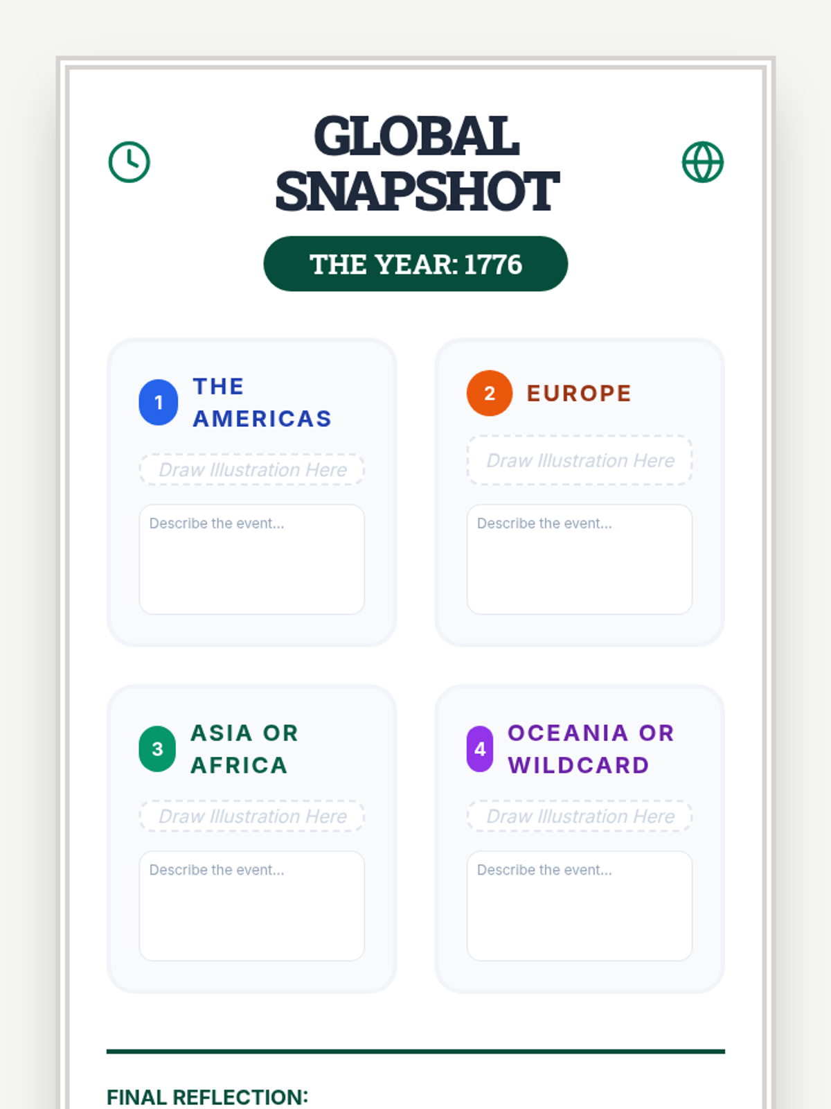 Students research events occurring globally during a specific year (1776) to create a multi-continent snapshot.