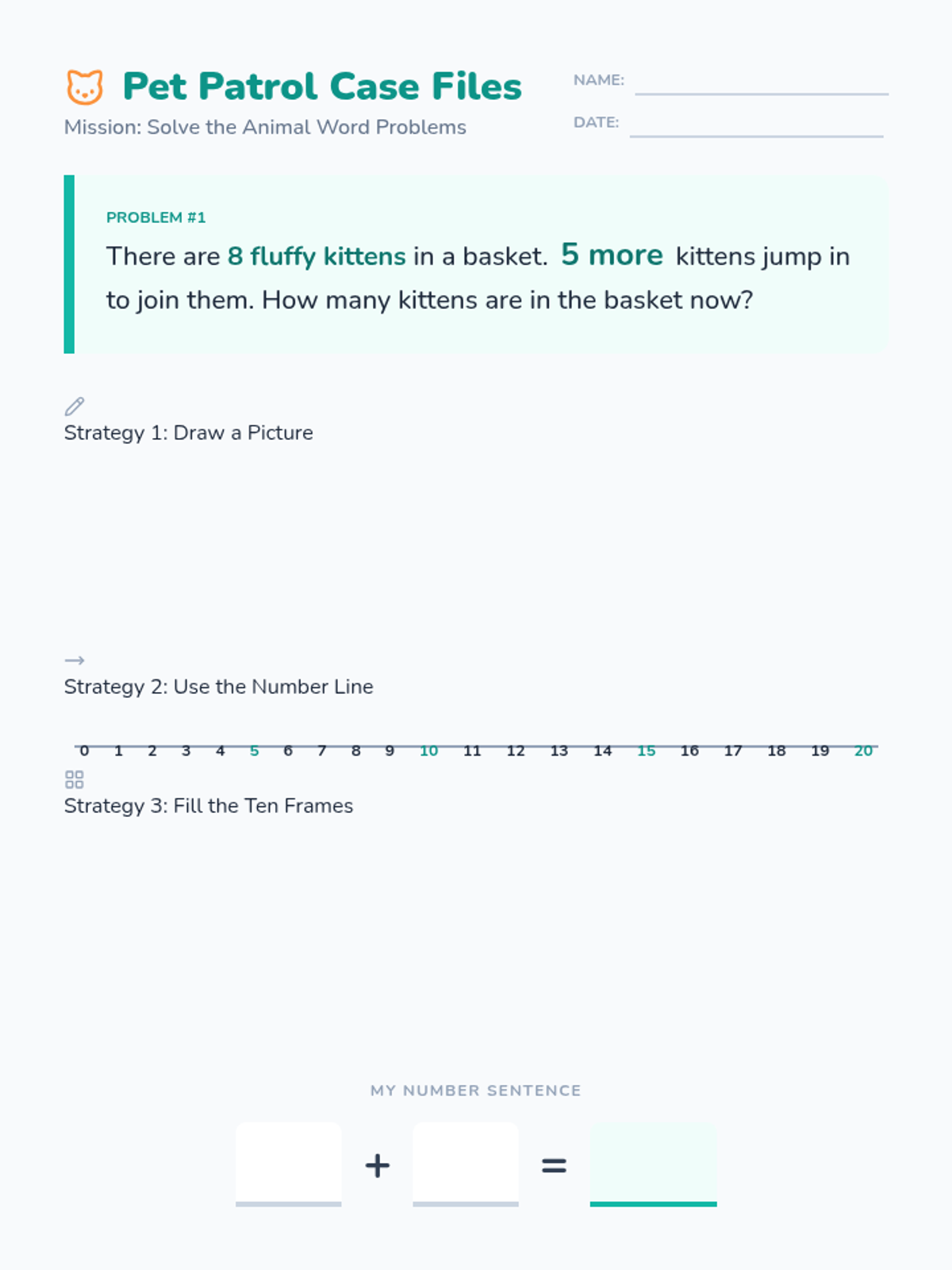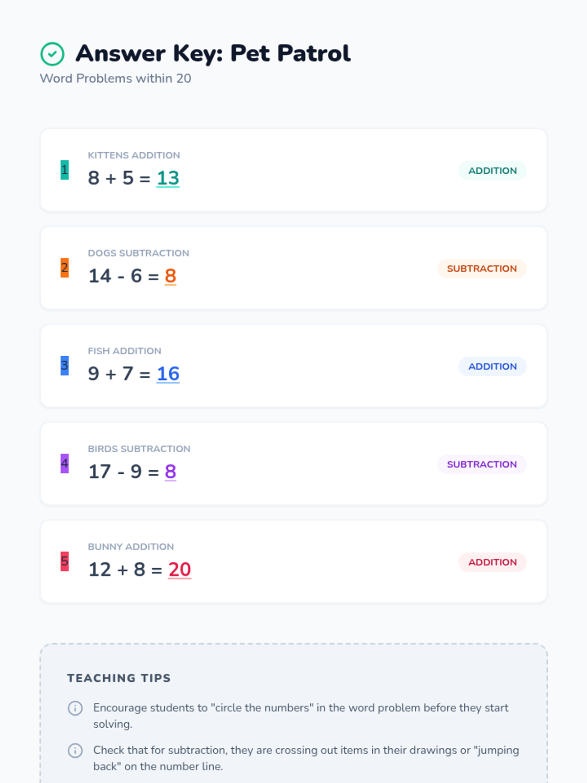 A first-grade math lesson focused on solving addition and subtraction word problems within 20 using multiple strategies: drawing pictures, number lines, and ten frames. The lesson is themed around animals and pets to engage young learners.