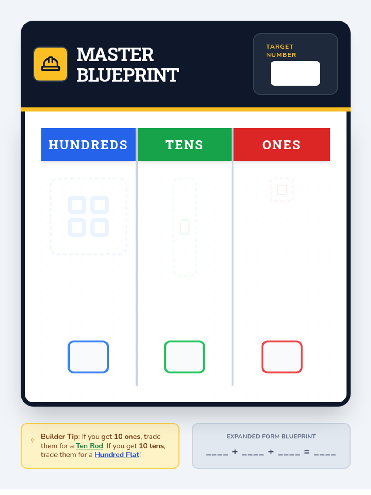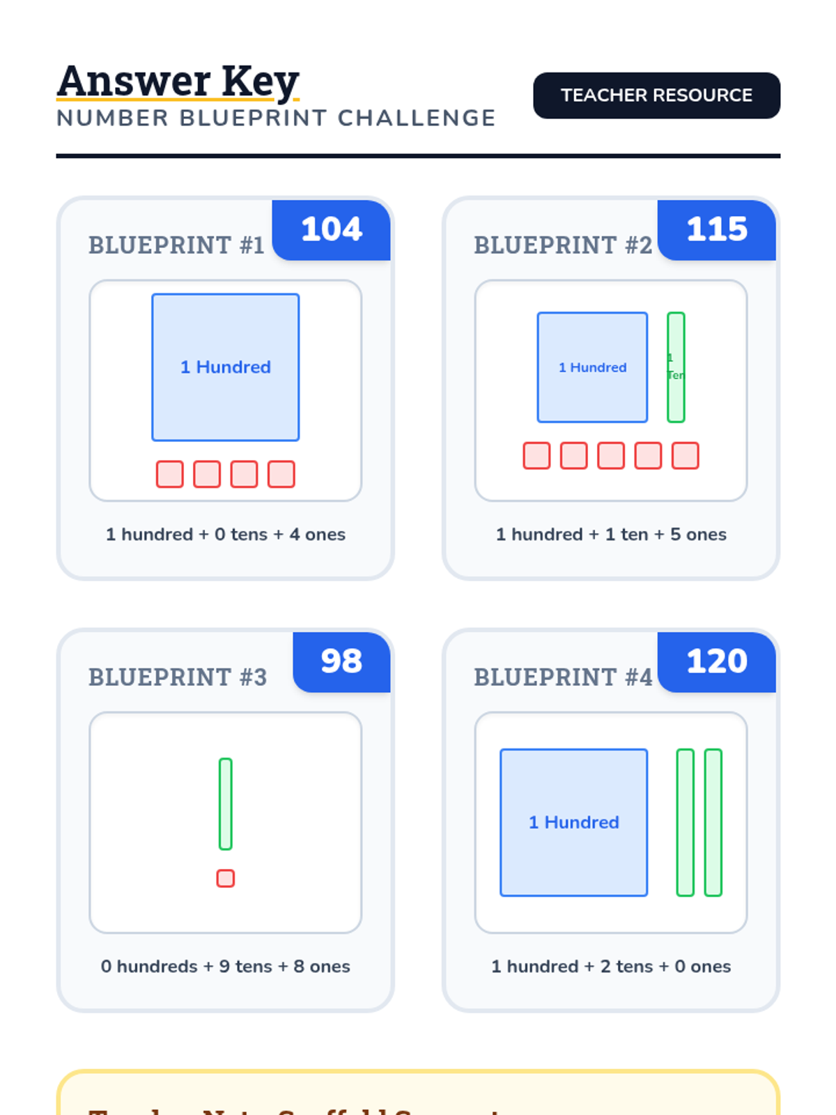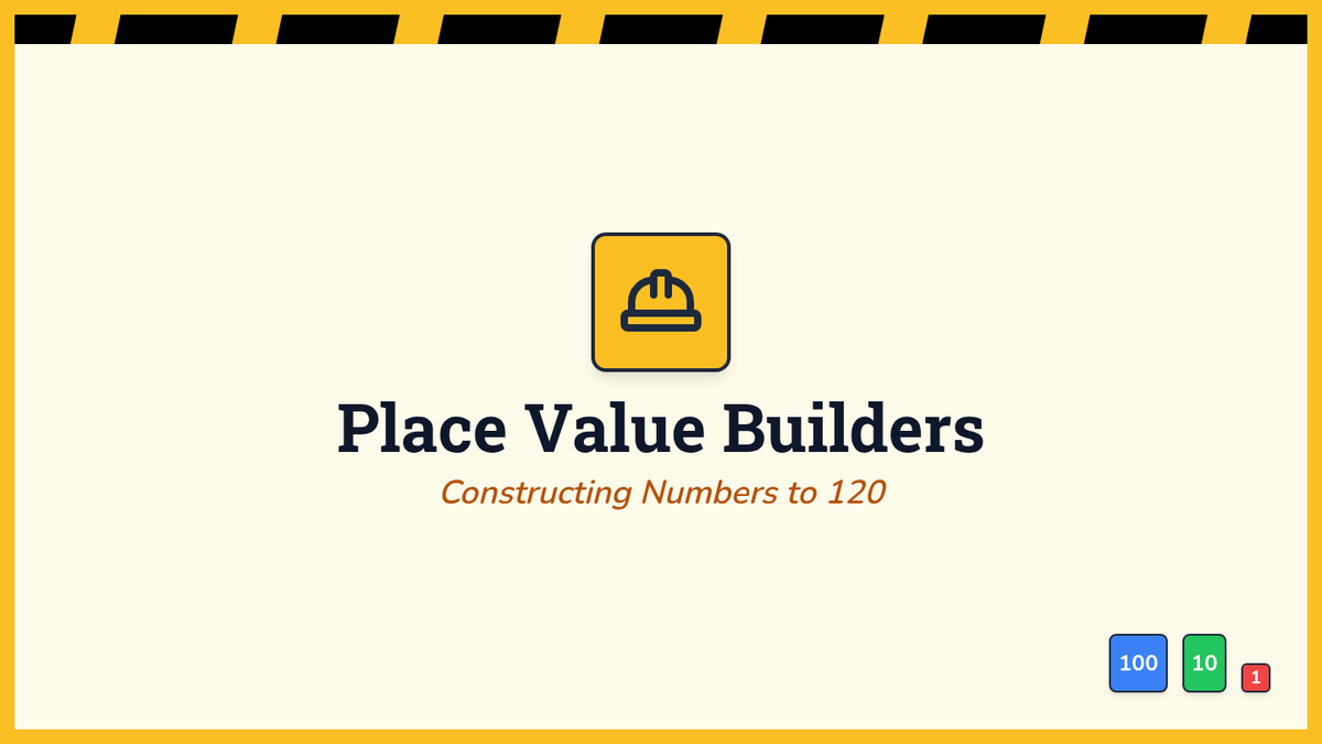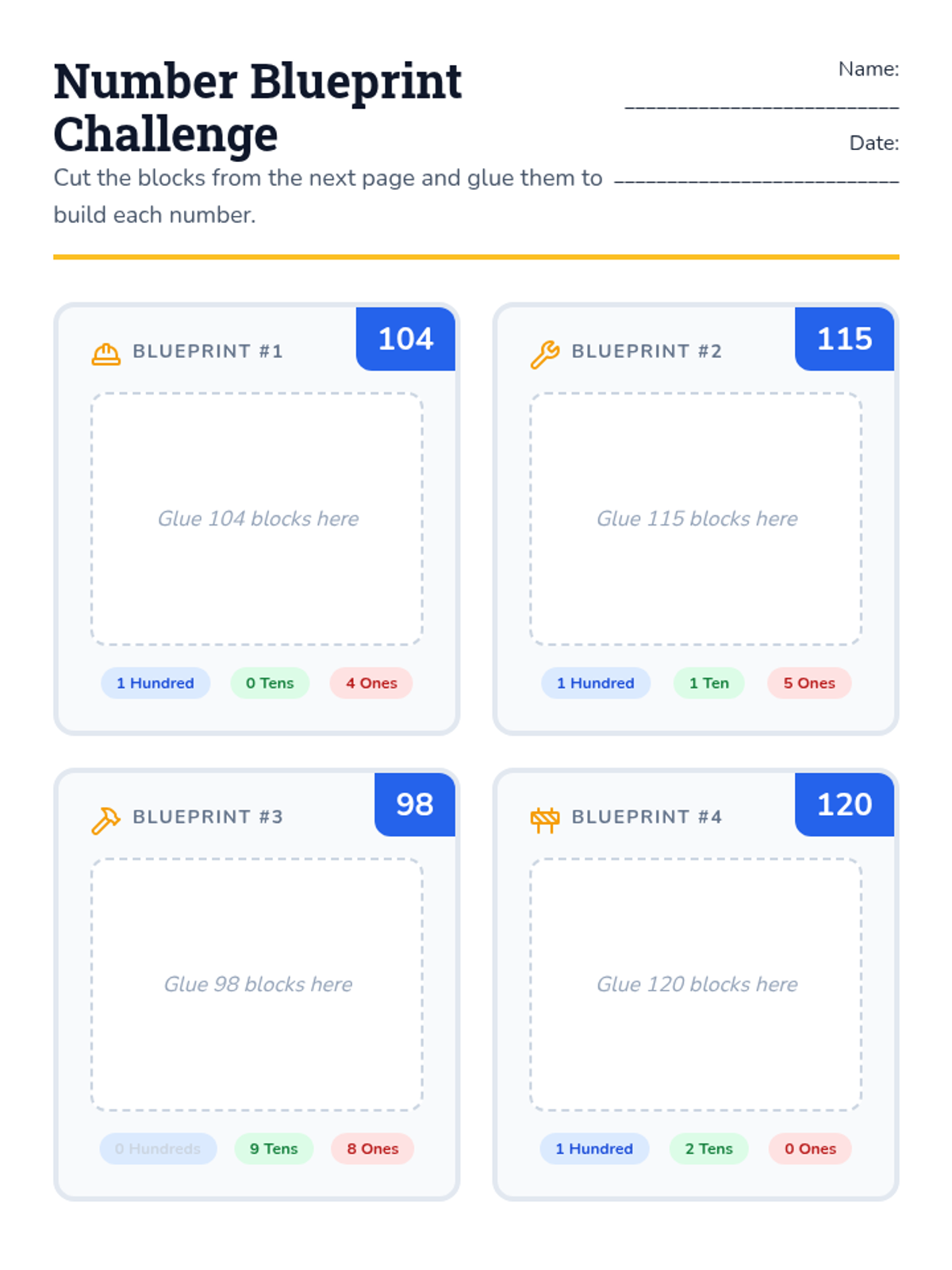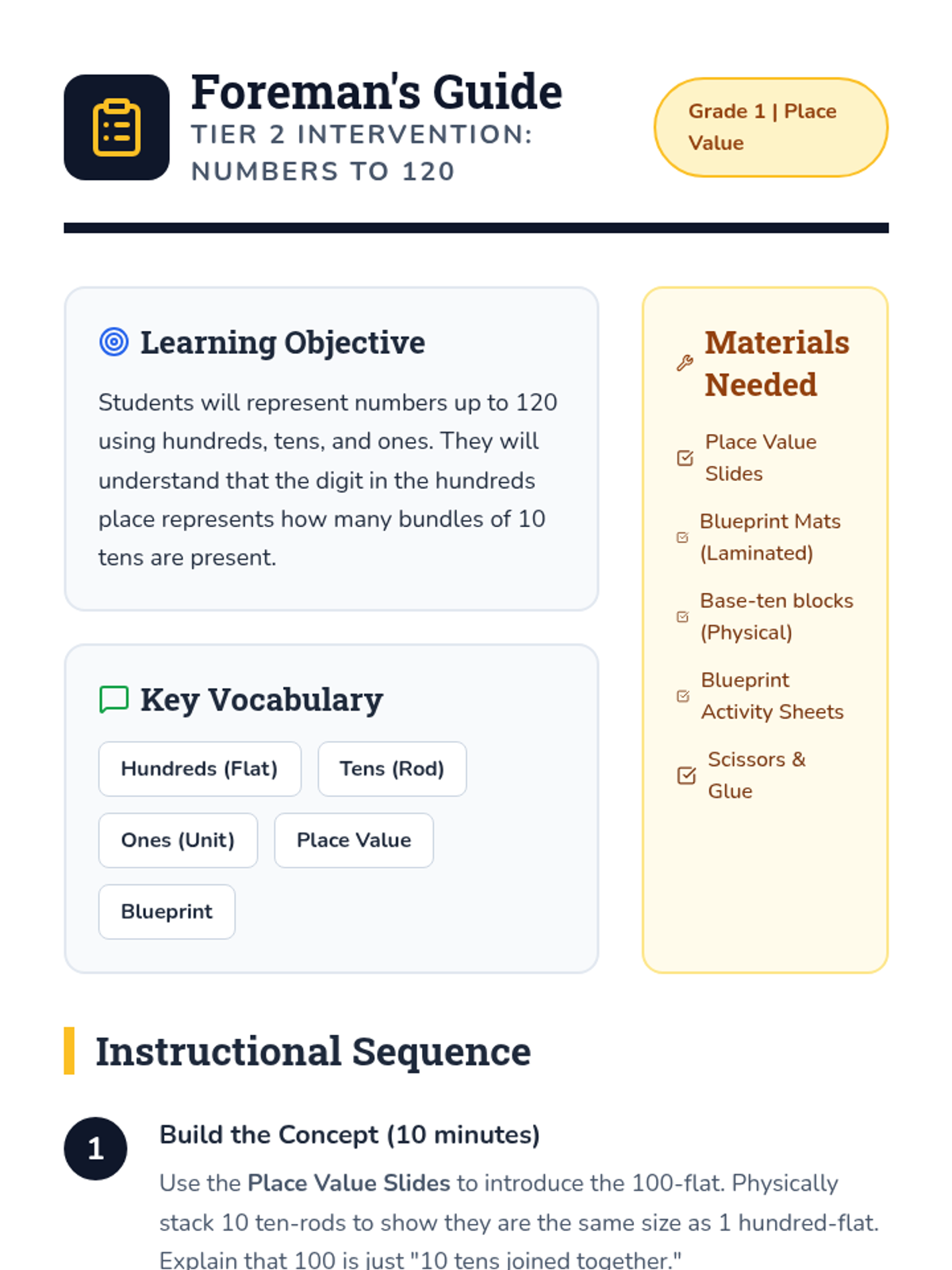 A targeted intervention lesson for 1st grade students to master place value up to 120 using hands-on 'building' activities. Students will represent numbers using hundreds, tens, and ones through cut-and-glue tasks and guided practice.