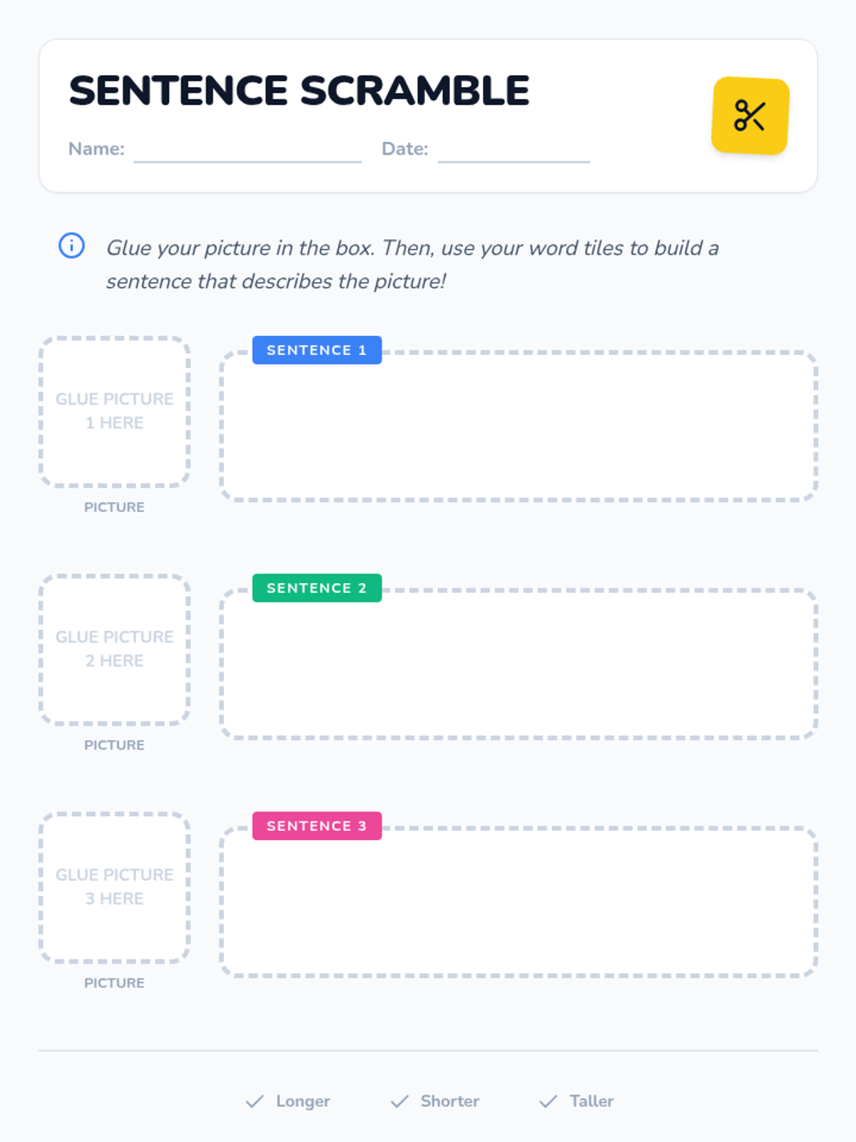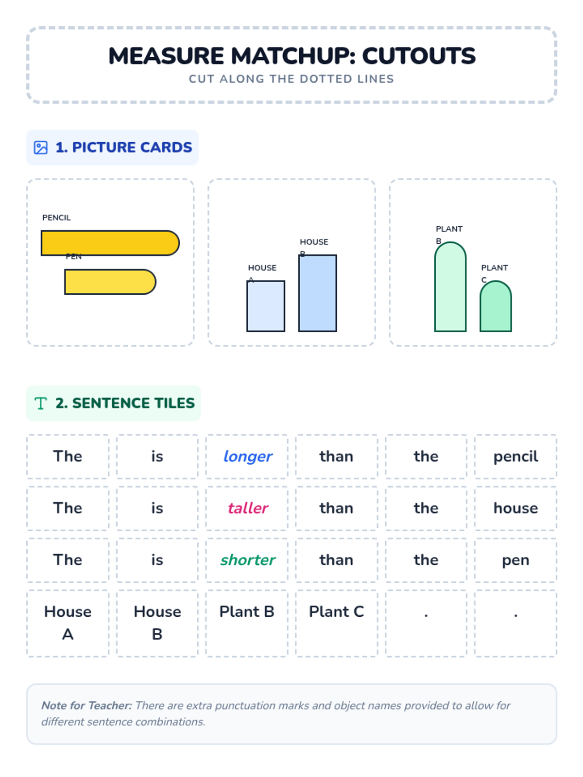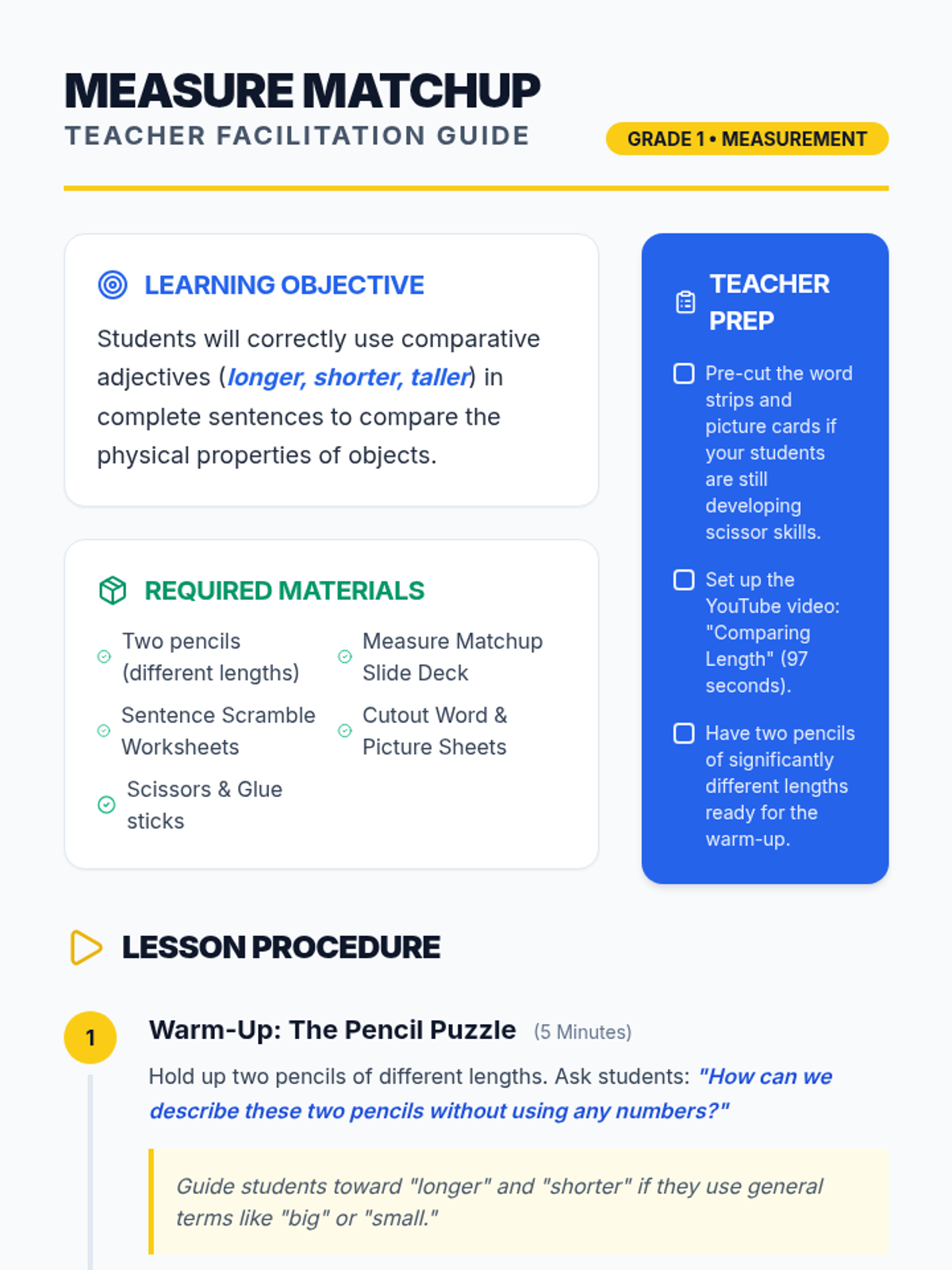 A 1st Grade lesson focused on using comparative adjectives (longer, shorter, taller) to compare objects, featuring interactive video discussion and a hands-on sentence construction activity.
