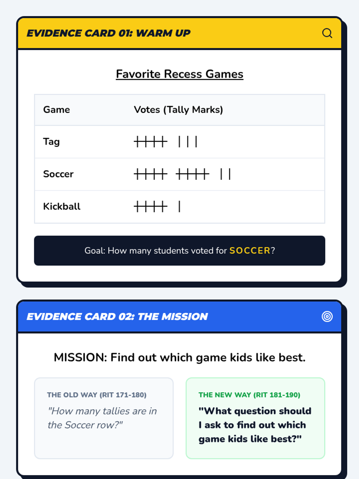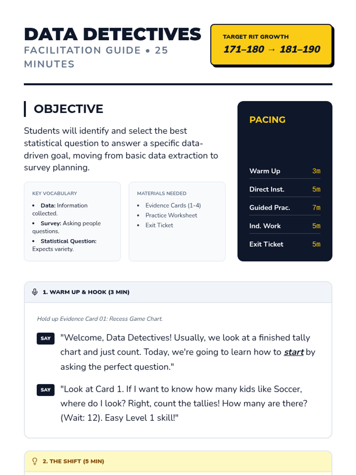 A 25-minute small group lesson designed to move students from RIT 171-180 to 181-190 by shifting from basic data interpretation to formulating and selecting effective statistical questions.