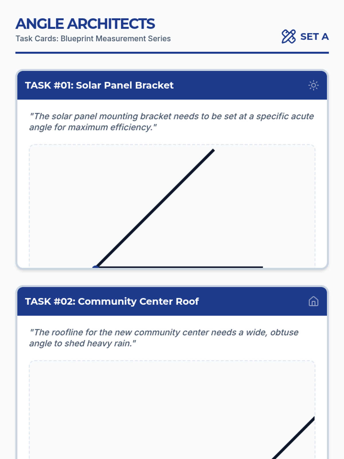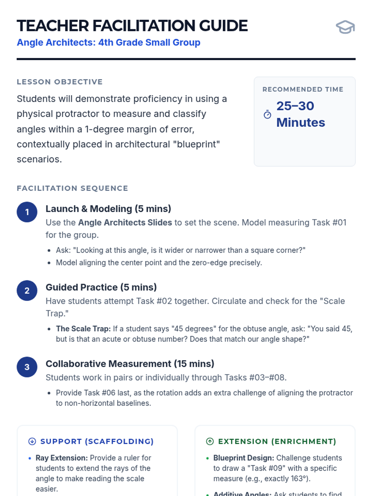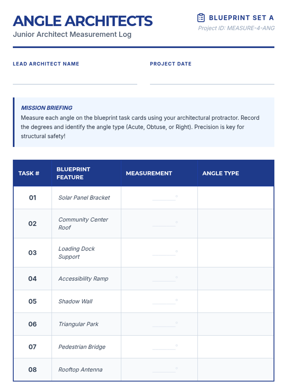A hands-on small group lesson where students use protractors to measure angles on blueprint-themed task cards, assuming the role of junior architects.