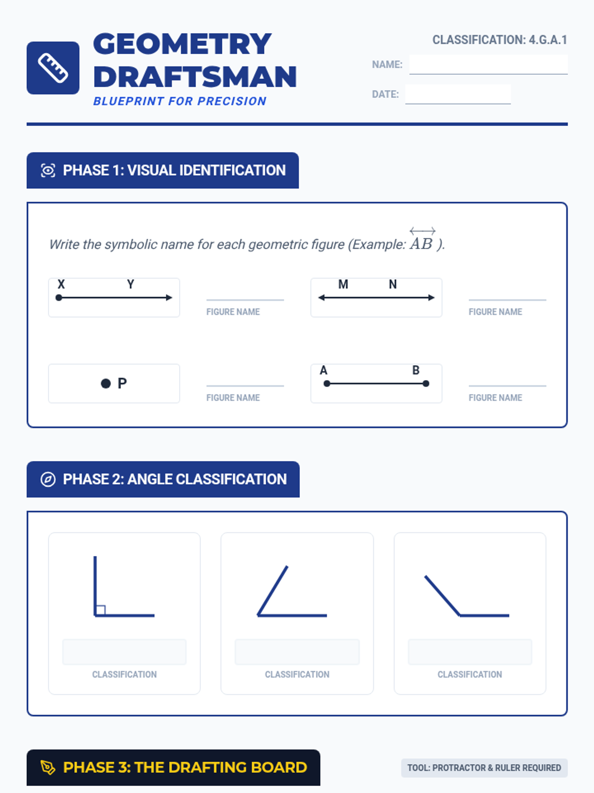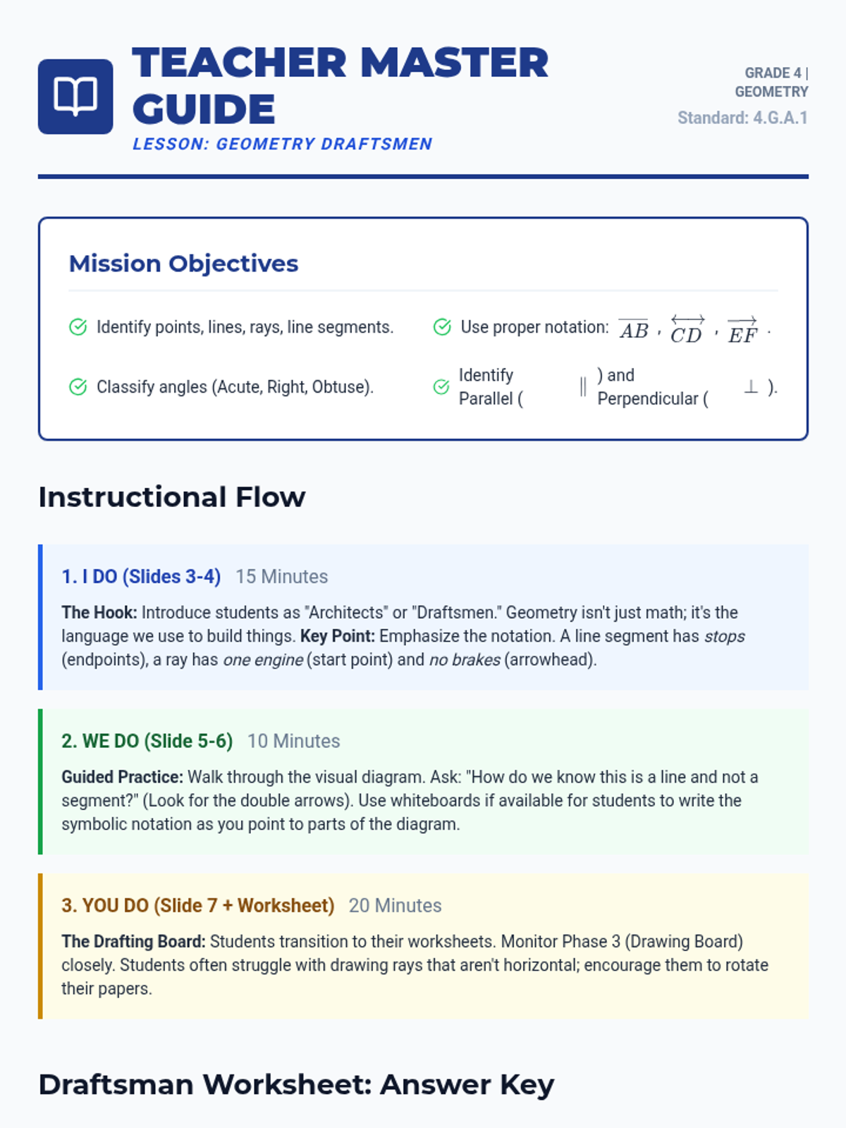 A comprehensive introduction to identifying, naming, and drawing fundamental geometric elements including points, lines, rays, and angles. Students will use the 'gradual release' model to master 4th-grade geometry standards.