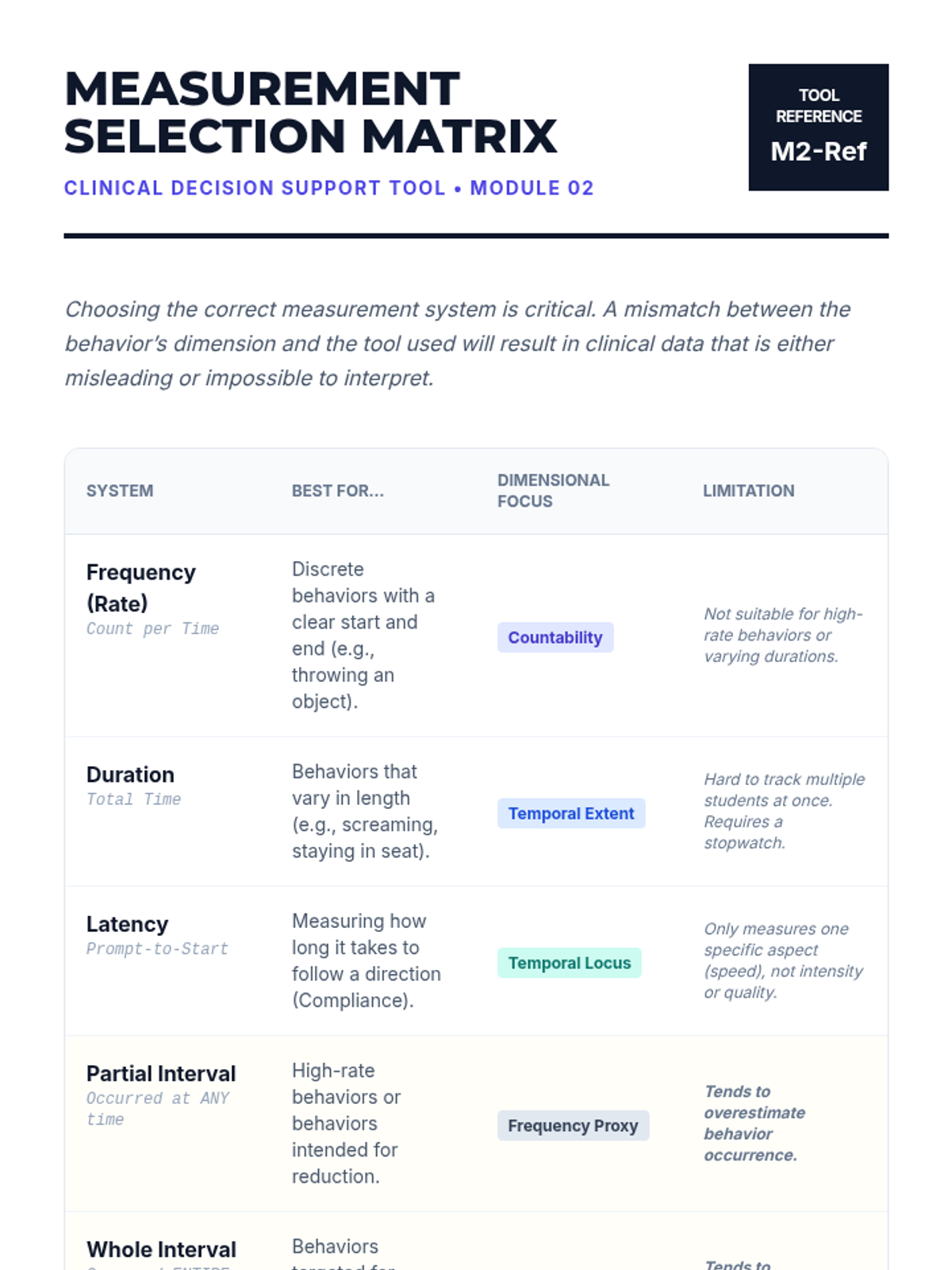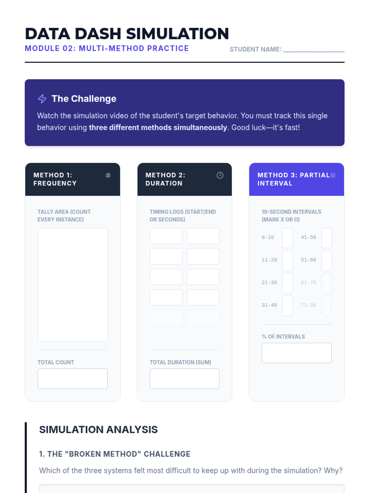 This lesson compares different data collection methods, including frequency, duration, latency, and interval recording. Students learn to match the measurement system to the dimension of the behavior being tracked.