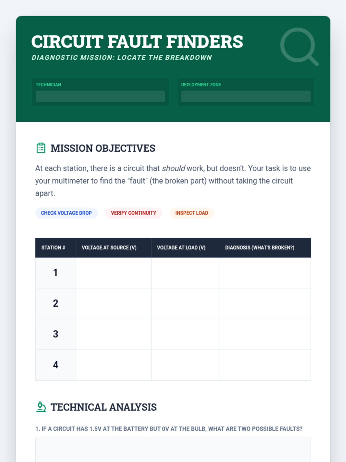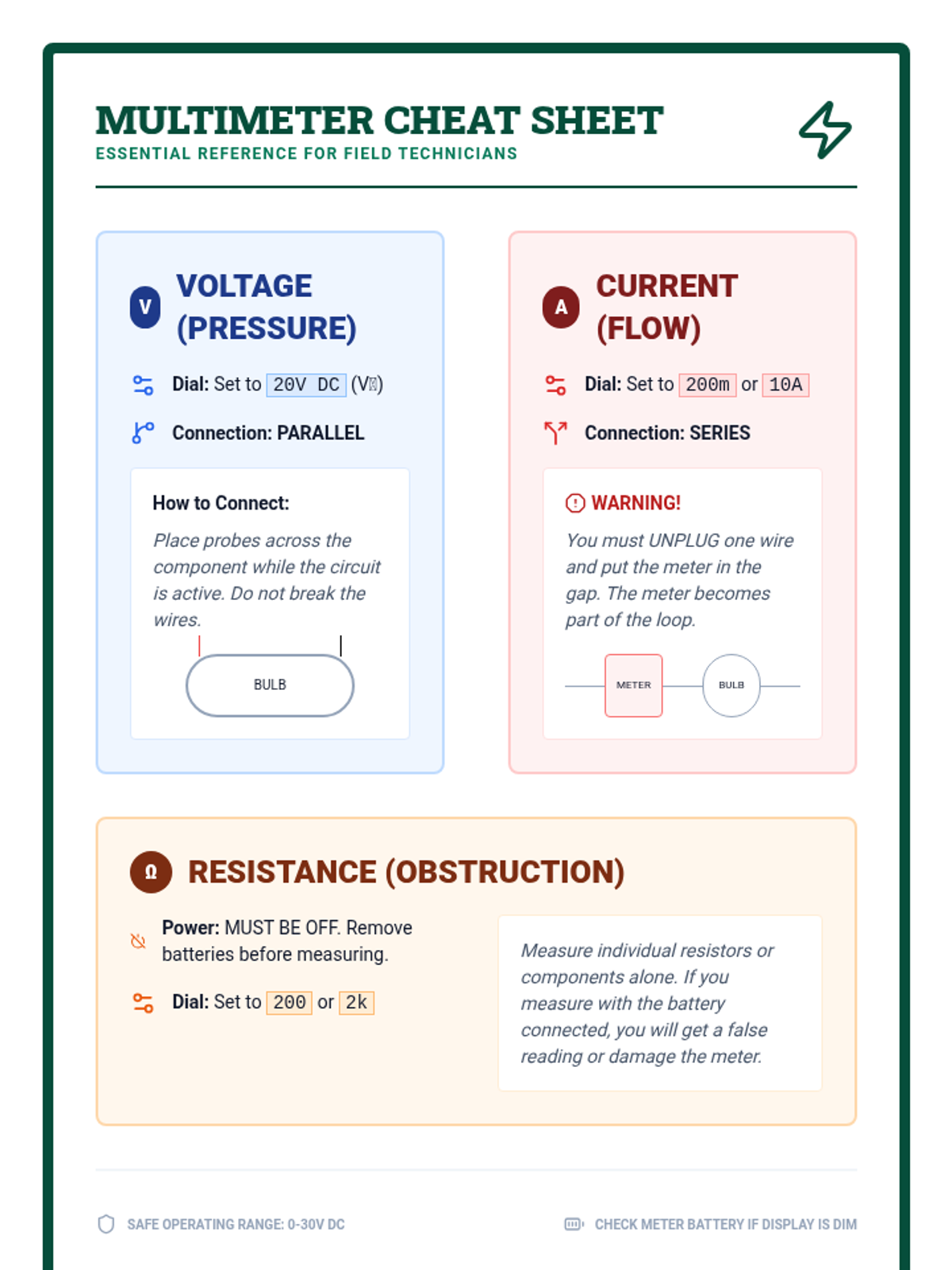 Technical training on digital multimeters. Students learn to measure voltage and current safely and correctly in series and parallel configurations.