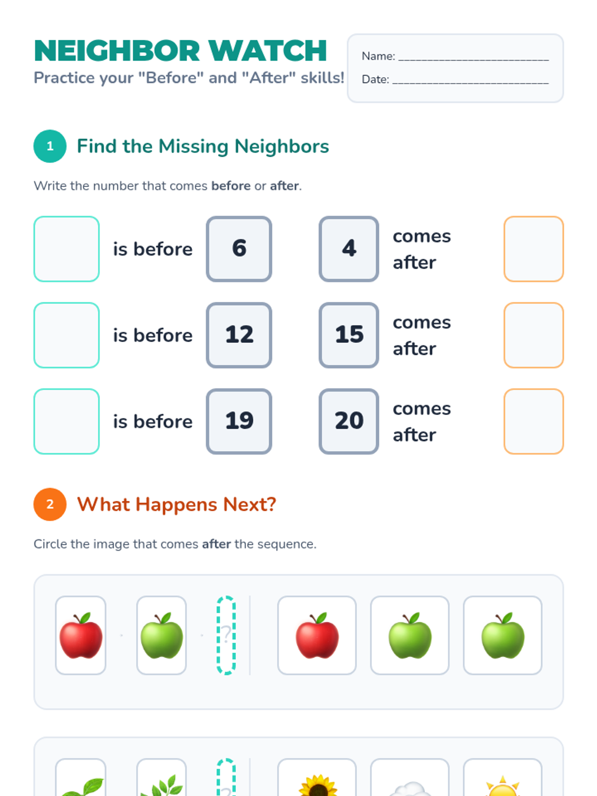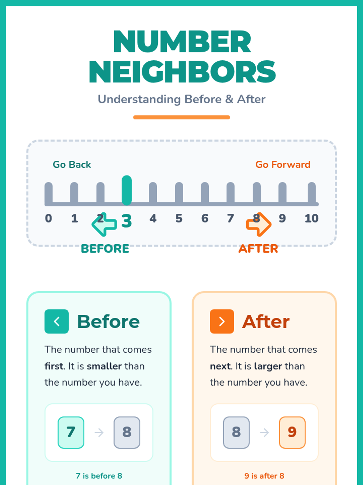 A foundational lesson exploring the temporal concepts of 'before' and 'after' using numbers and everyday sequences to build early math and logic skills.