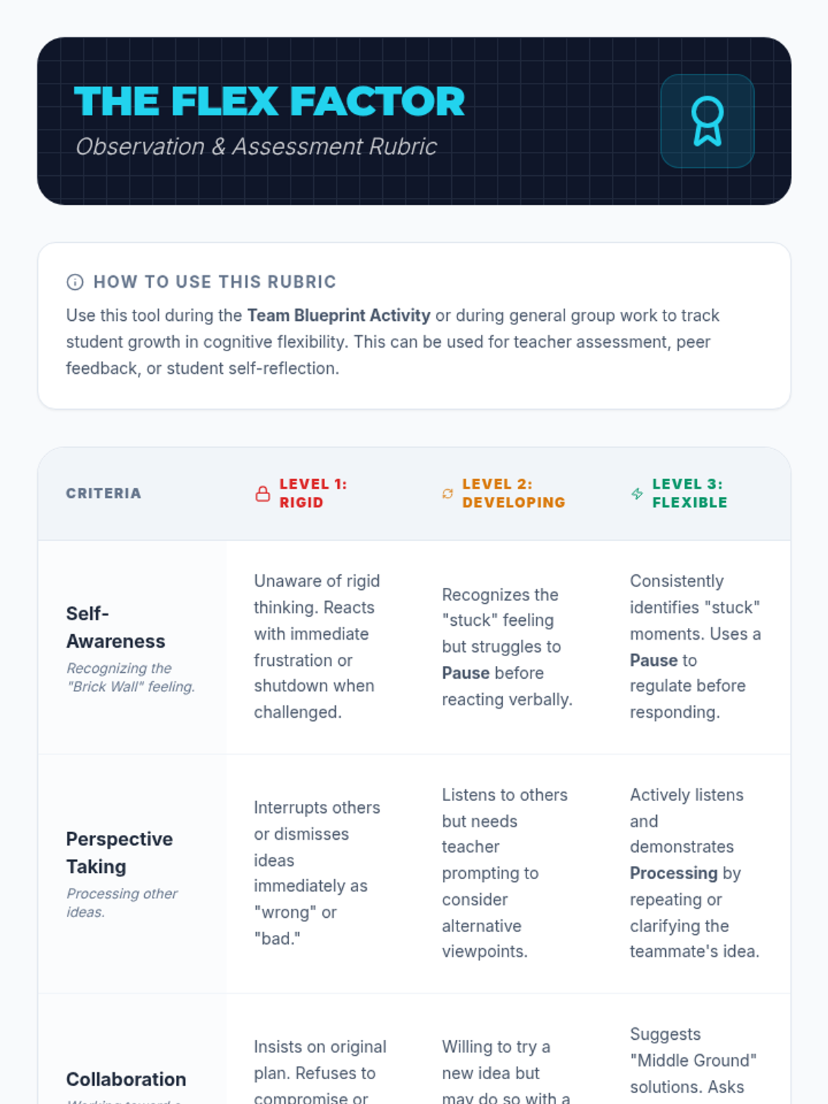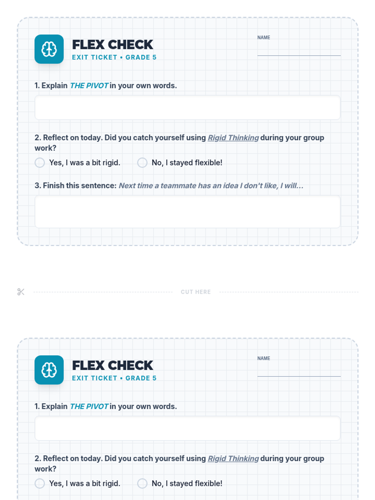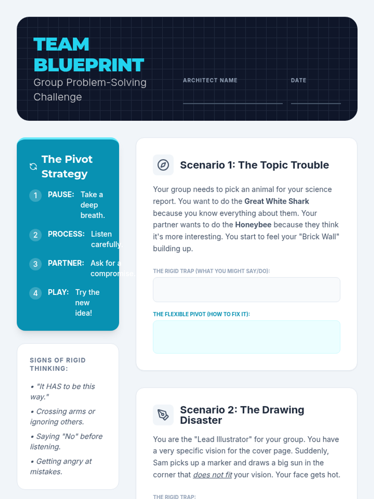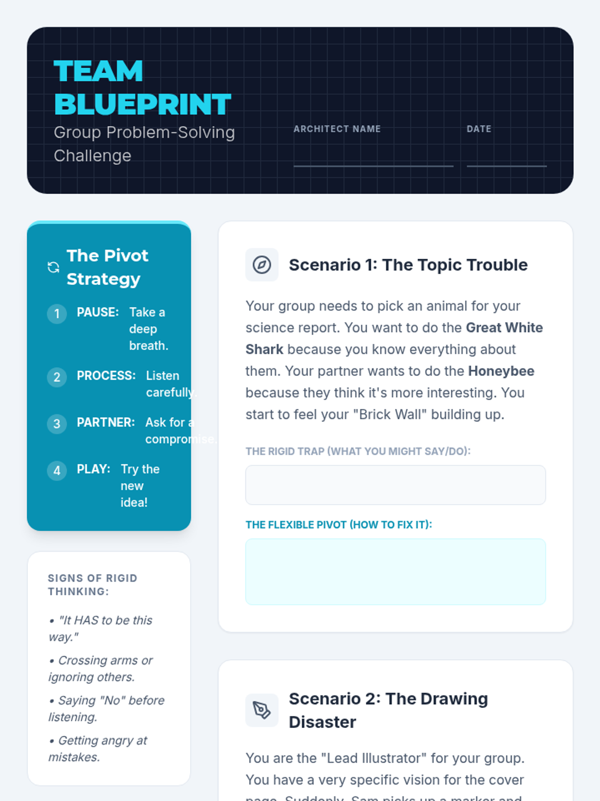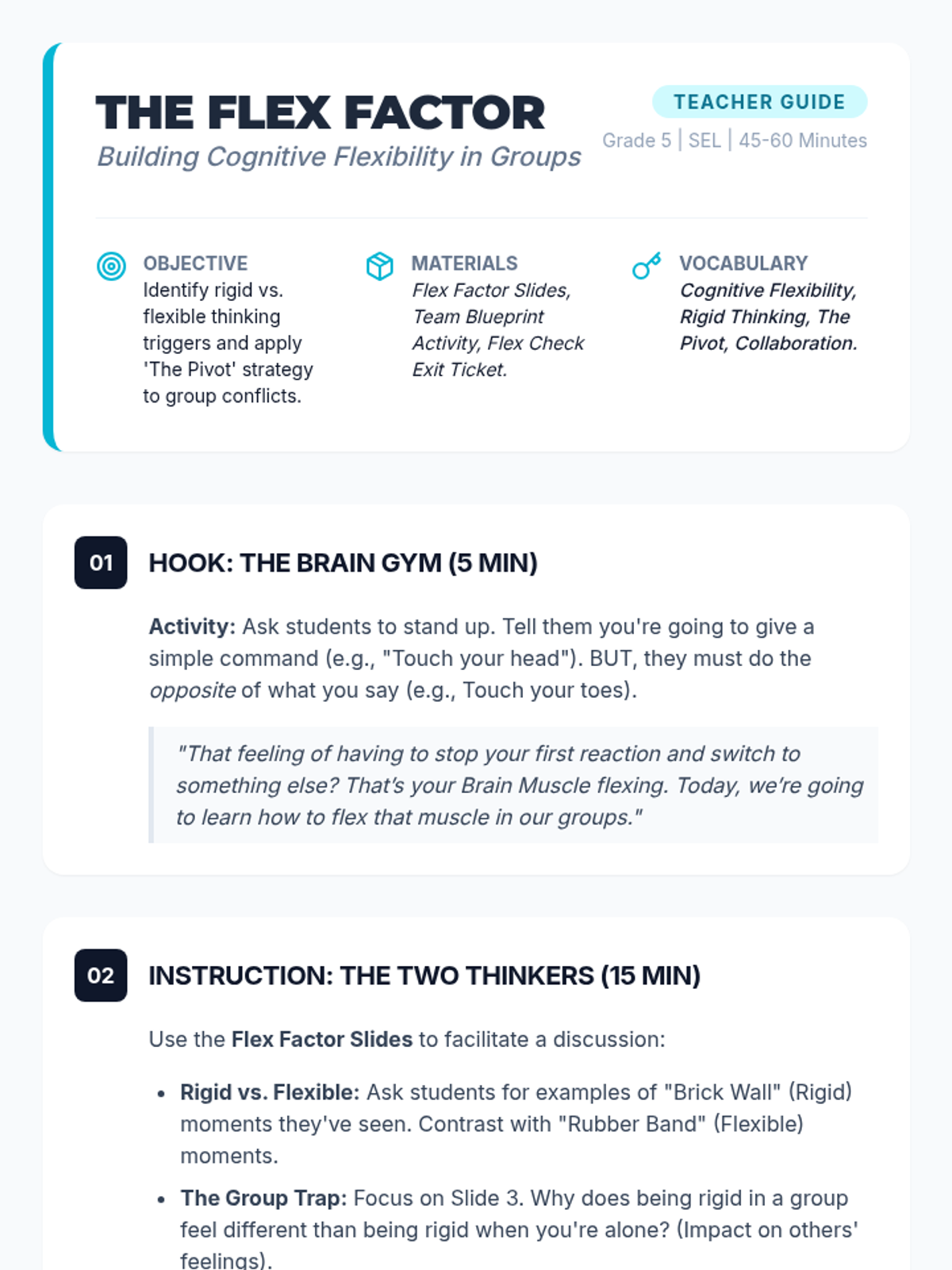 A social-emotional learning lesson for 5th graders focused on developing cognitive flexibility when working in groups. Students learn to identify rigid thinking and practice 'The Pivot' to find collaborative solutions.