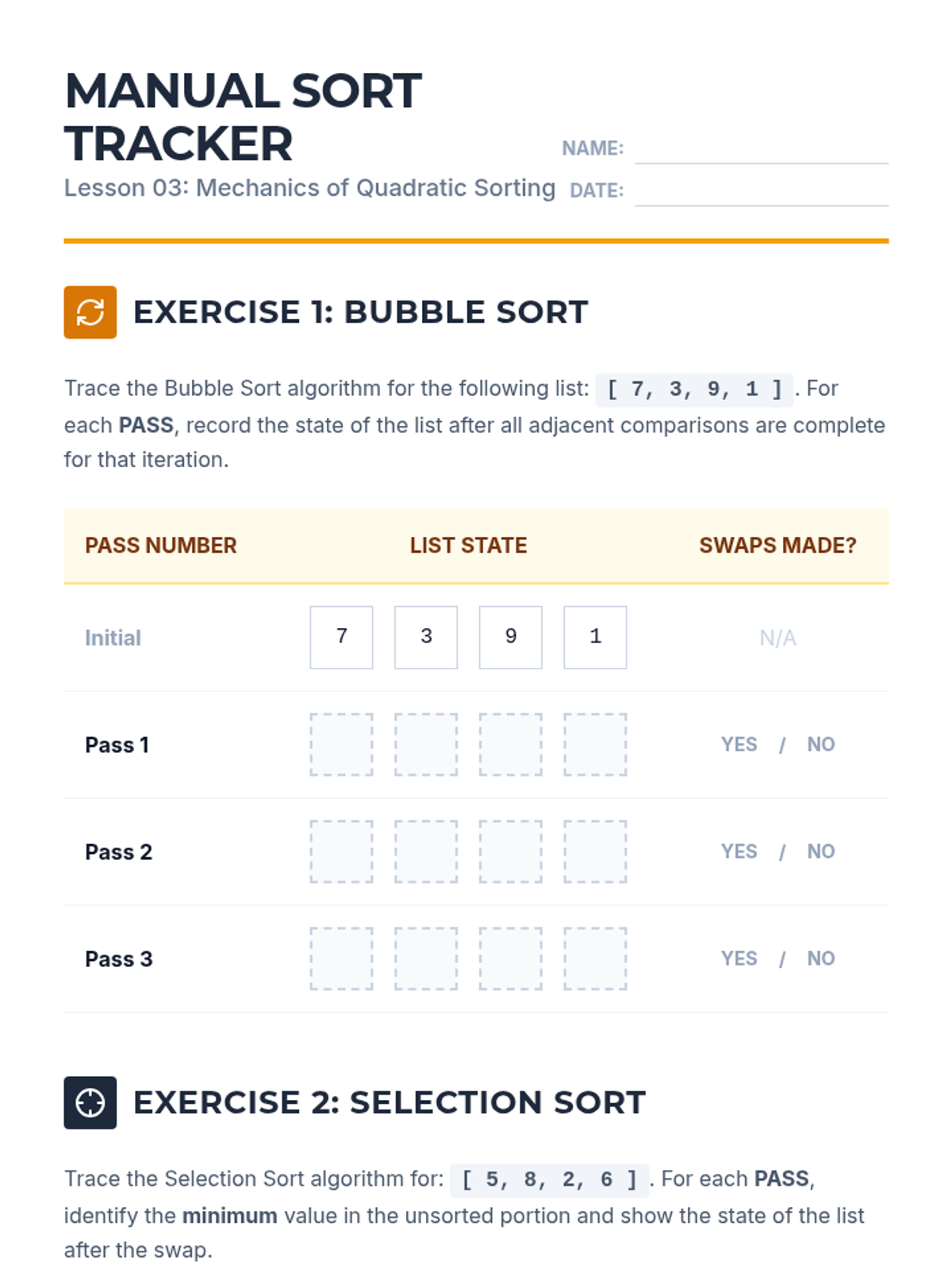 Focusing on Bubble Sort and Selection Sort, students manually step through these algorithms to understand nested loops, state changes, and data swapping.