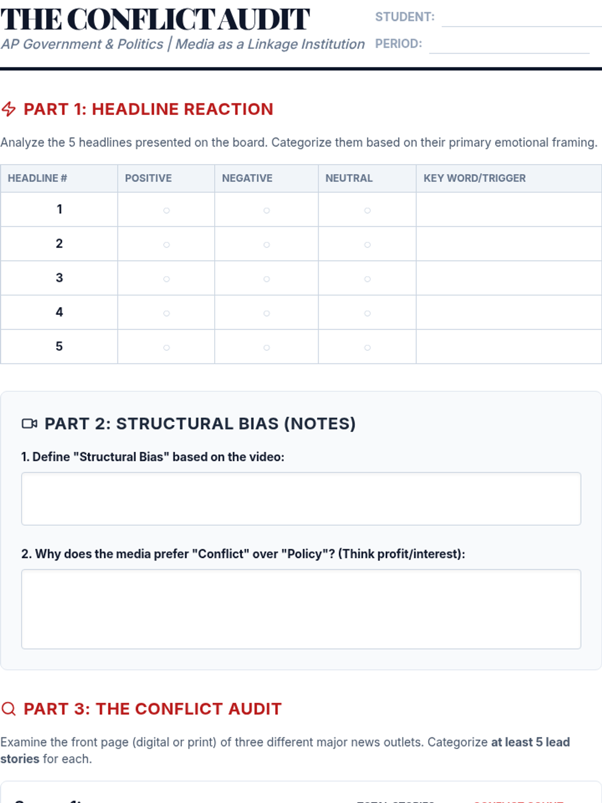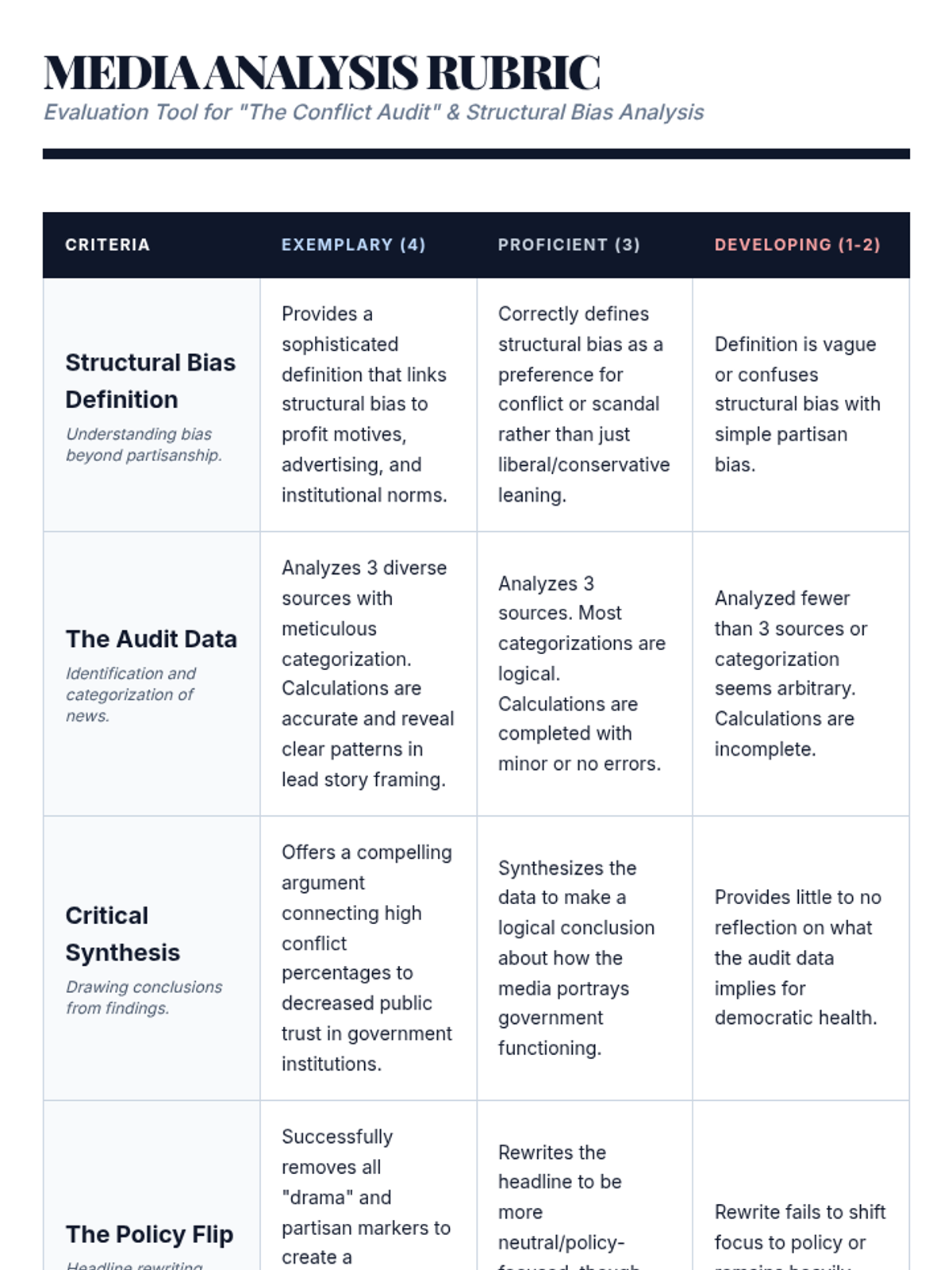 Students will investigate structural bias in the media, specifically focusing on how the drive for profit and engagement leads to a preference for conflict and scandal over policy and compromise. They will conduct a real-world audit of major news outlets to quantify this bias and practice reframing news through a policy-oriented lens.