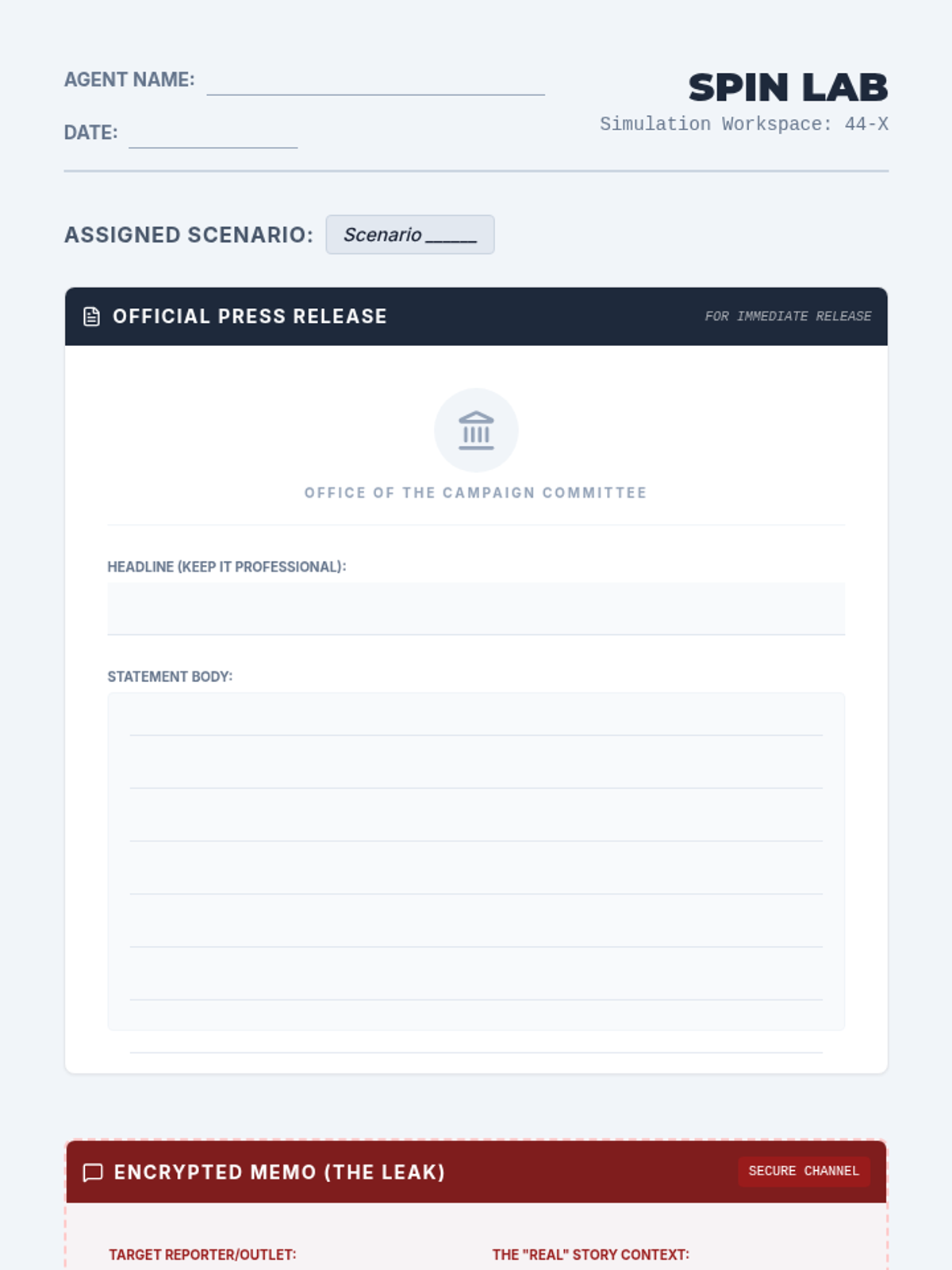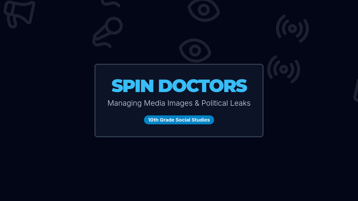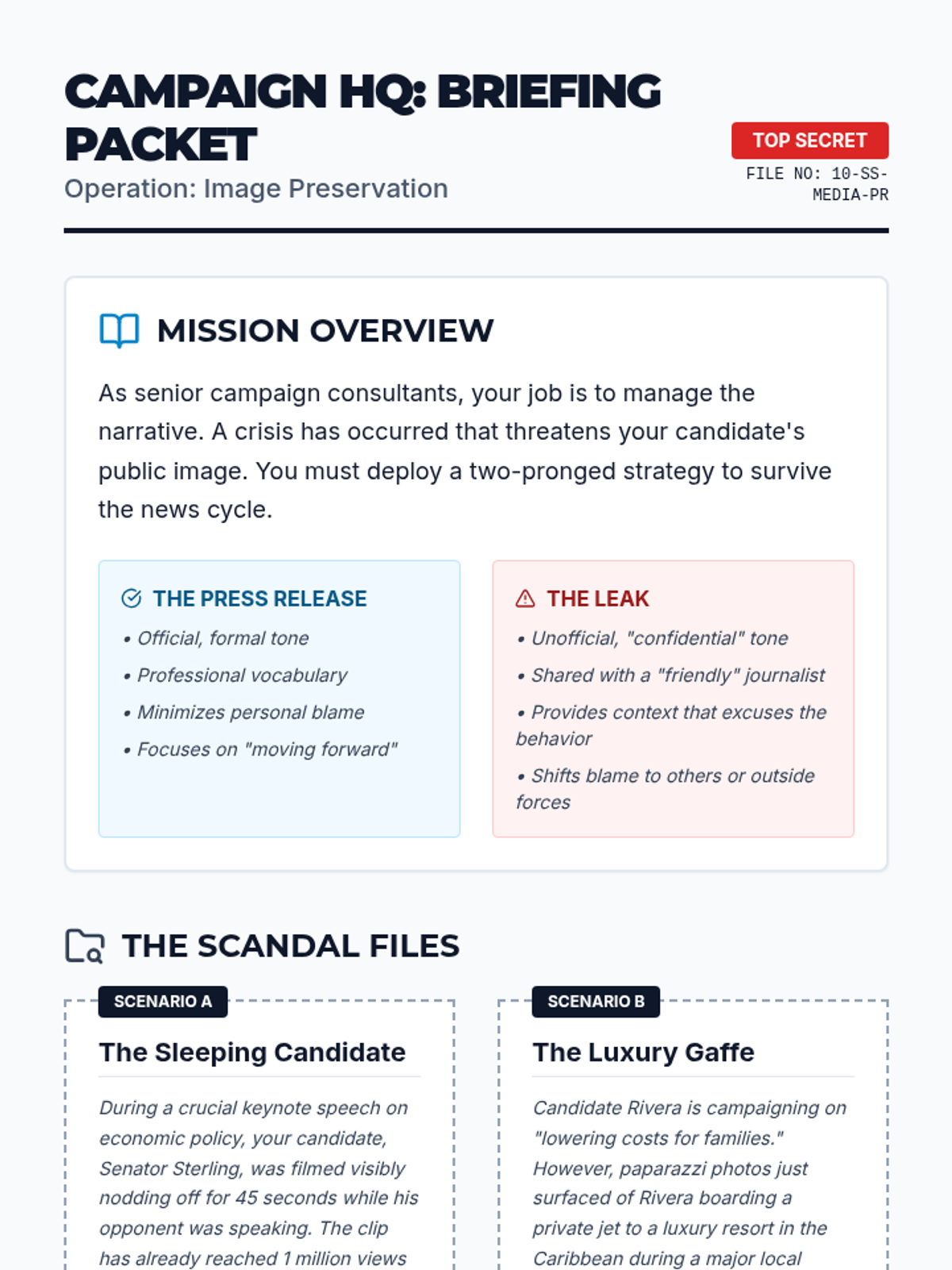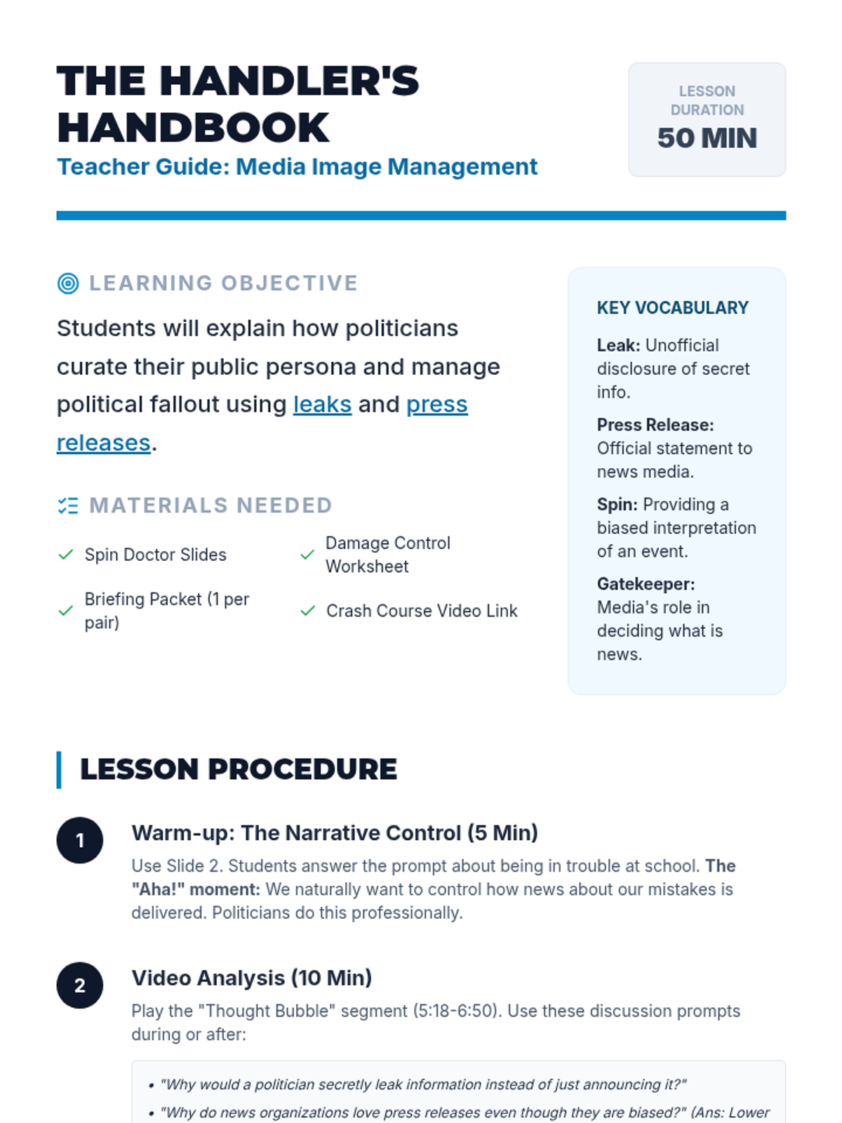A high-energy 10th-grade lesson exploring how politicians use leaks and press releases to curate their public image, featuring a 'Spin Doctor' simulation where students manage political scandals.