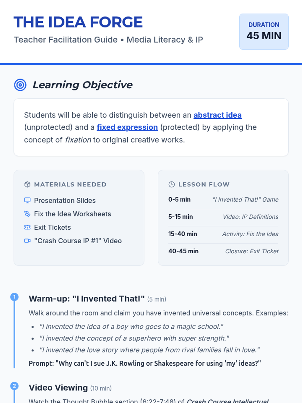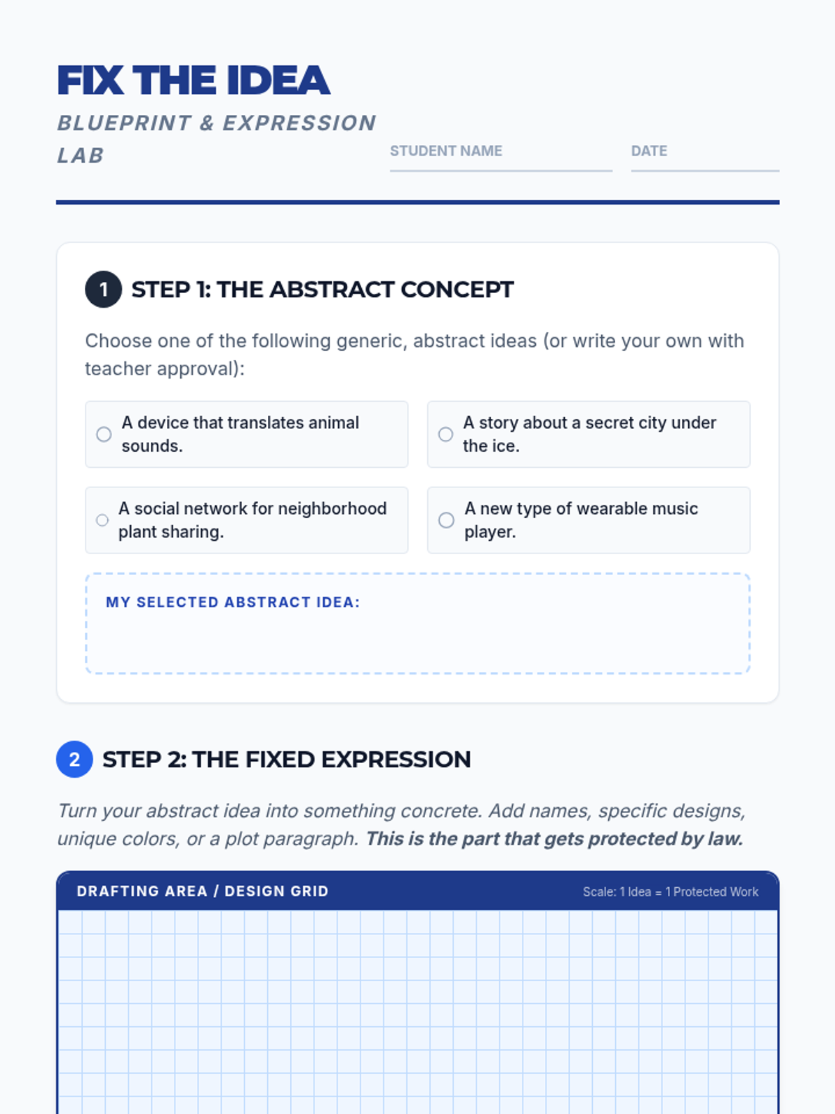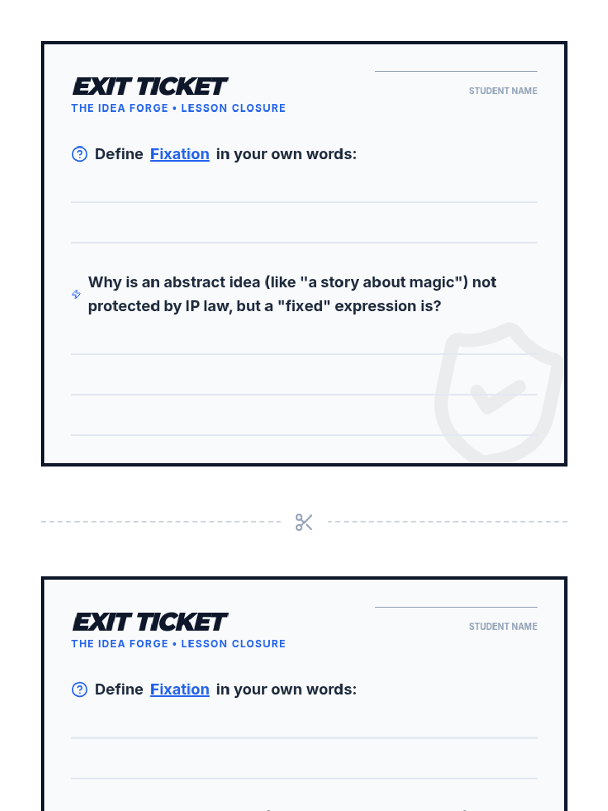 A lesson exploring the boundary between abstract ideas and protected expression, focusing on the legal requirement of 'fixation' in intellectual property.