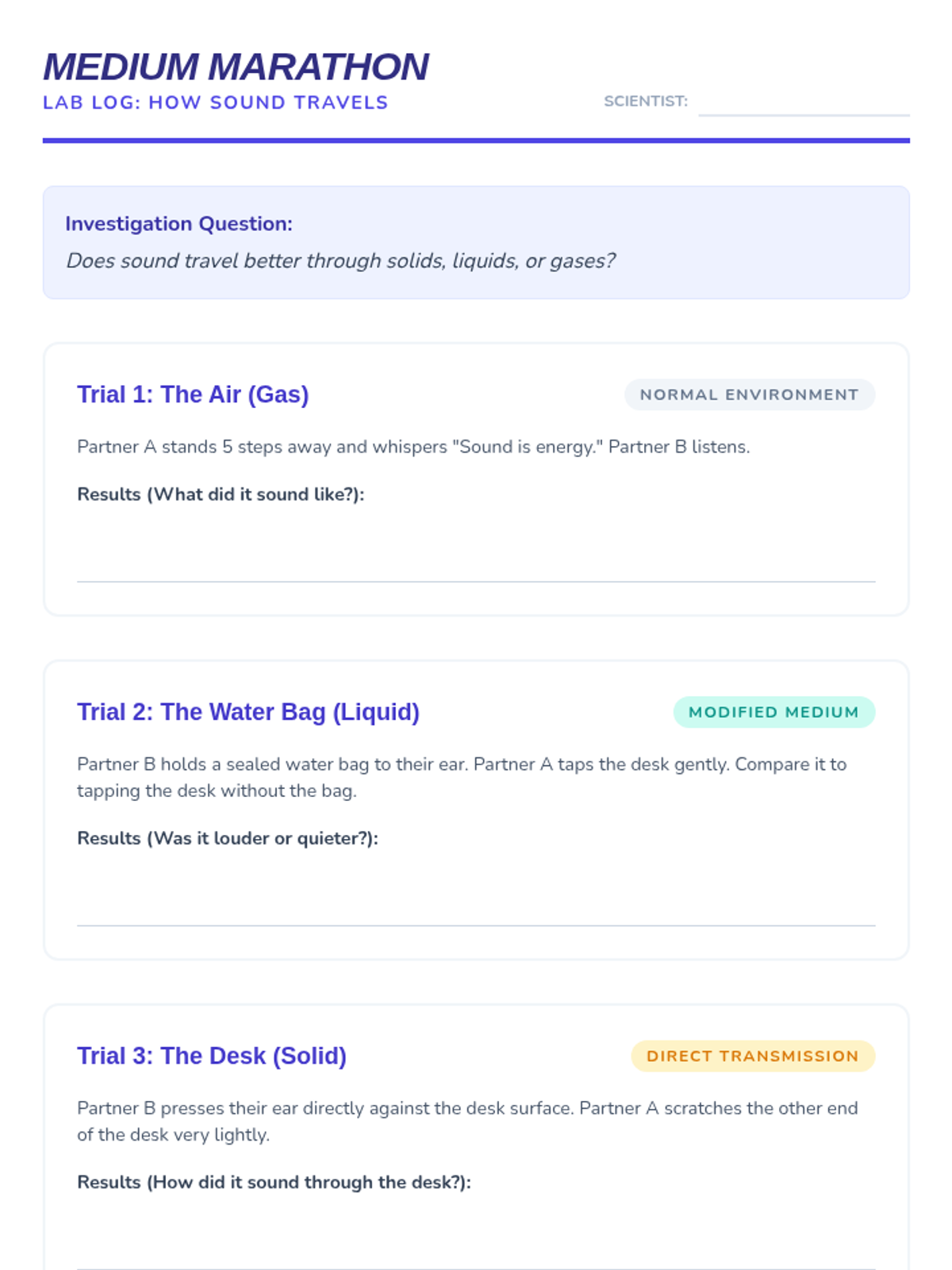 Learners conduct experiments to hear sounds through solids, liquids, and air, comparing how different media affect sound transmission.