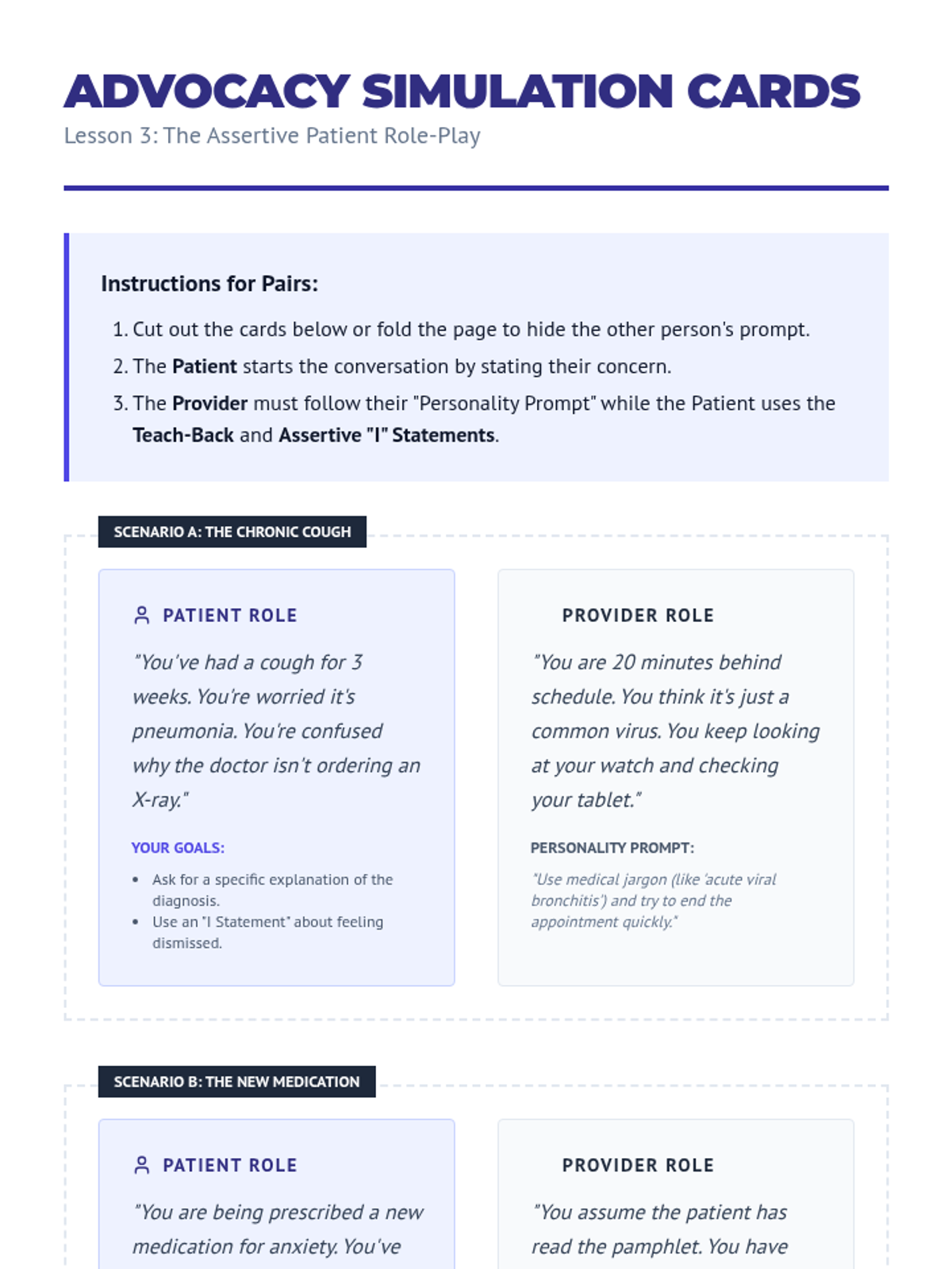 Teaches communication frameworks like the 'Teach-Back' method and assertive 'I' statements to ensure student voices are heard in medical consultations.