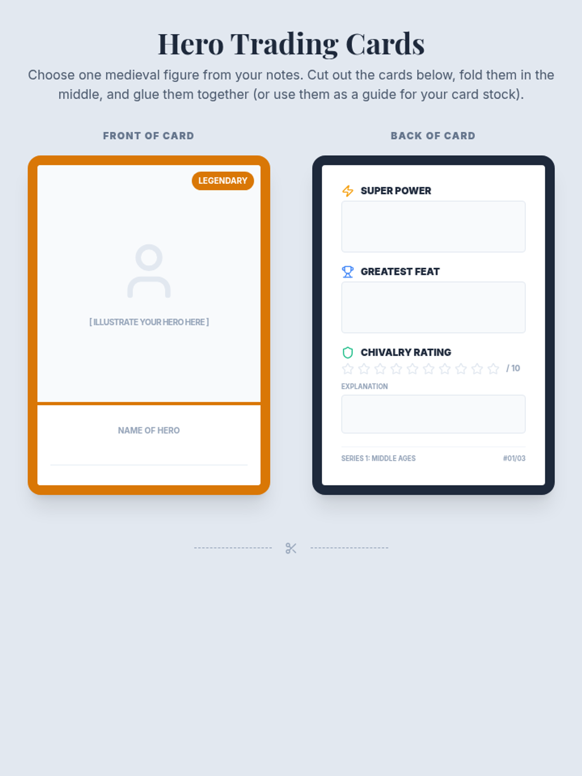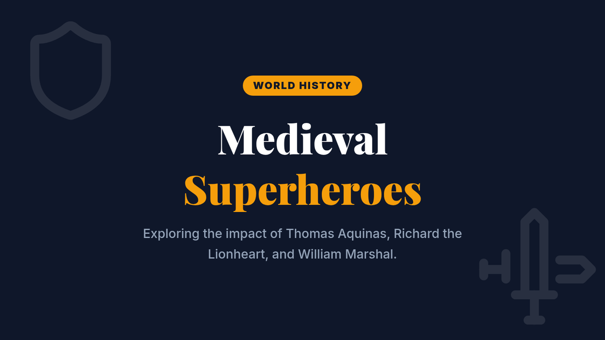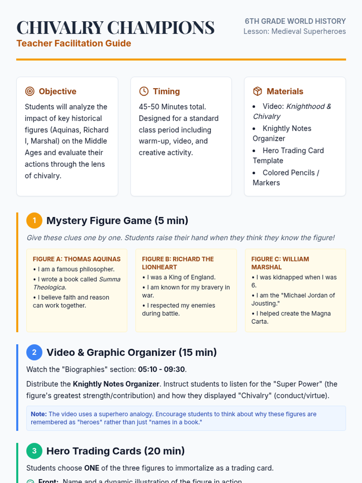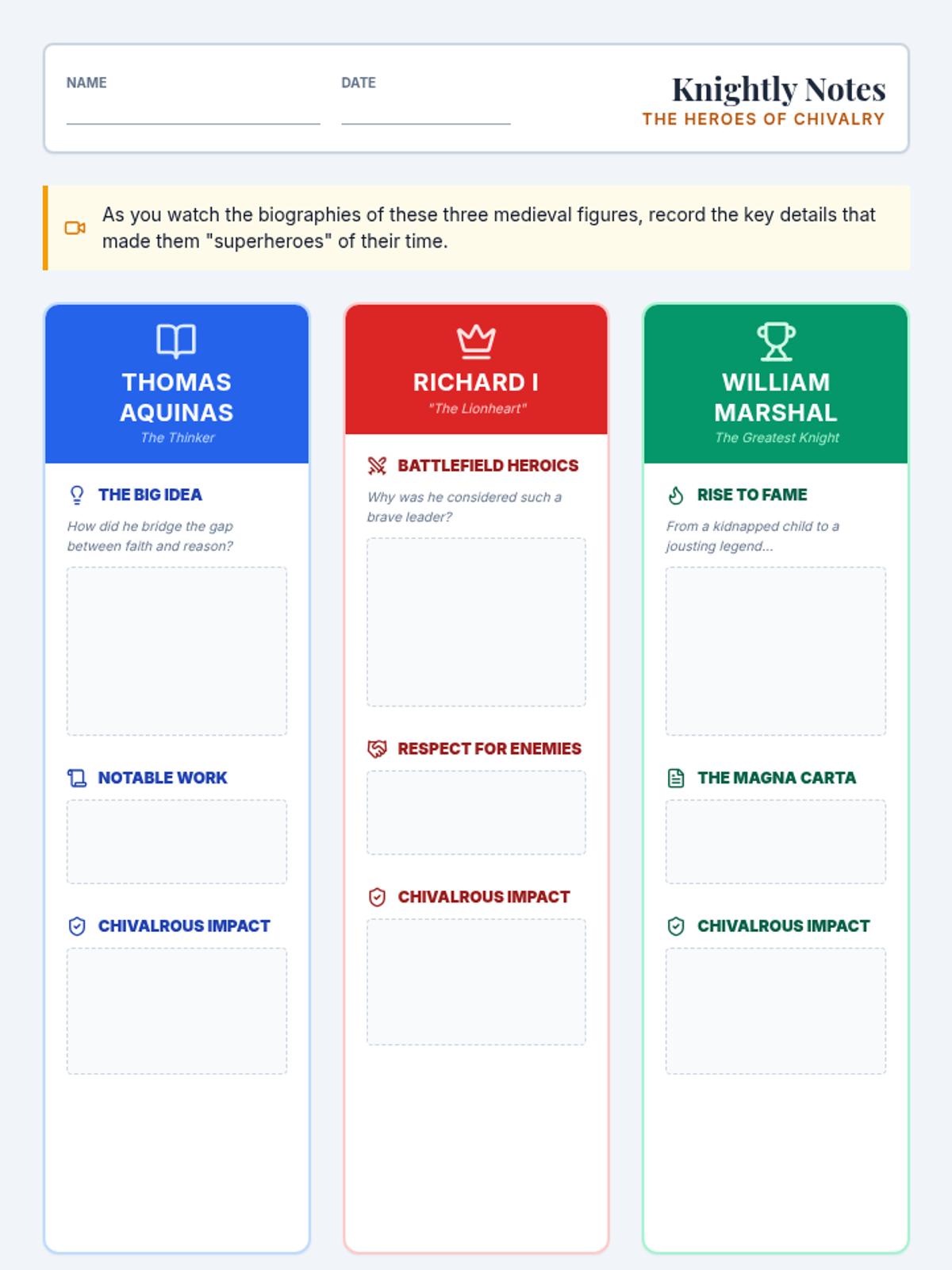 A lesson exploring the impact of Thomas Aquinas, Richard the Lionheart, and William Marshal on the Middle Ages, using a 'superhero' lens to analyze chivalry and leadership. Students use a tri-fold organizer for notes and create 'Hero Trading Cards' to synthesize their learning.
