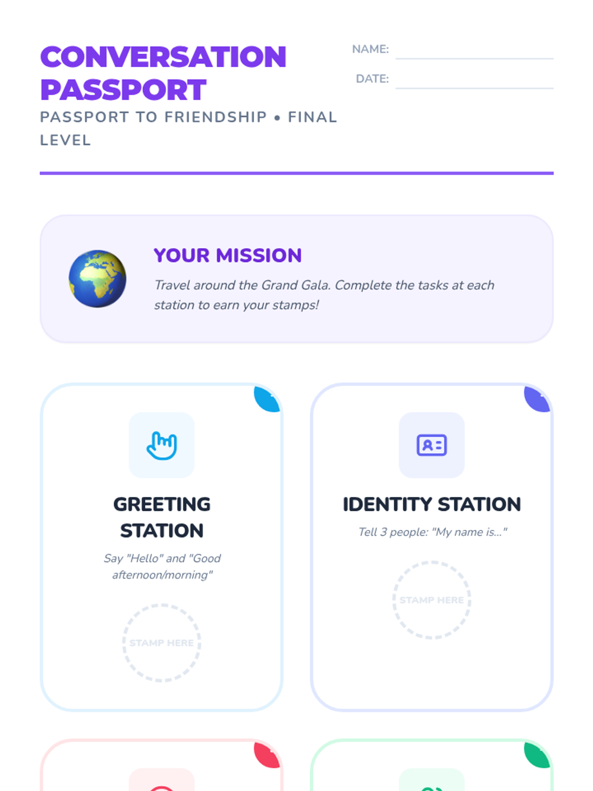 In this culminating lesson, students combine all skills—greeting, name exchange, introducing a friend, and asking about feelings—in a simulated party environment. Students rotate through stations to have complete mini-conversations.