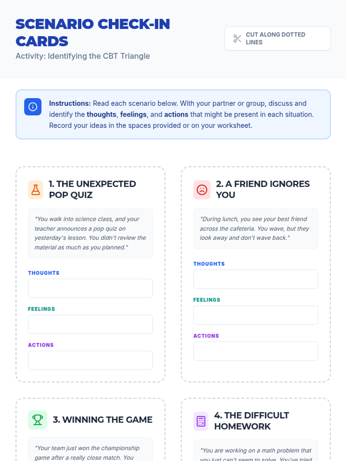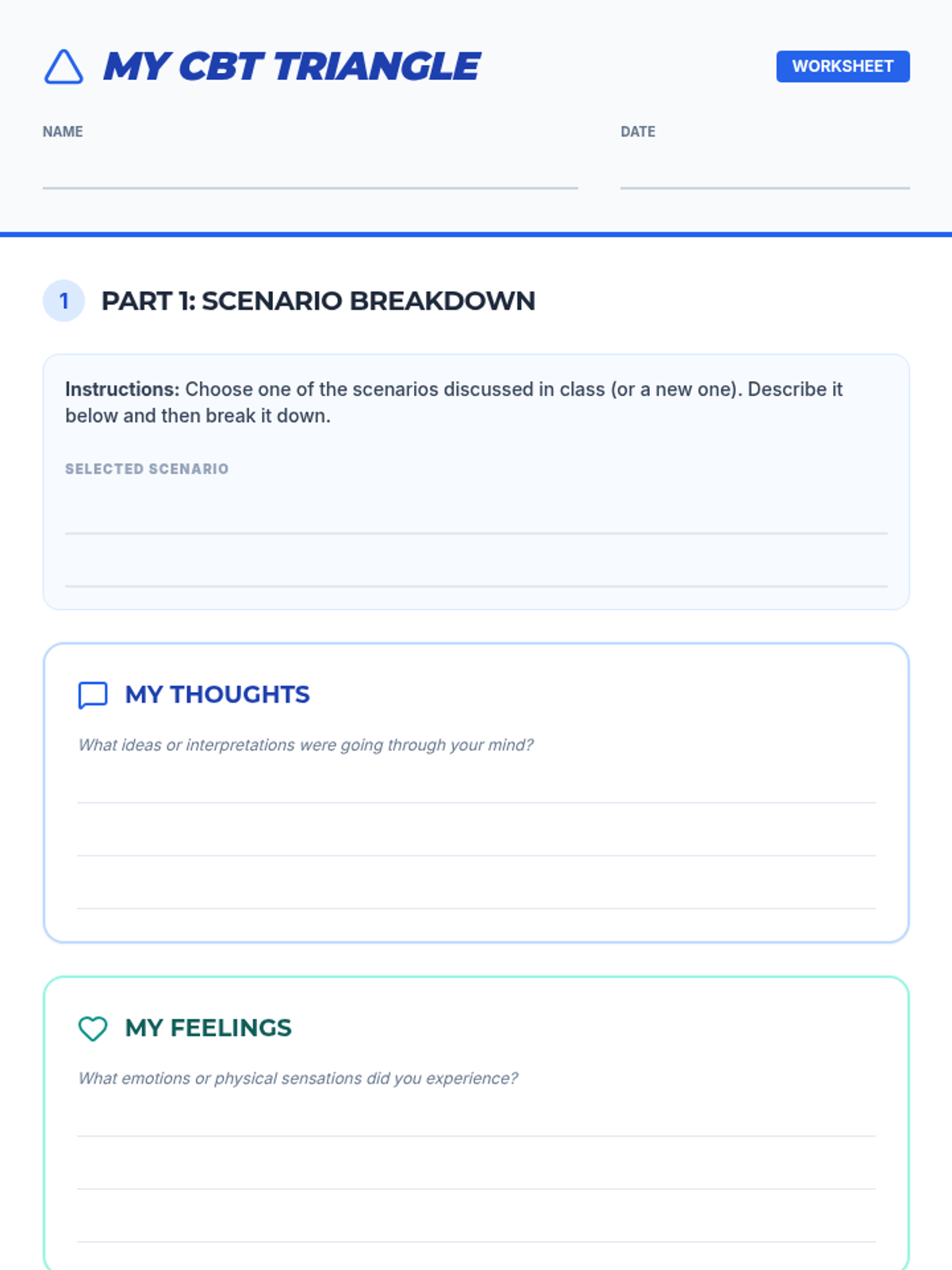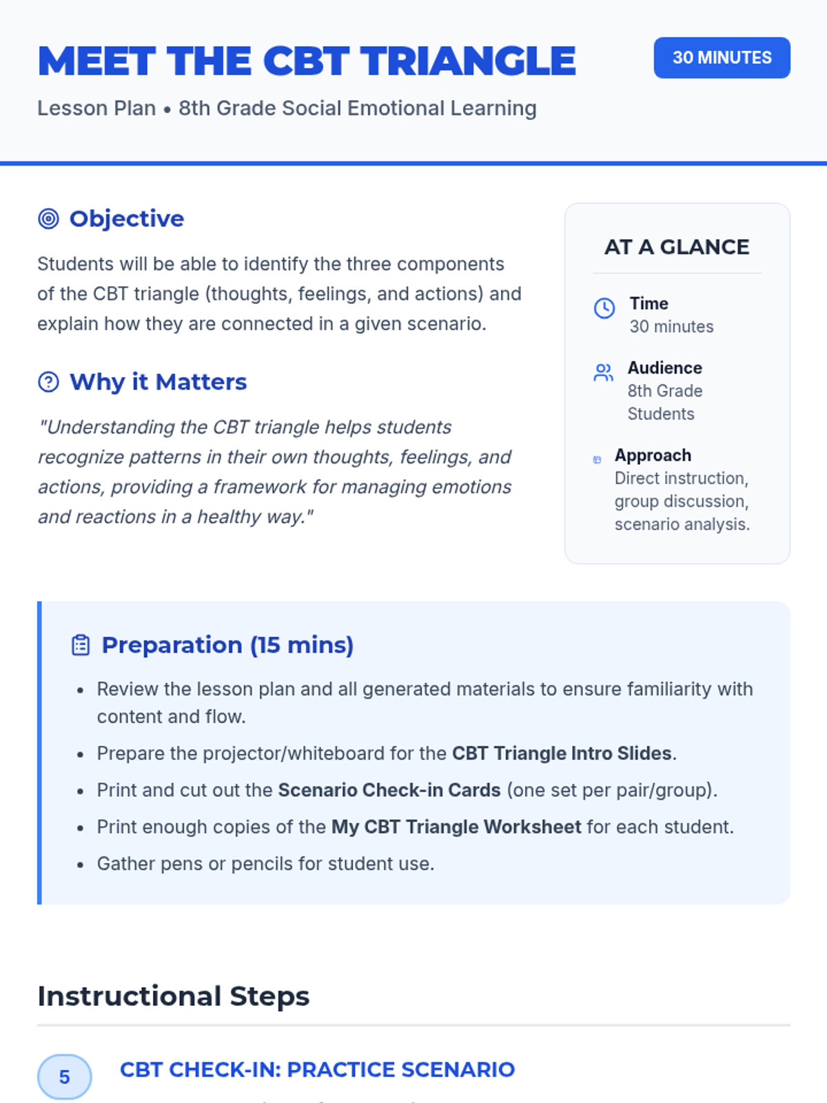 An introductory lesson for 8th-grade students on the Cognitive Behavioral Therapy (CBT) Triangle, exploring the interconnectedness of thoughts, feelings, and actions.