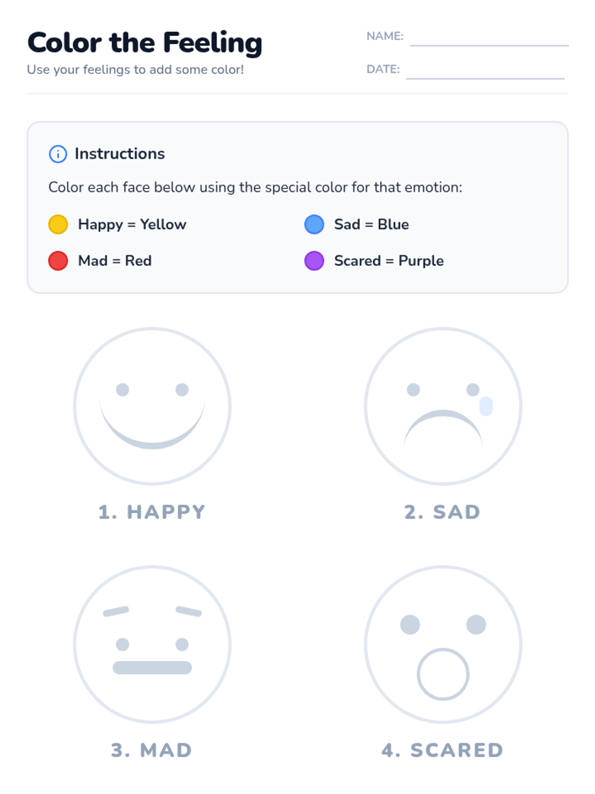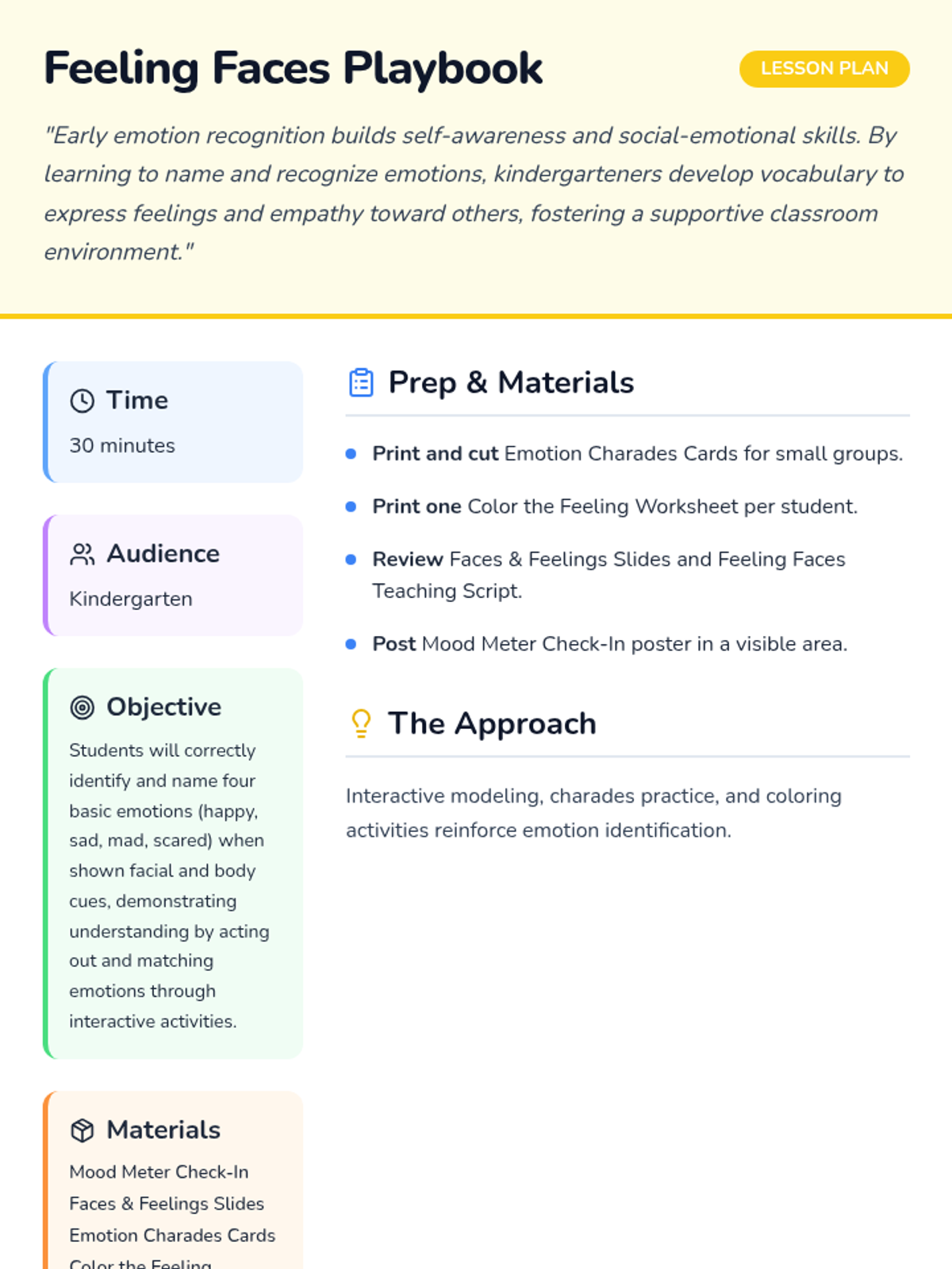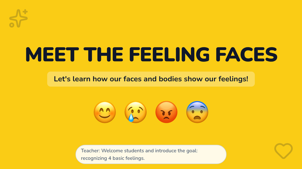 In this 30-minute kindergarten lesson, students will learn to recognize and name four basic emotions—happy, sad, mad, and scared—through facial and body cues. By building self-awareness and emotion vocabulary, students gain tools for understanding their own feelings and those of others, strengthening social-emotional skills early on.