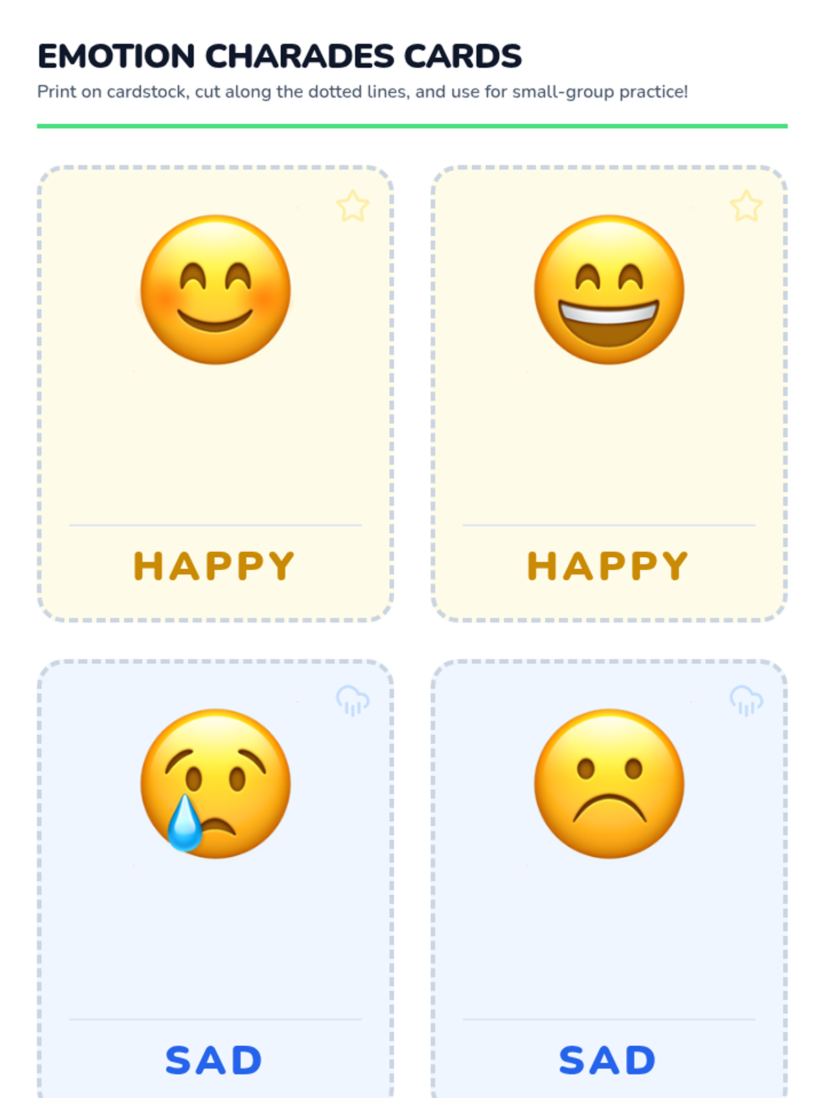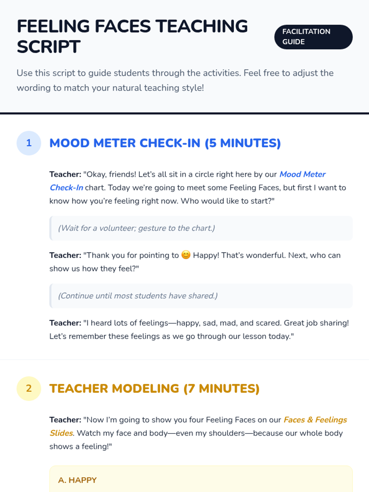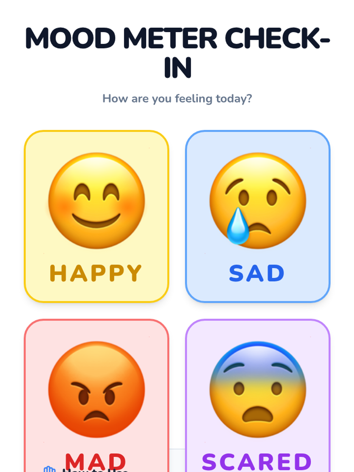 In this 30-minute kindergarten lesson, students will learn to recognize and name four basic emotions—happy, sad, mad, and scared—through facial and body cues. By building self-awareness and emotion vocabulary, students gain tools for understanding their own feelings and those of others, strengthening social-emotional skills early on.
