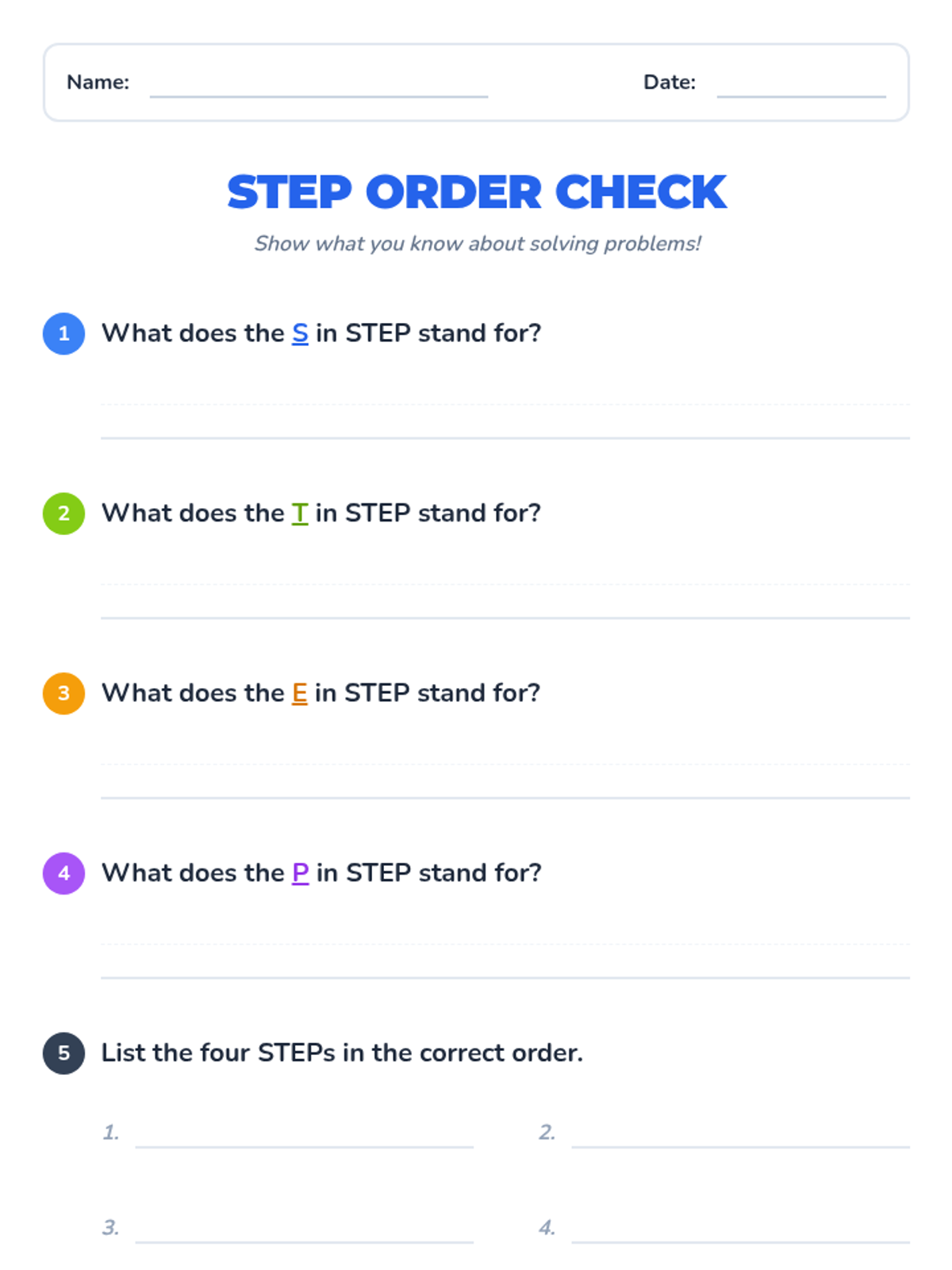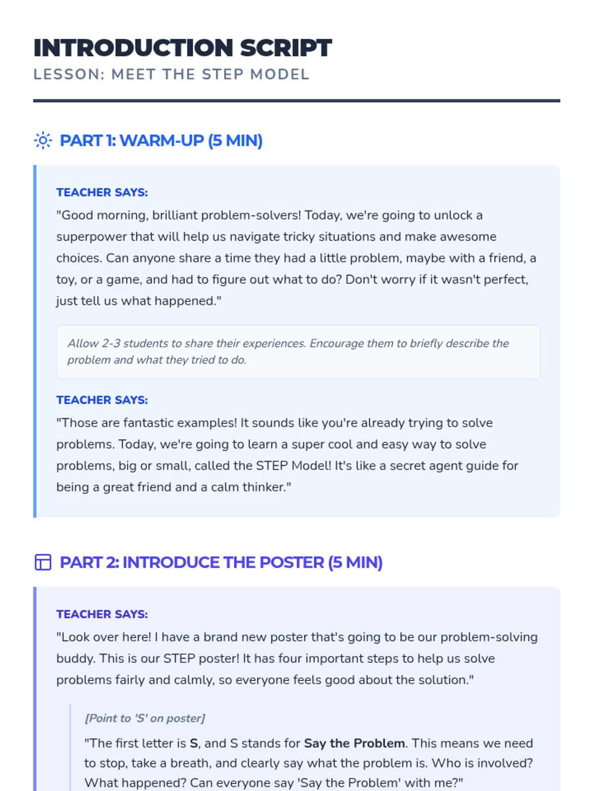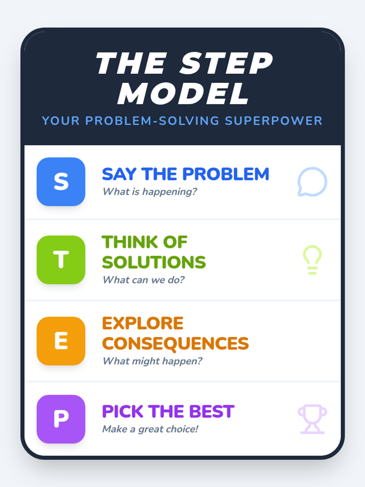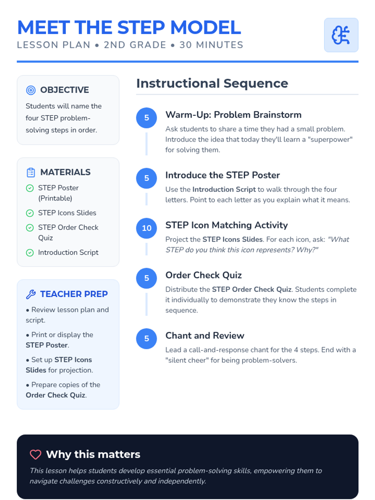 This lesson introduces 2nd-grade students to the STEP problem-solving model (Say the problem, Think of solutions, Explore consequences, Pick the best) through interactive discussion, visual icons, and a retrieval quiz.