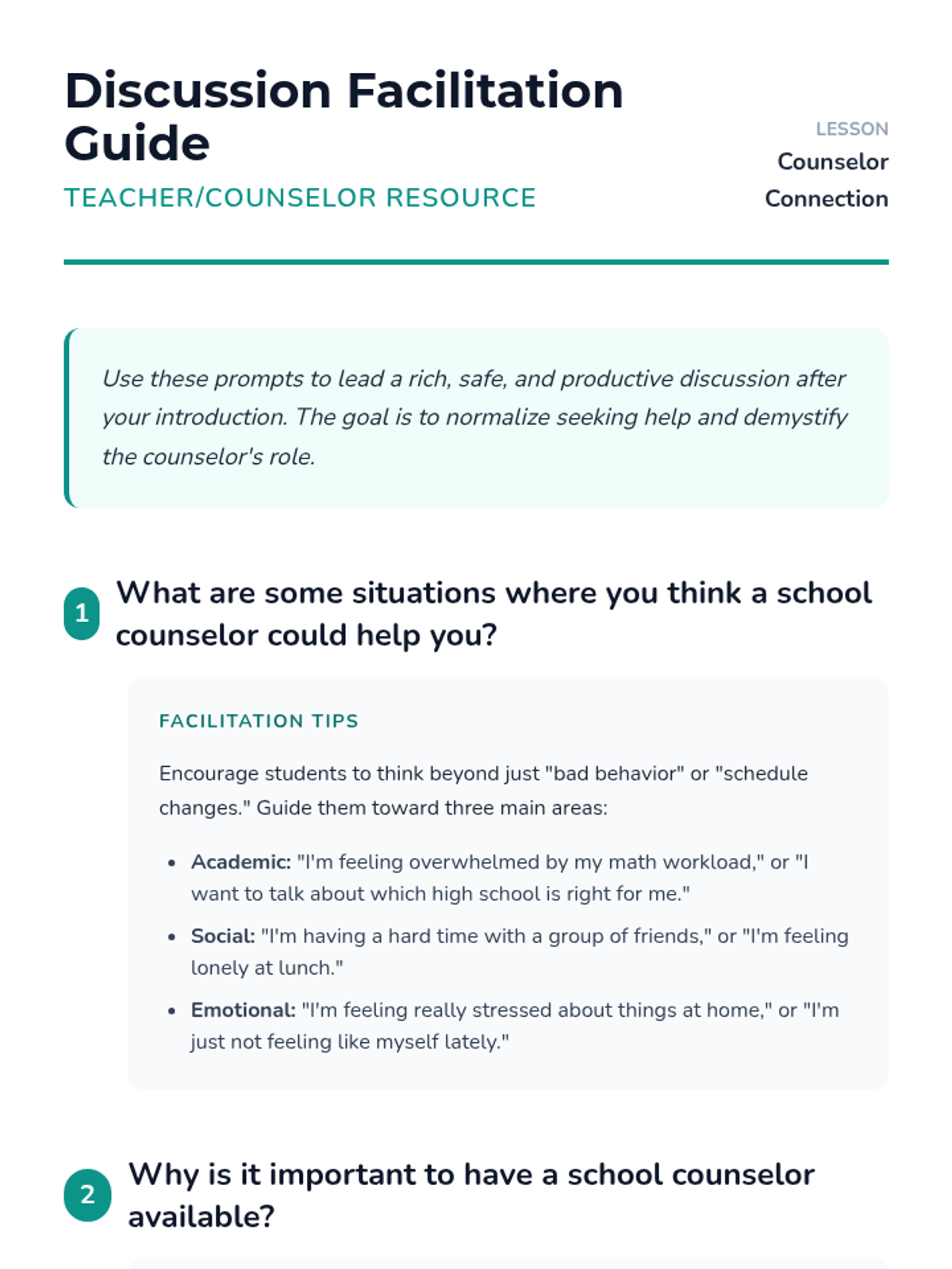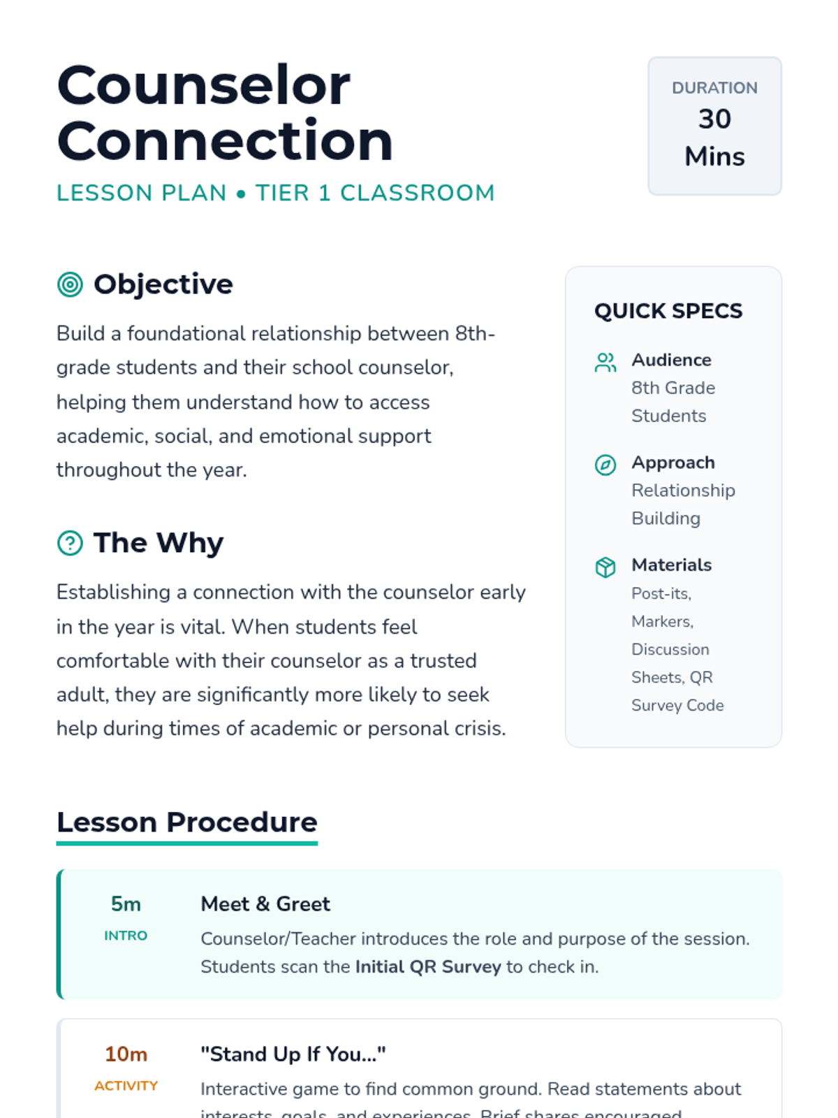 An introductory session for 8th graders to meet their school counselor, understand their role, and build a foundation for support throughout the school year.