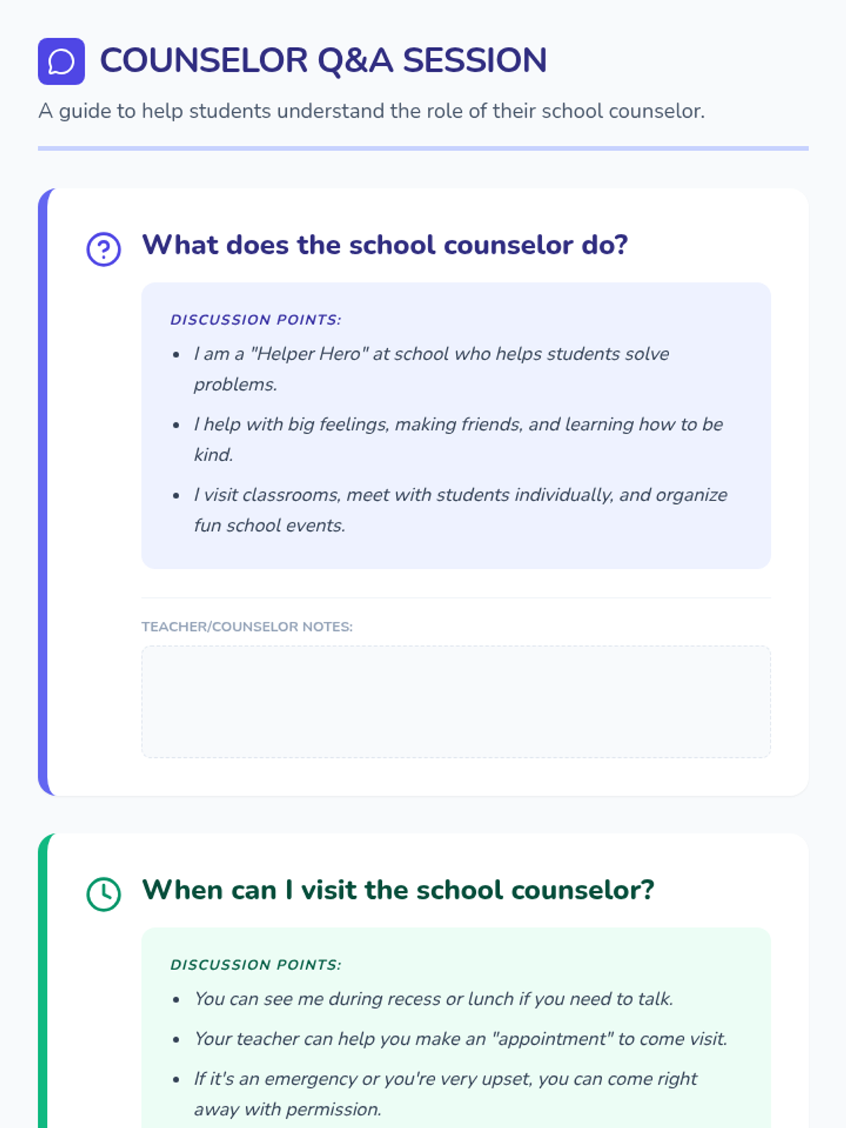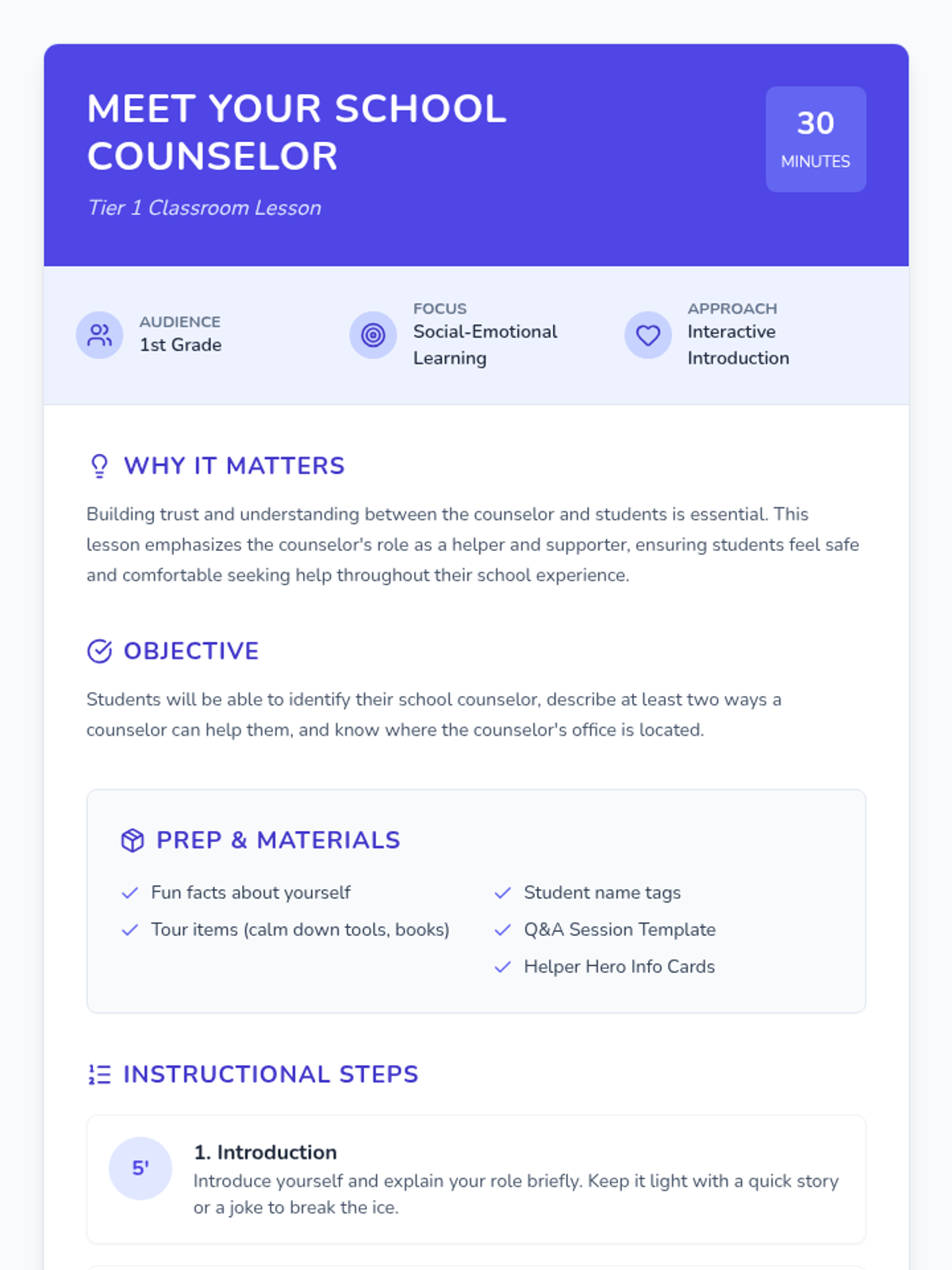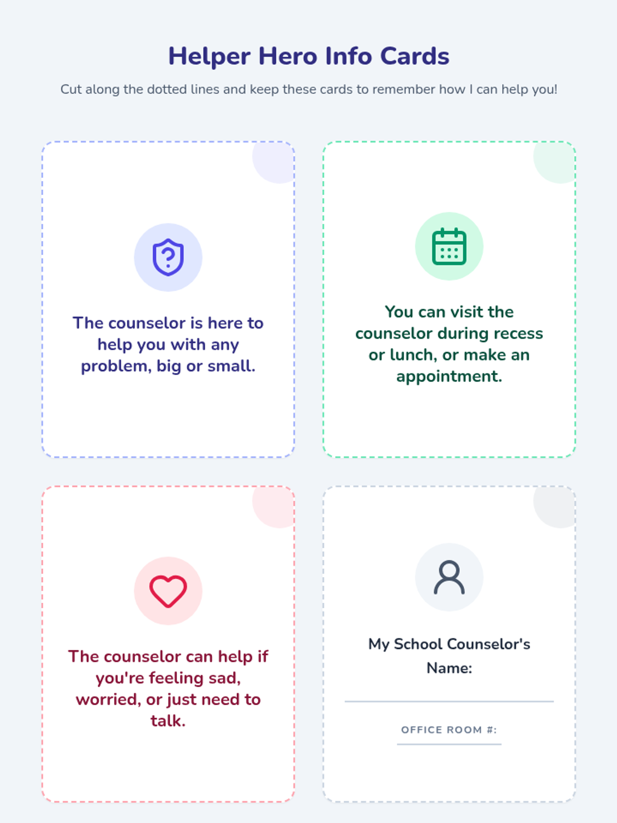 An introductory lesson for 1st-grade students to meet their school counselor, understand their role, and explore the counselor's office. This session builds trust and establishes the counselor as a supportive 'helper hero' in the school.