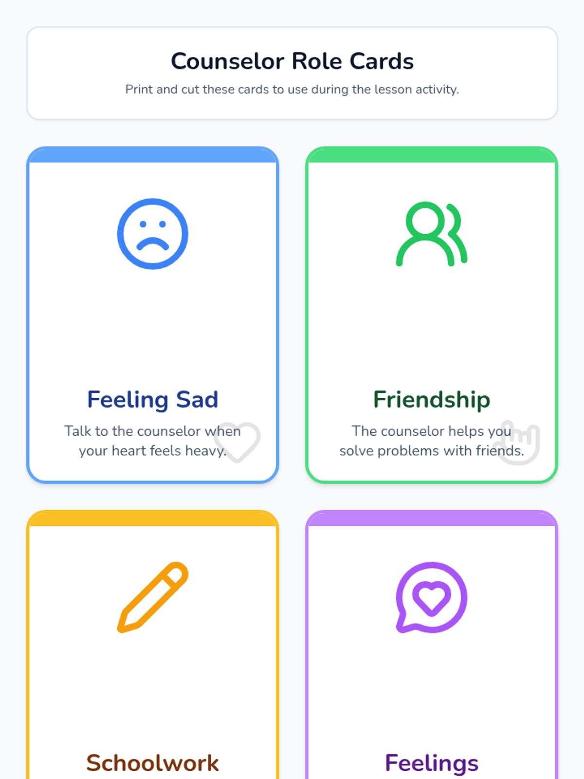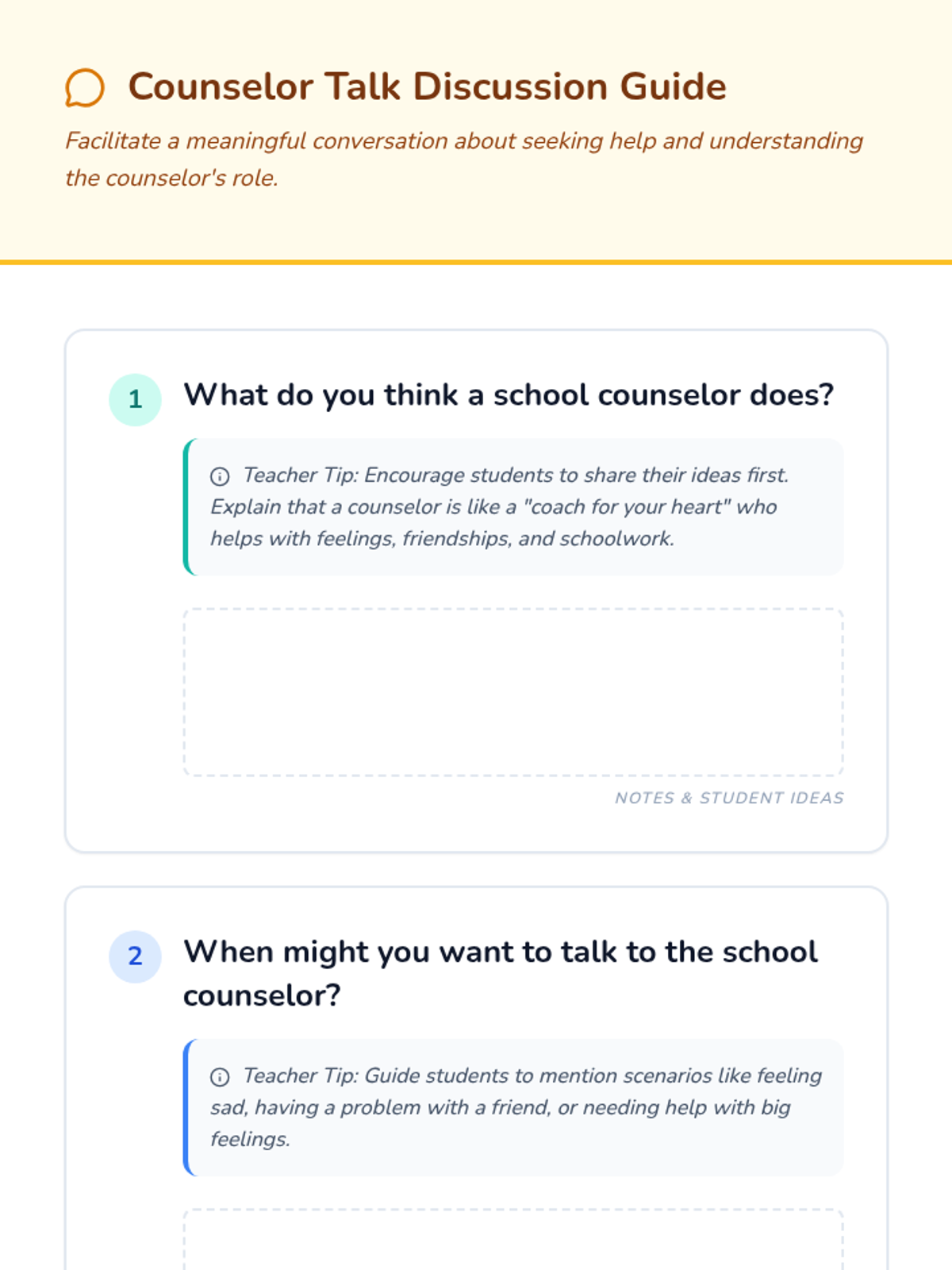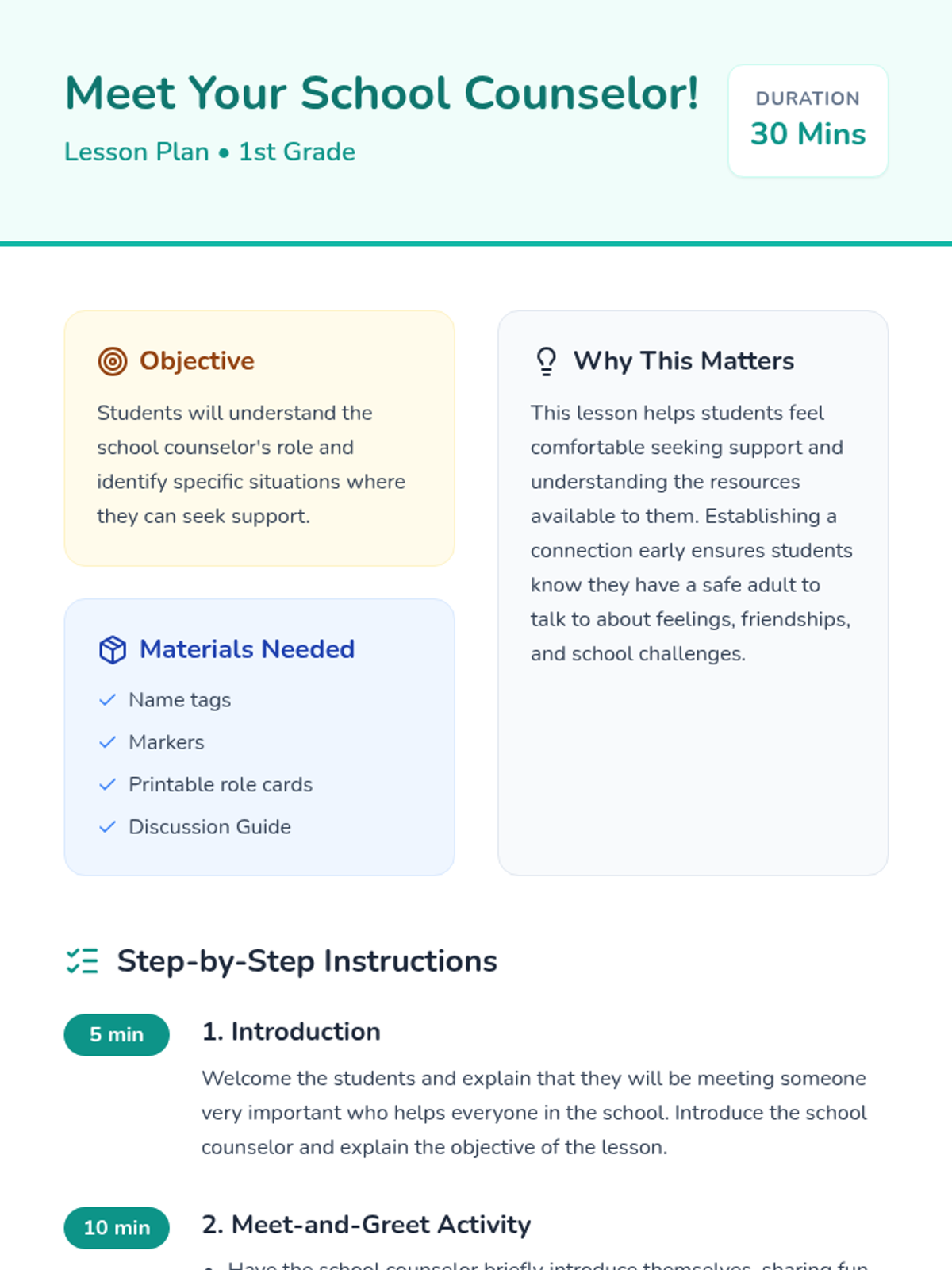 A friendly introductory lesson for 1st graders to meet their school counselor, understand their supportive role, and feel comfortable seeking help with feelings, friendships, and schoolwork.