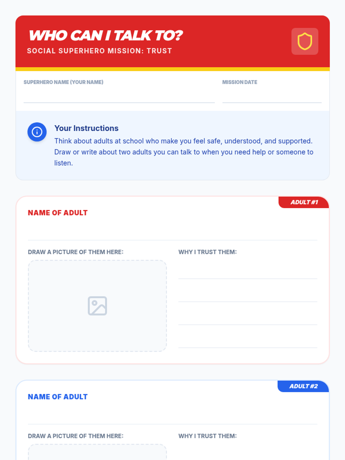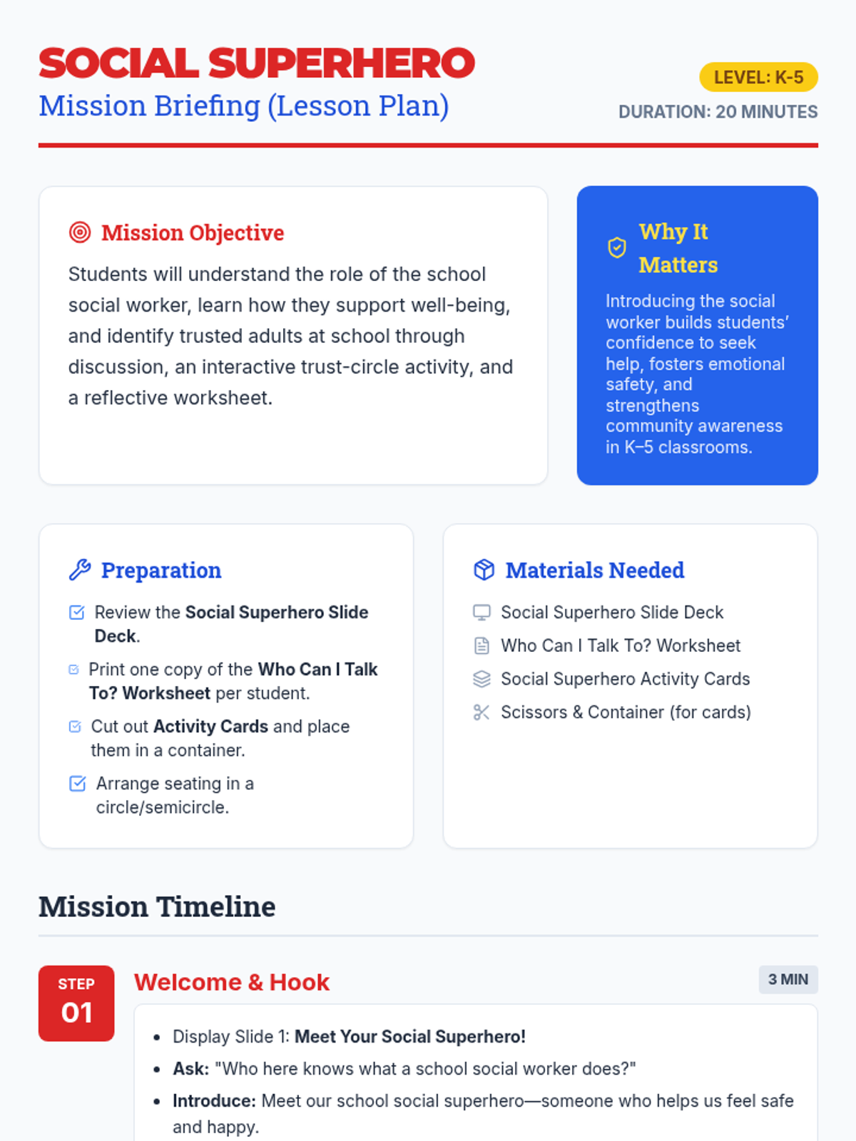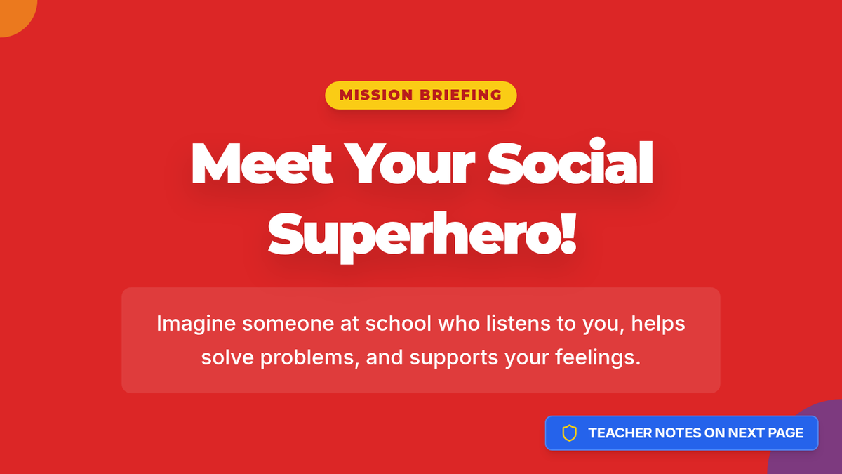 A 20-minute foundational lesson for K-5 students to meet their school social worker, understand their role as a 'Social Superhero', and identify trusted adults at school.