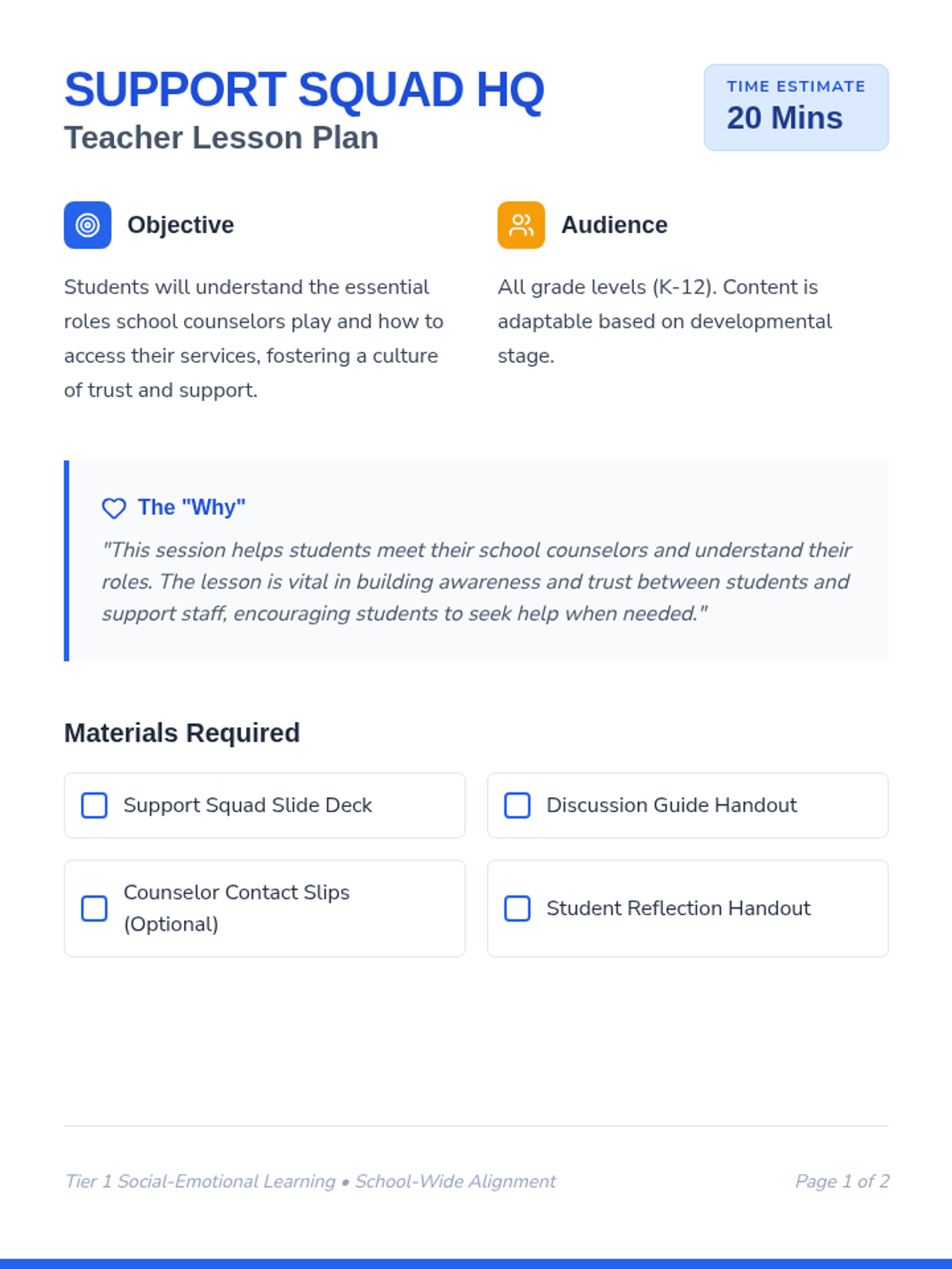 A lesson designed to introduce students to their school counselors, explaining their roles and how to seek support. Building trust and awareness is the primary goal.