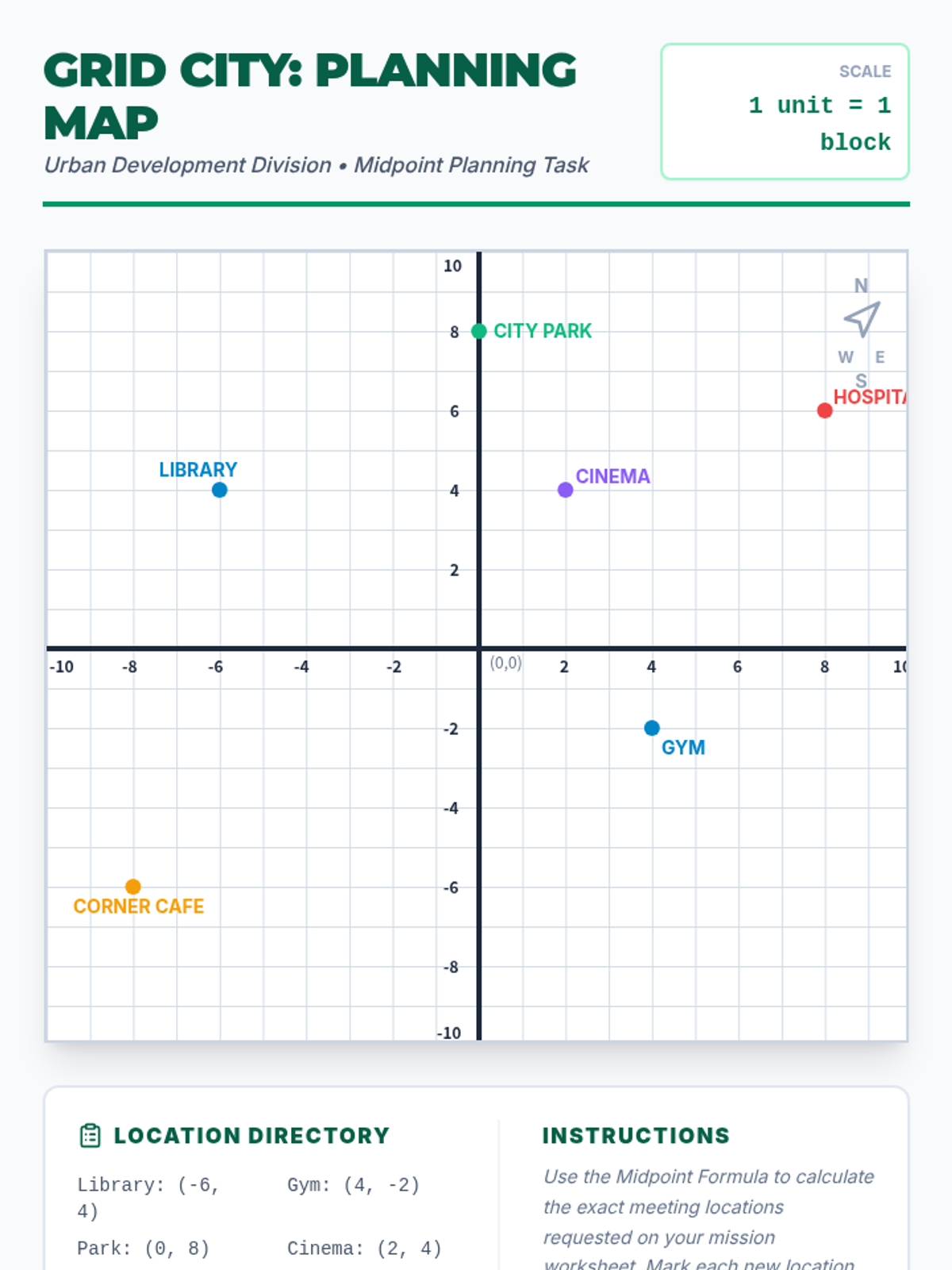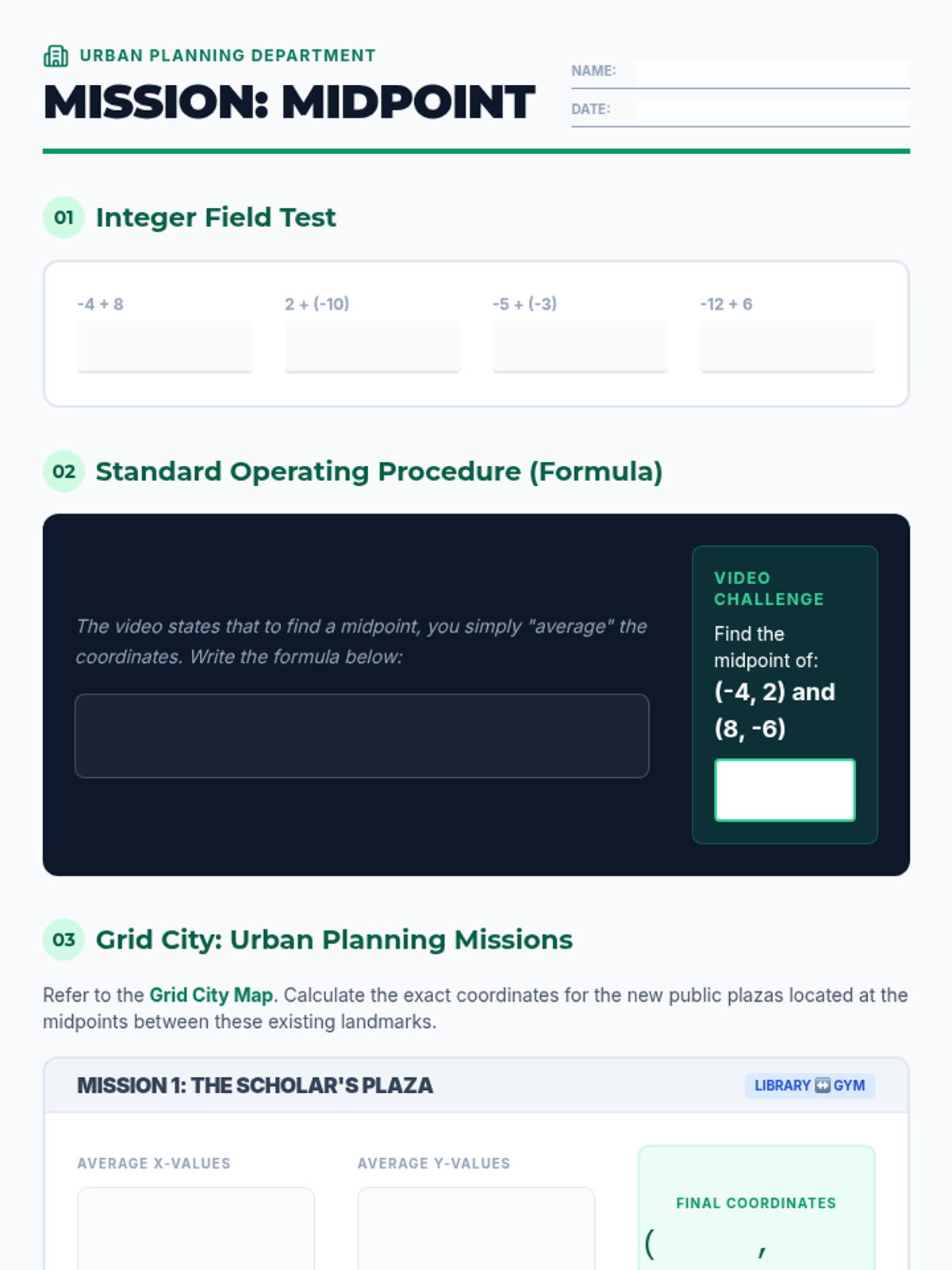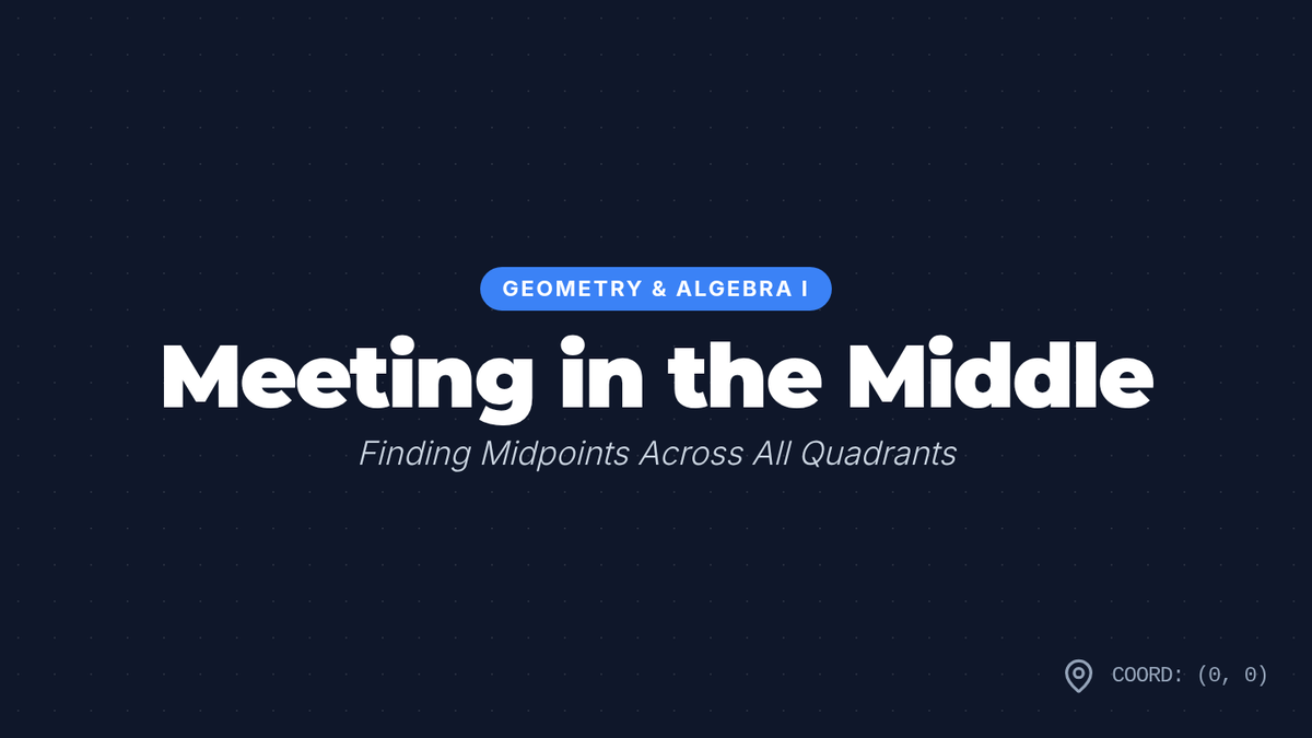 A 9th-grade Algebra/Geometry lesson focused on finding the midpoint between two points on a coordinate plane, with a specific emphasis on integer operations and quadrant logic.