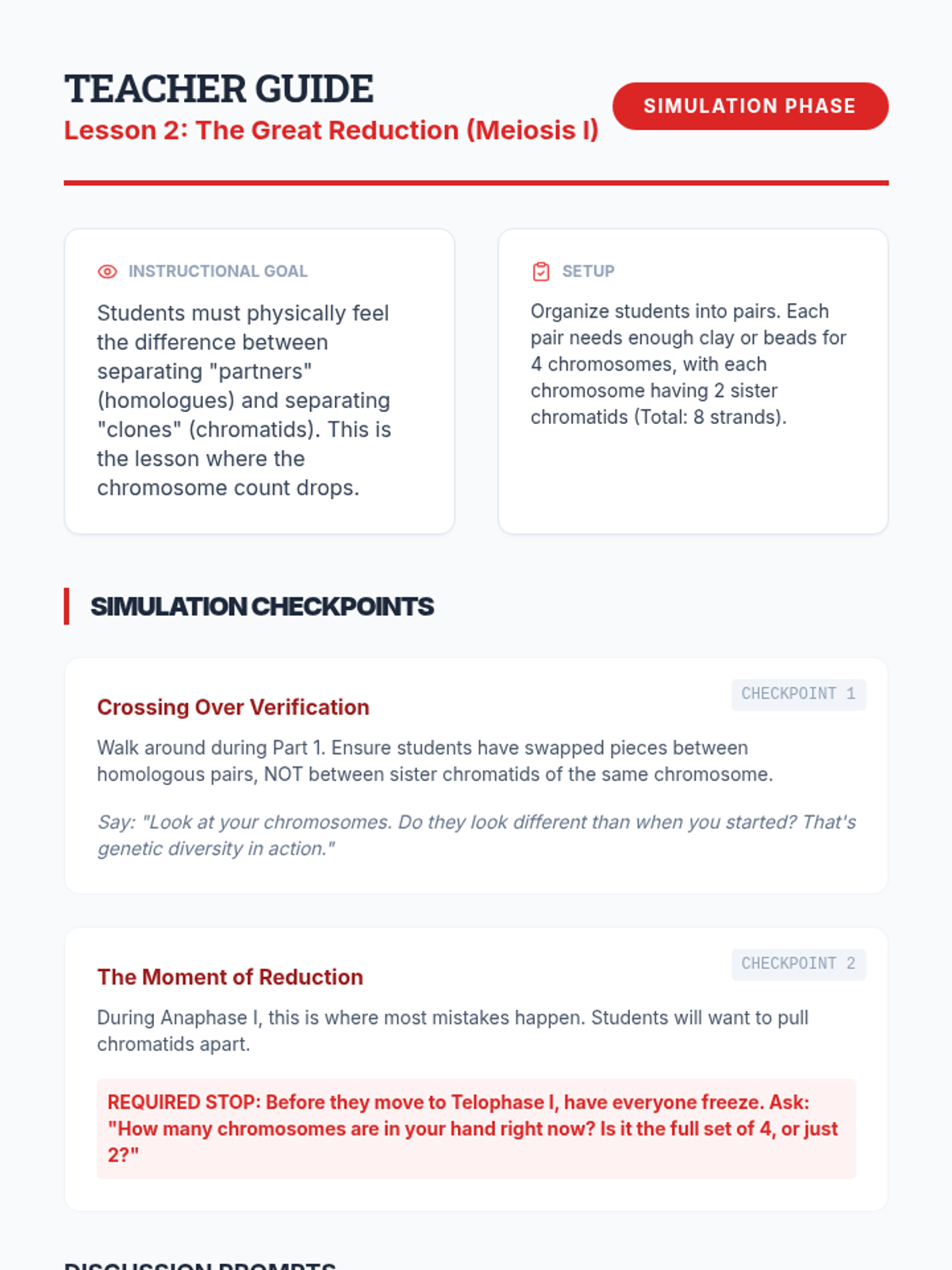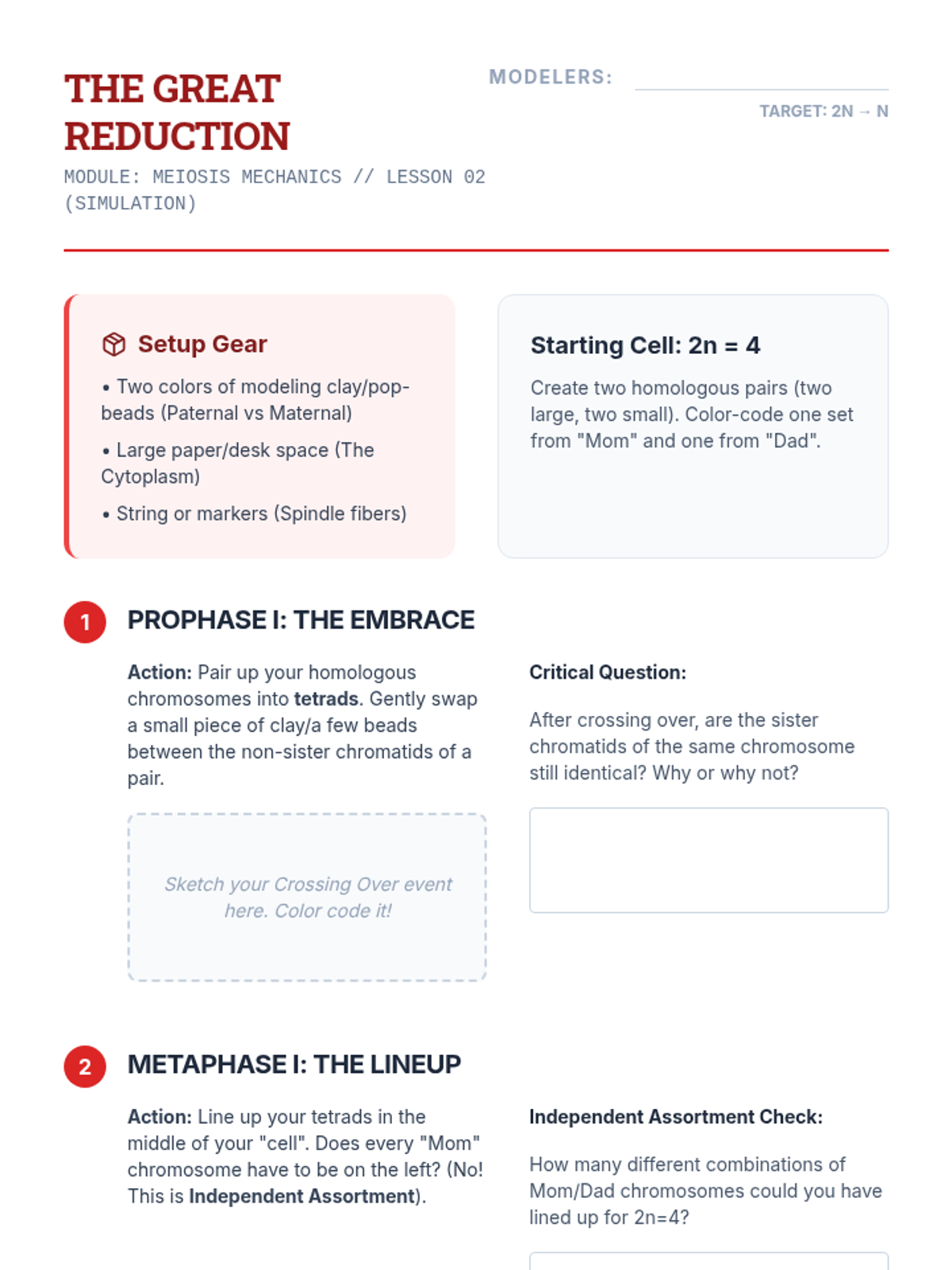 Students simulate the first stage of meiosis, focusing on synapsis and the separation of homologous chromosomes to achieve reduction division.