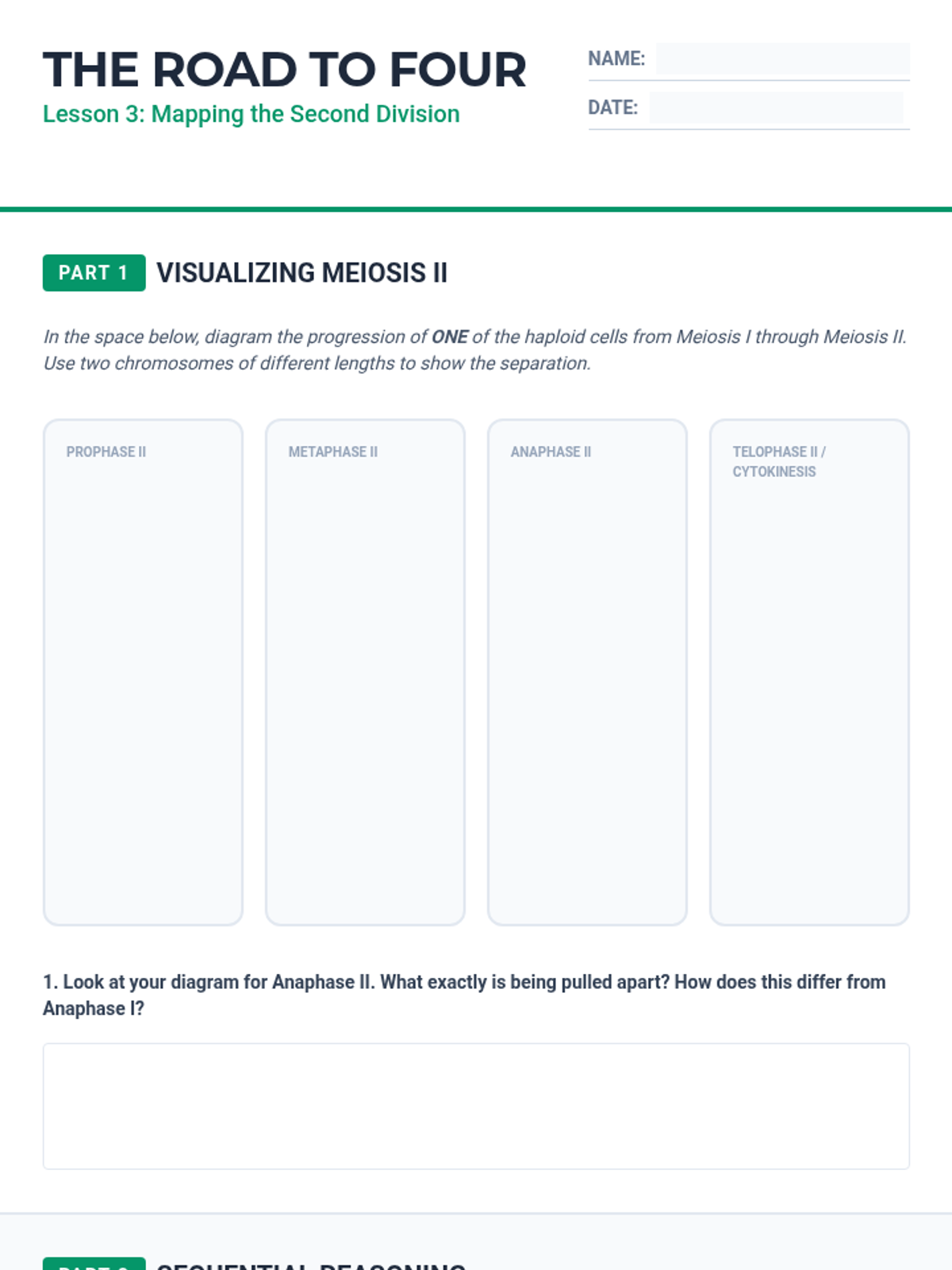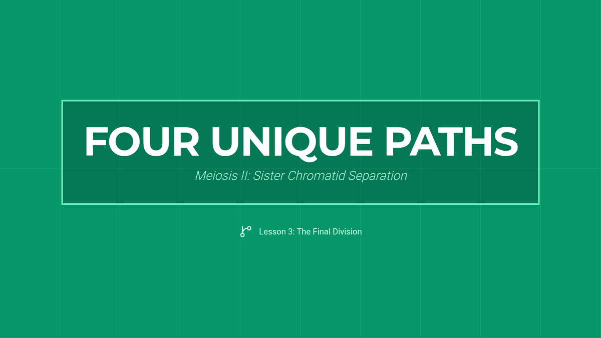 Students follow the process through the second division, tracking sister chromatid separation into four unique daughter cells.
