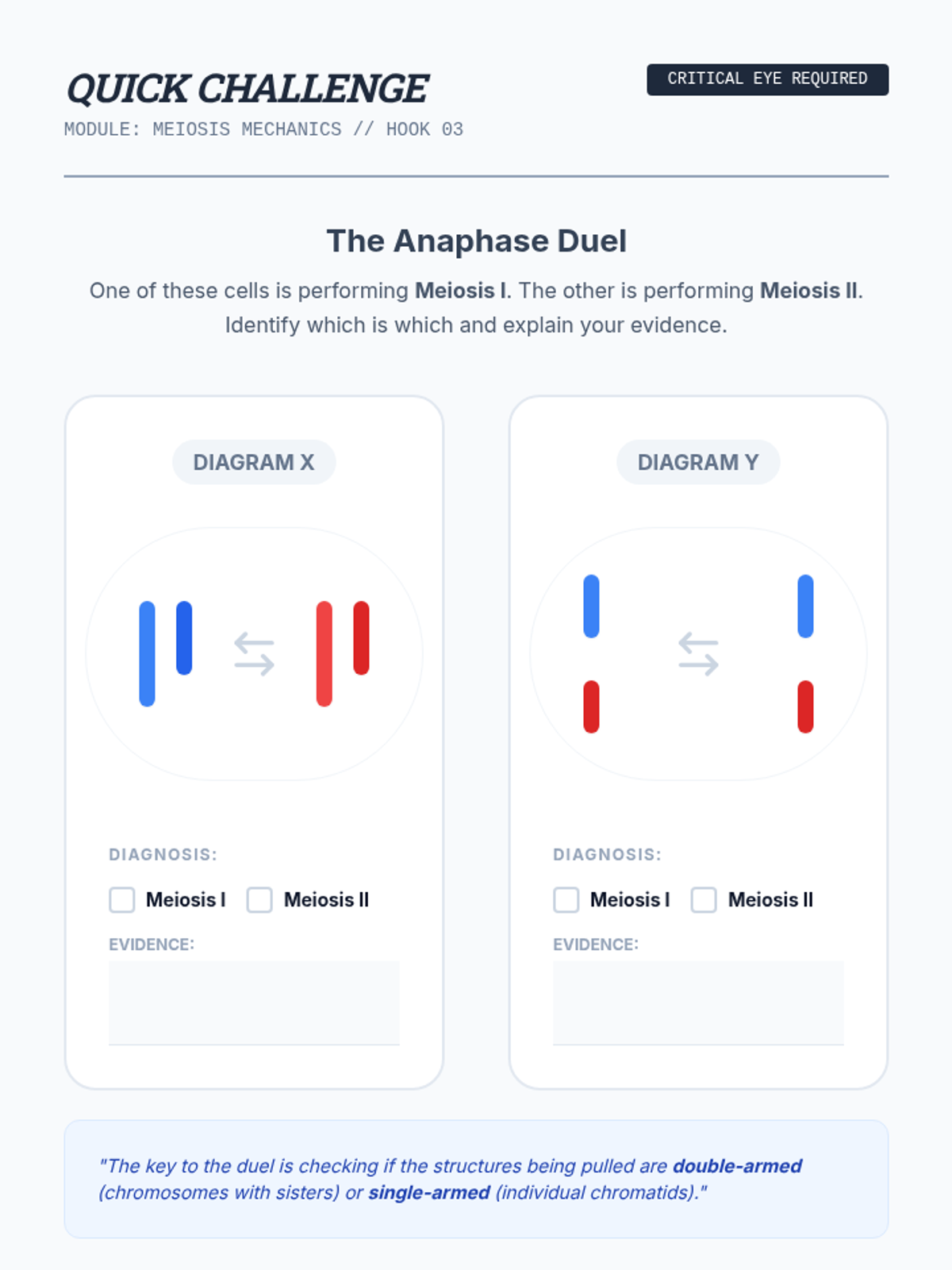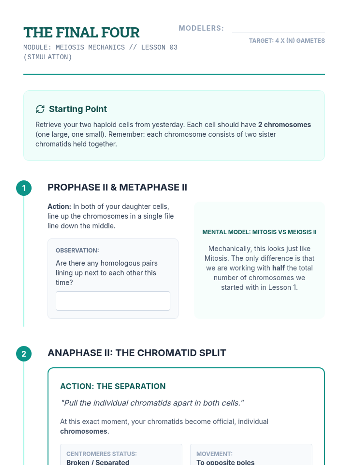 Students complete their simulation by separating sister chromatids, resulting in the formation of four haploid daughter cells.
