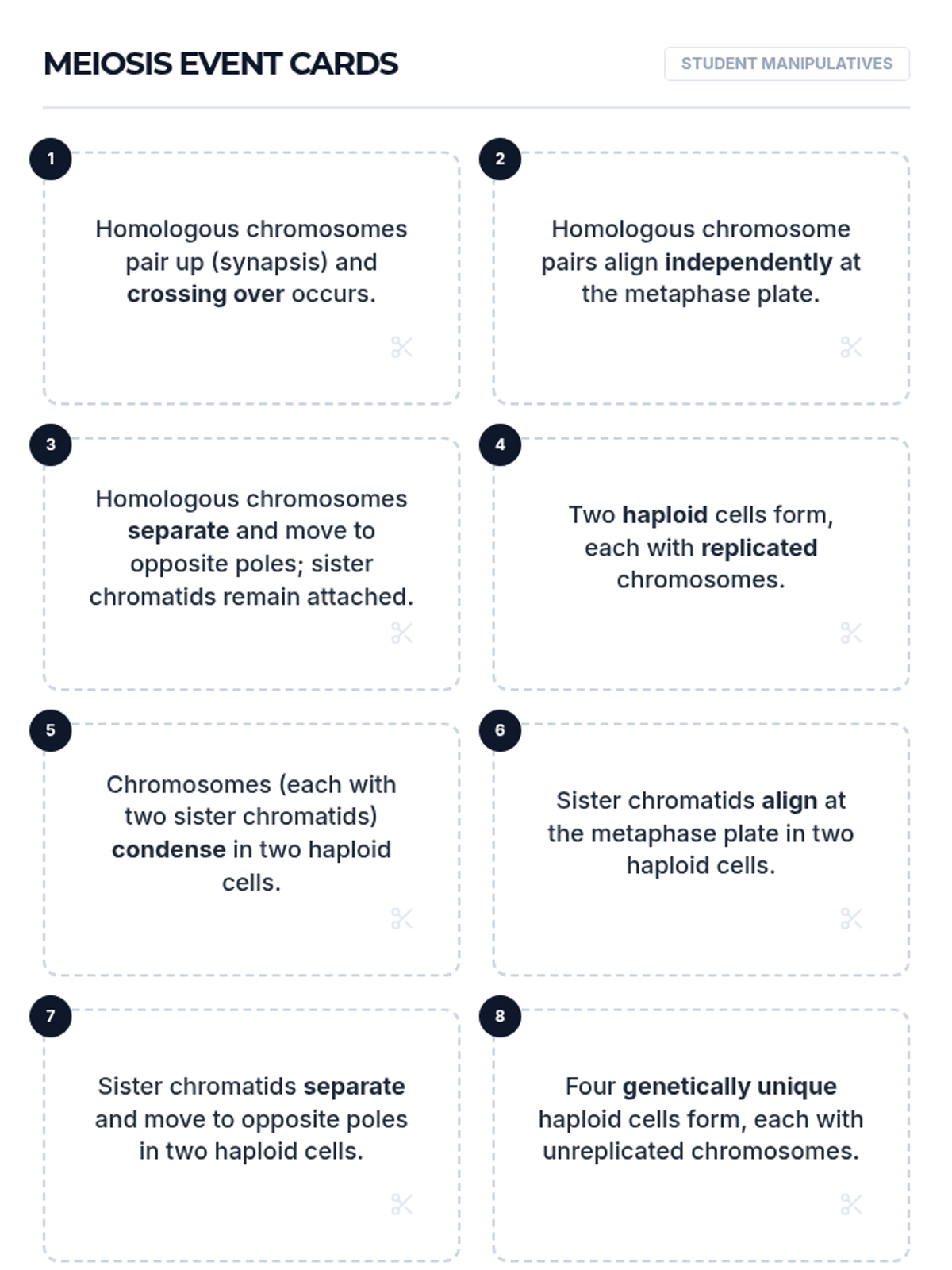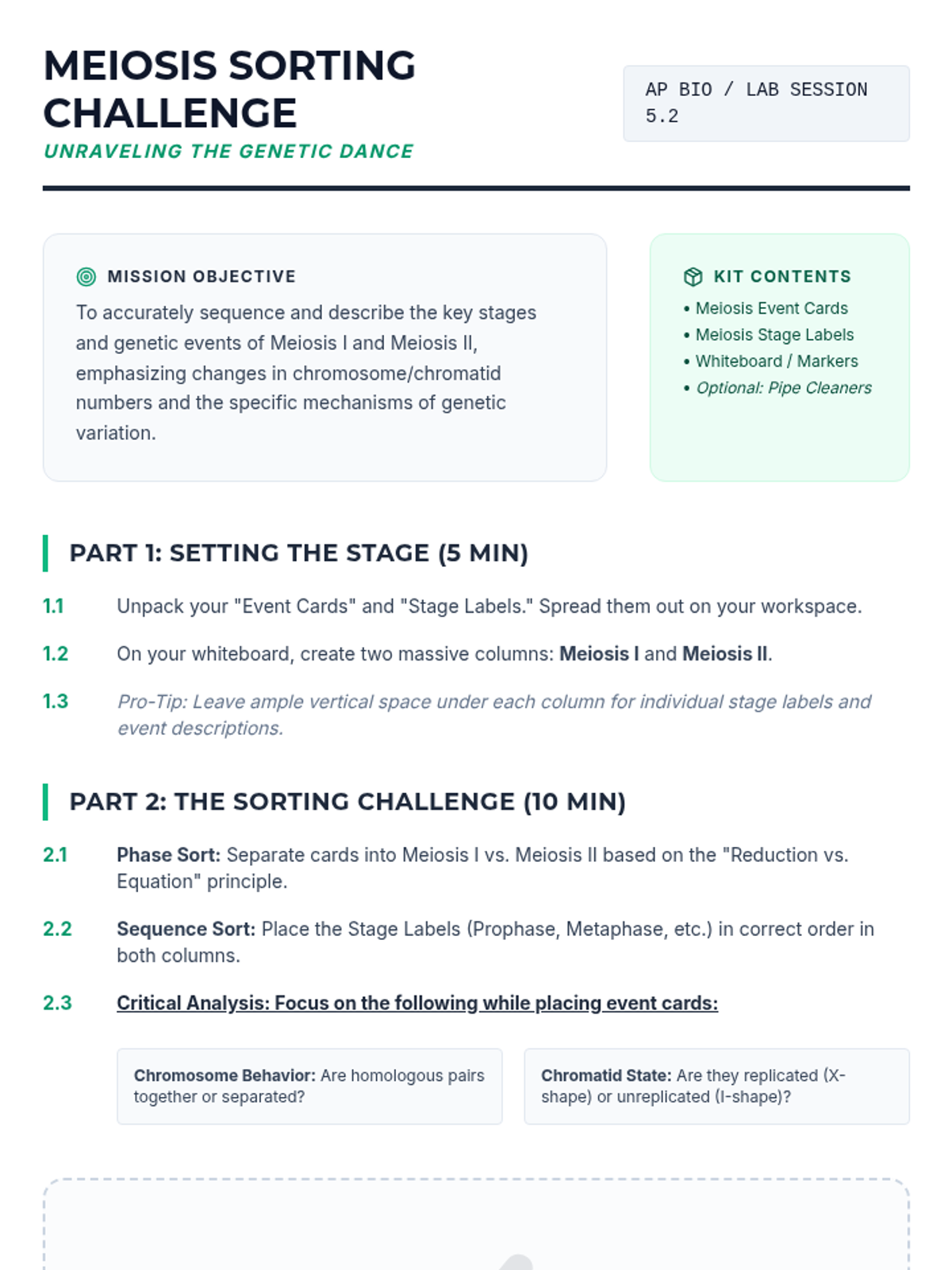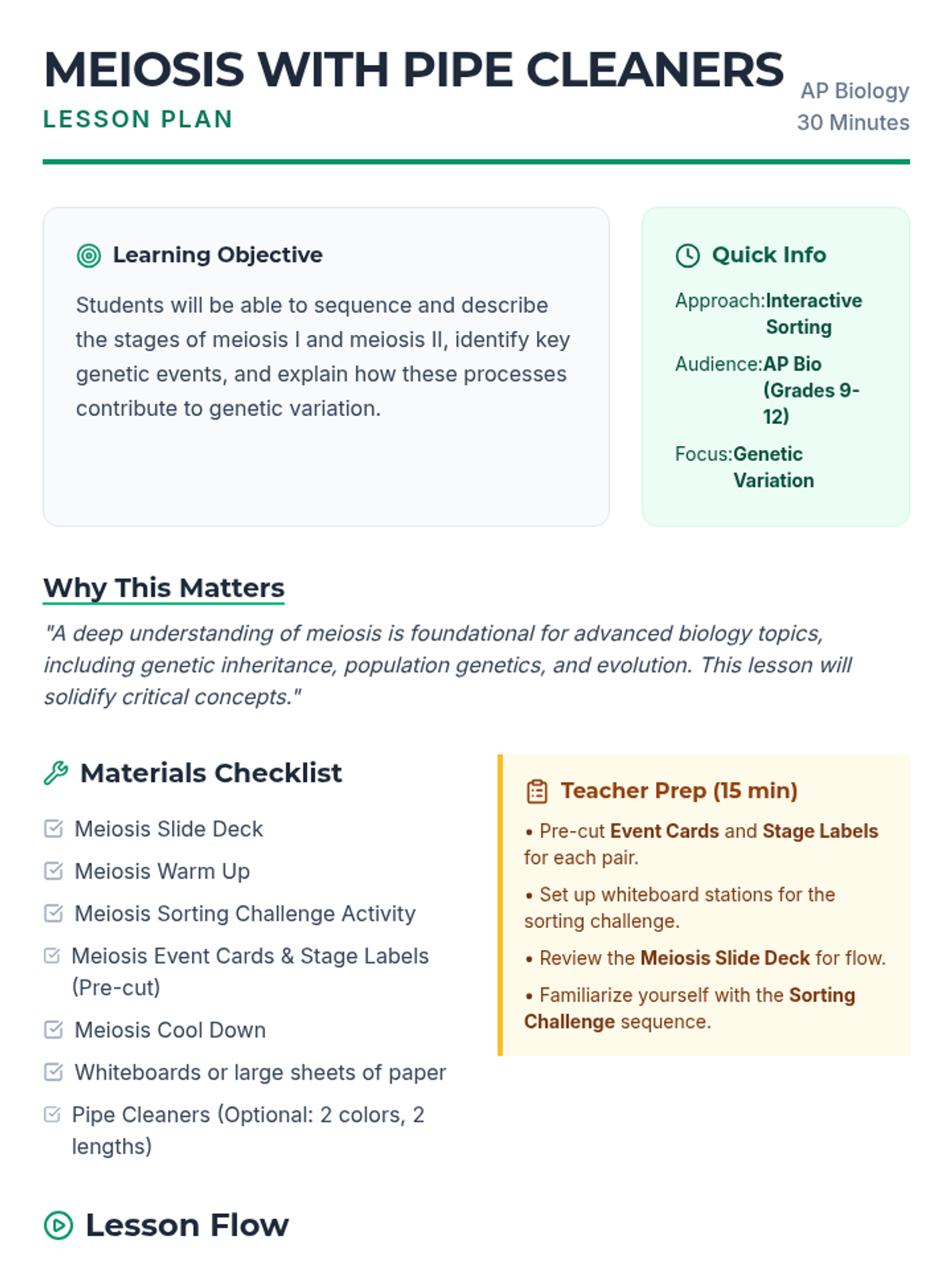 A hands-on AP Biology lesson where students use physical models (sorting cards and potentially pipe cleaners) to visualize the stages of meiosis and the mechanisms of genetic variation.
