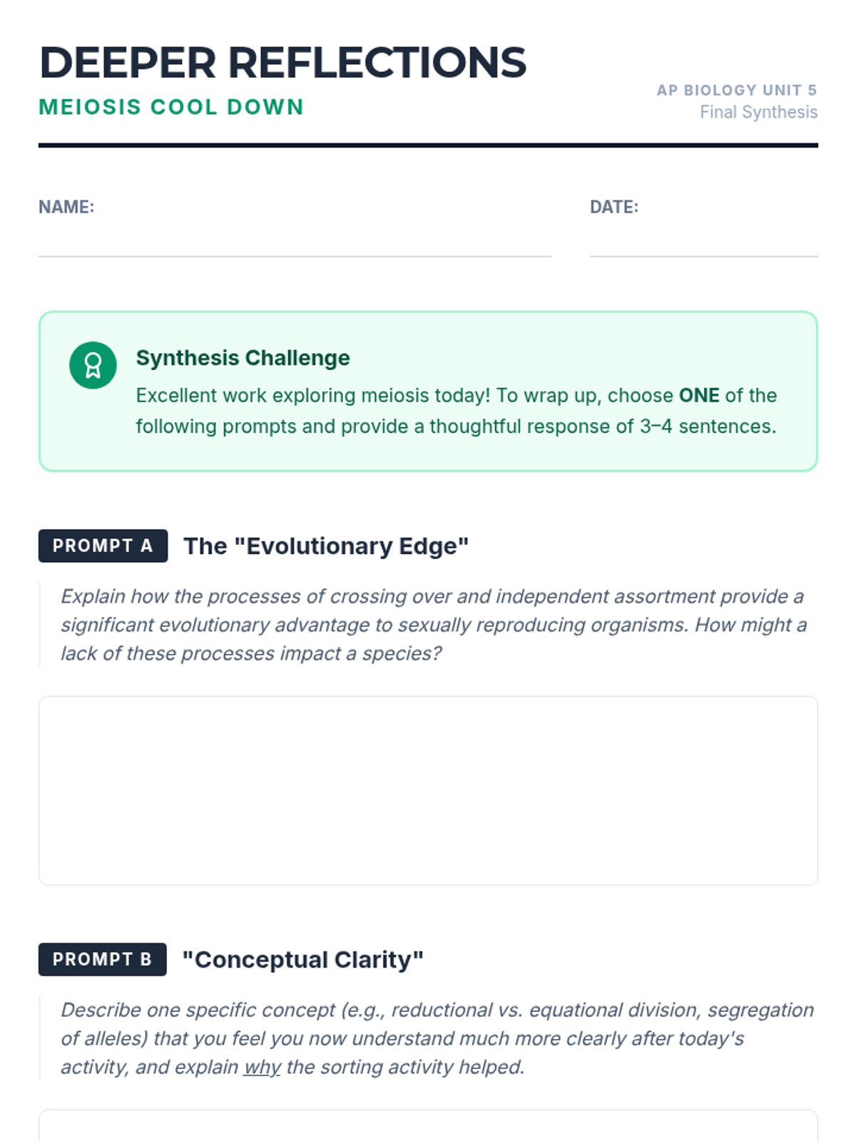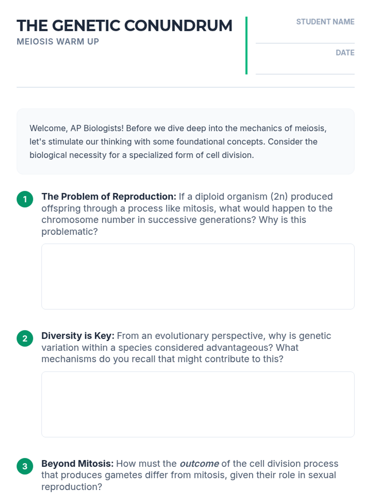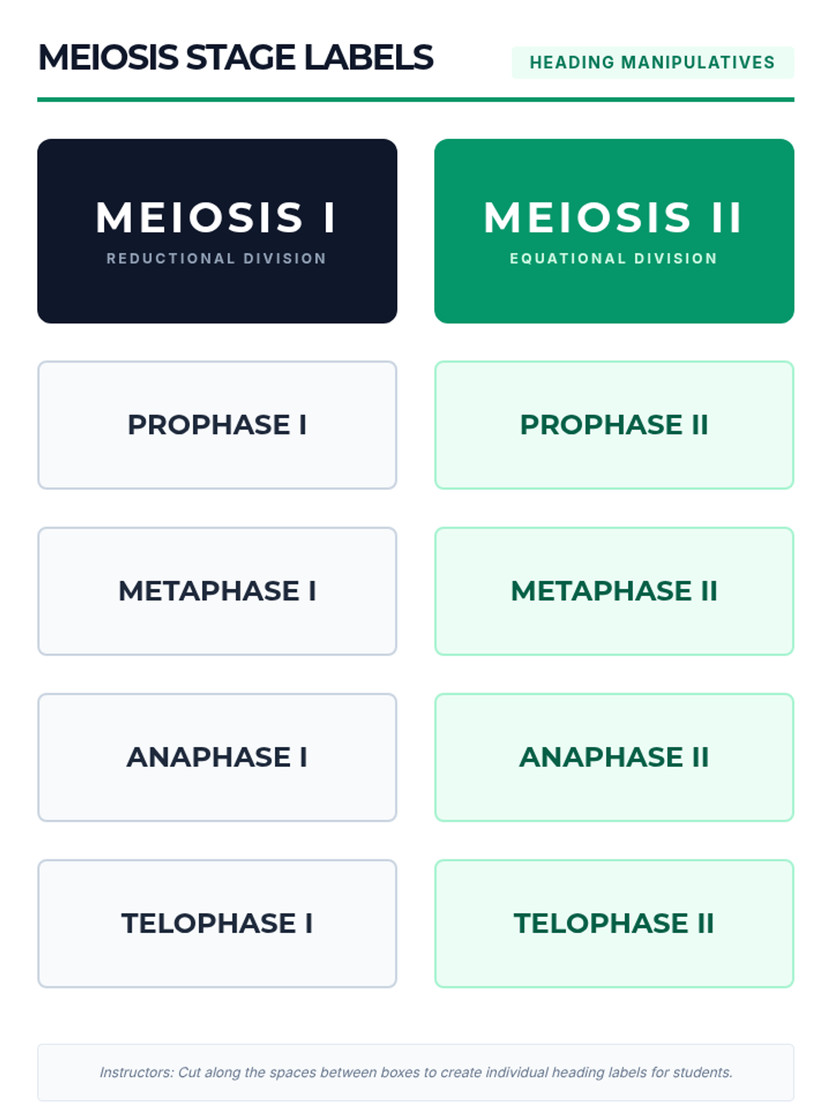 A hands-on AP Biology lesson where students use physical models (sorting cards and potentially pipe cleaners) to visualize the stages of meiosis and the mechanisms of genetic variation.