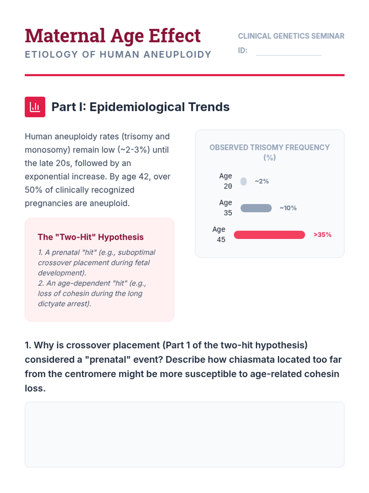 Explore the causes of aneuploidy, focusing on the maternal age effect, cohesin fatigue, and the differential efficacy of checkpoints in male versus female gametogenesis.