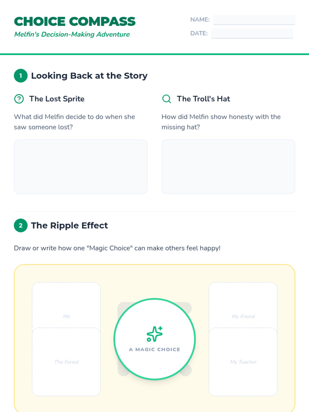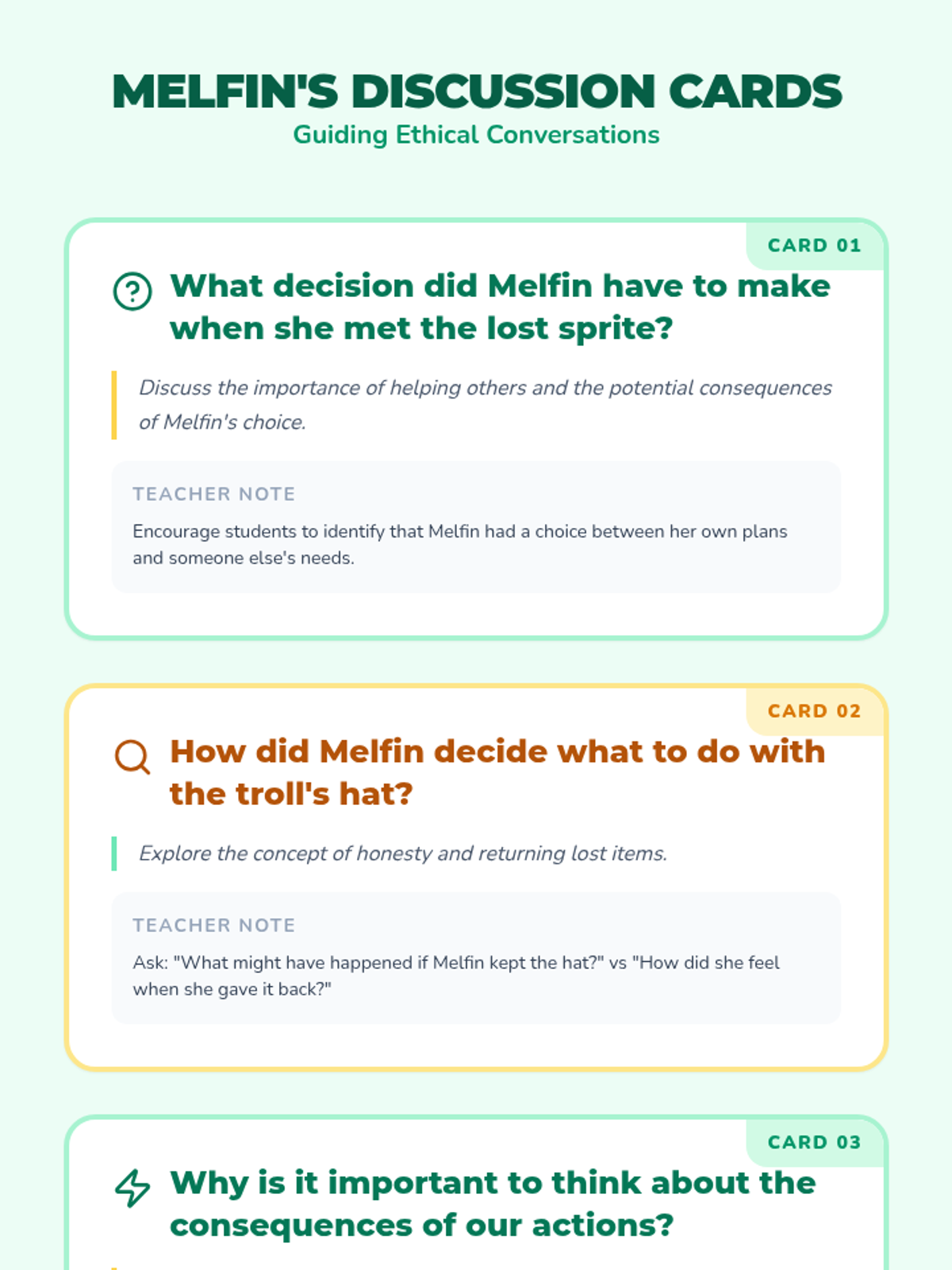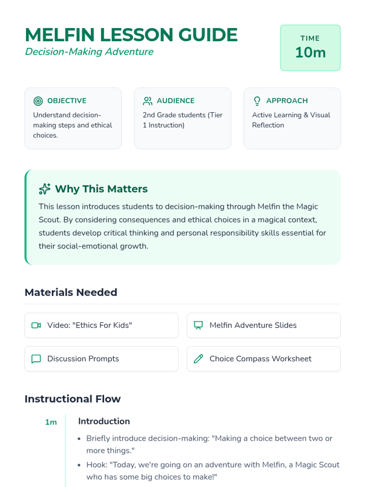 A 10-minute introductory lesson for 2nd graders focused on ethical decision-making and consequences through the story of Melfin the Magic Scout. Students will watch a video and engage in guided discussion about honesty and helping others.