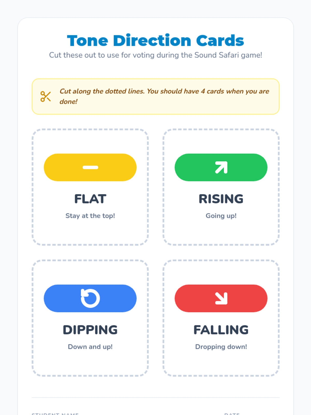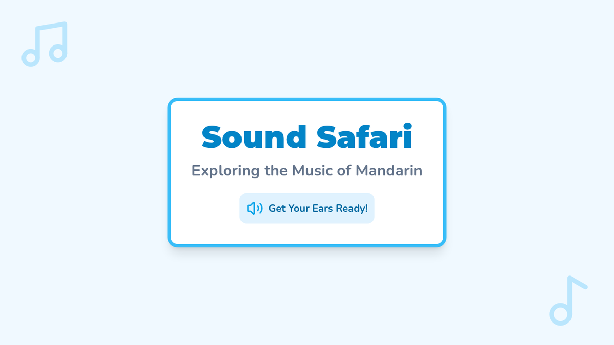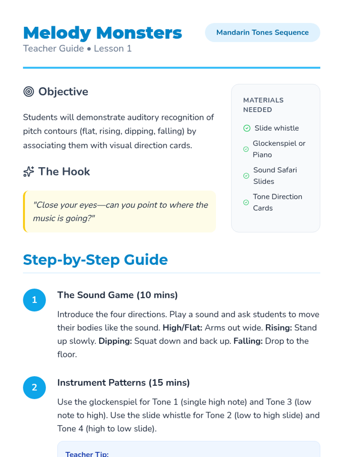 Students listen to pitch directions (flat, rising, dipping, falling) played on musical instruments to isolate tone contours from language.
