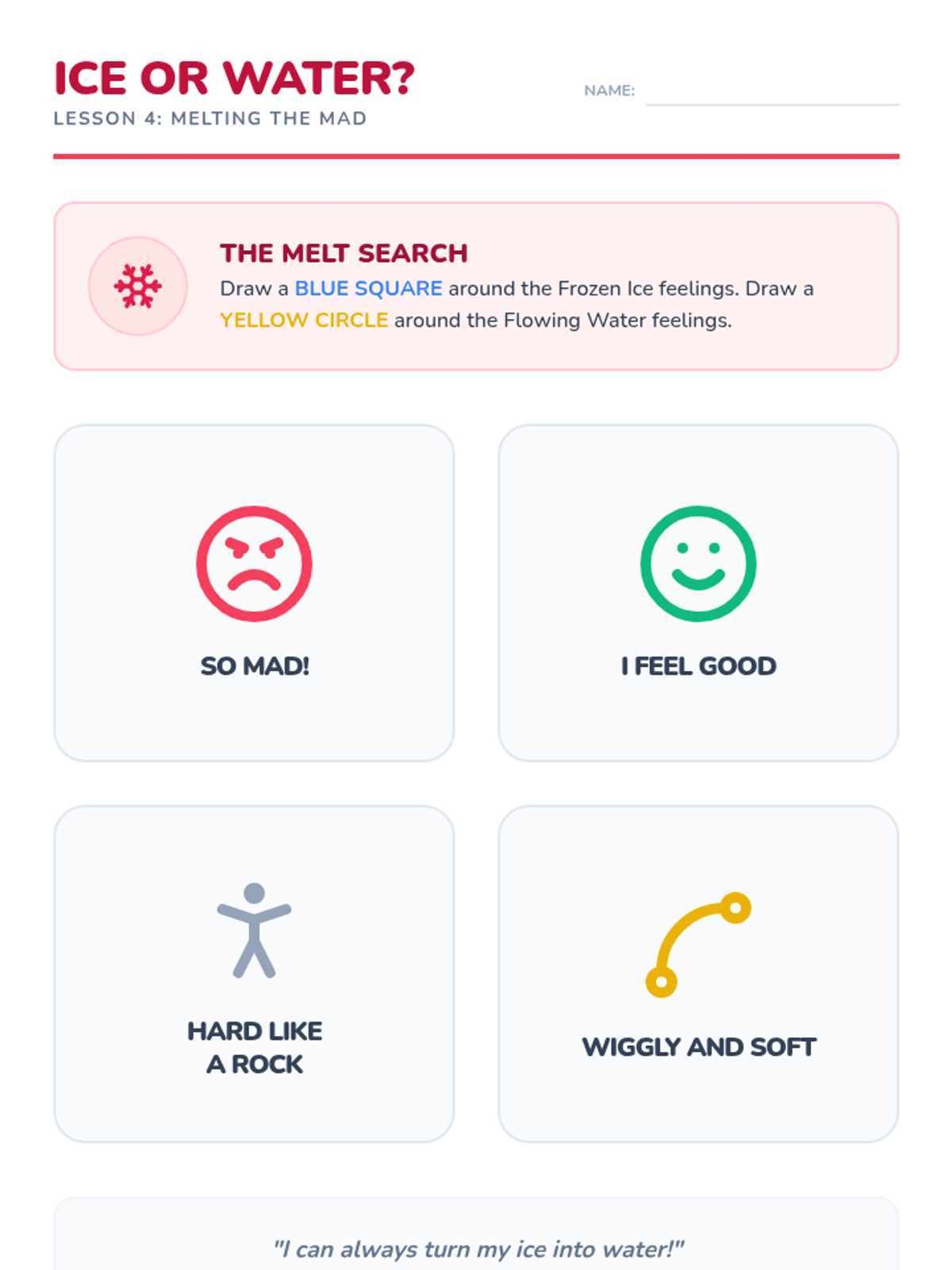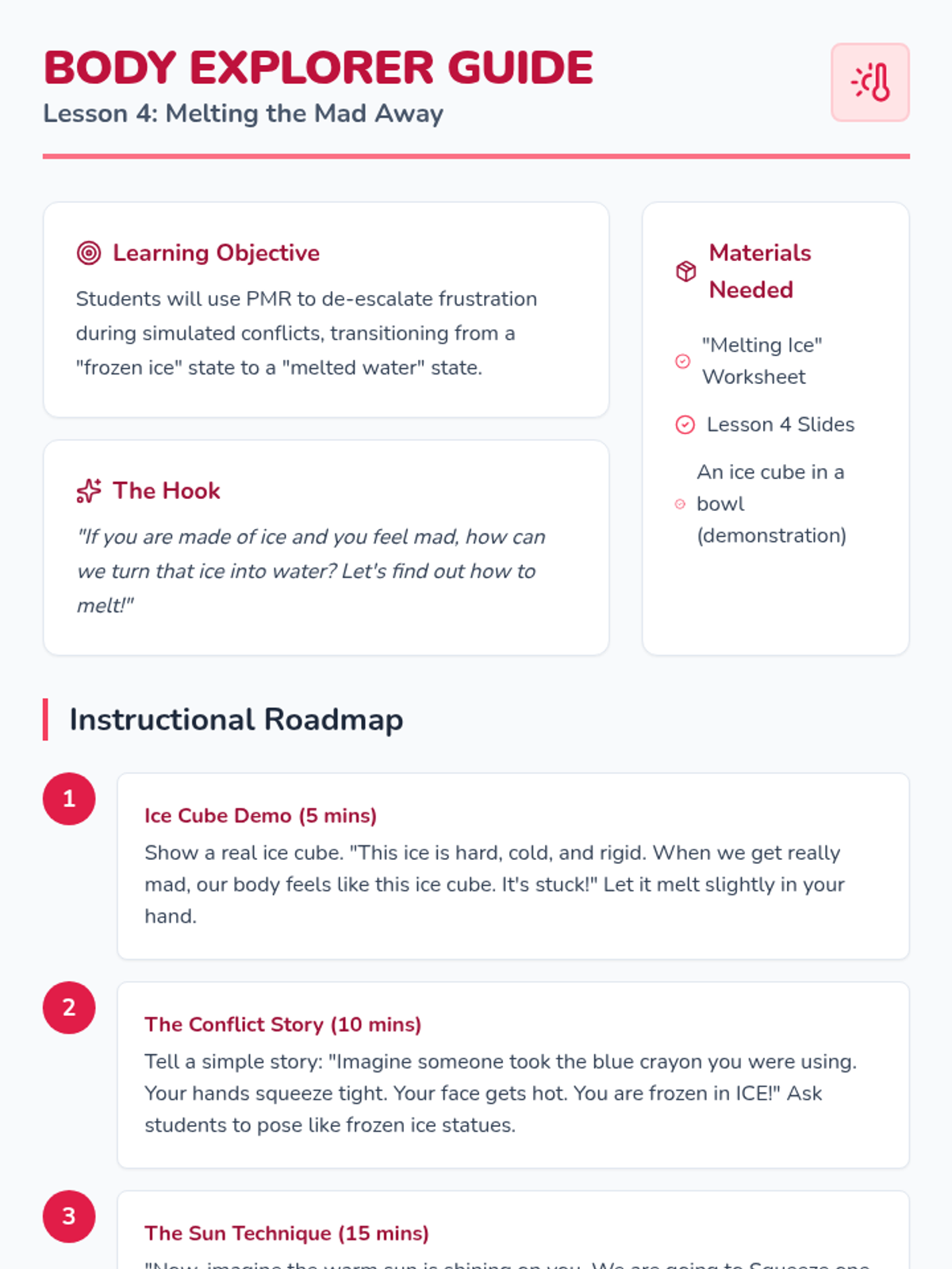 Focusing on conflict resolution, students learn to 'melt' physical stiffness to calm their minds, transitioning from rigid to relaxed postures.