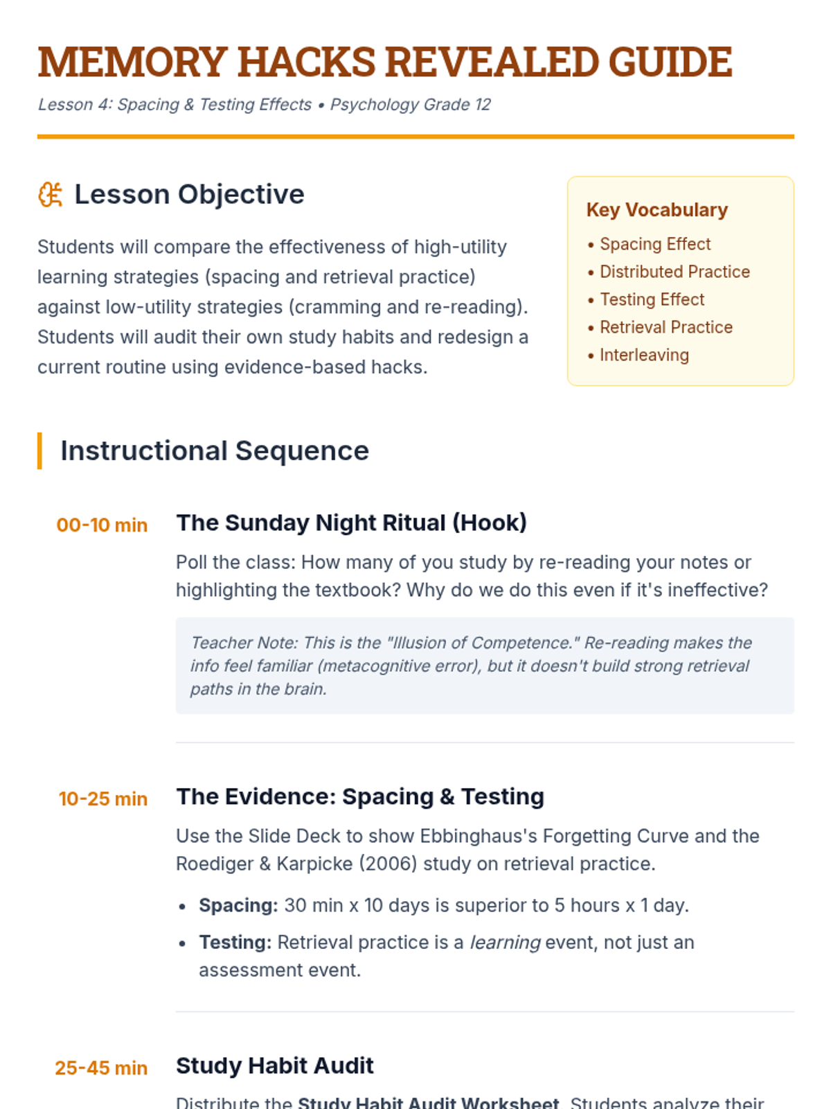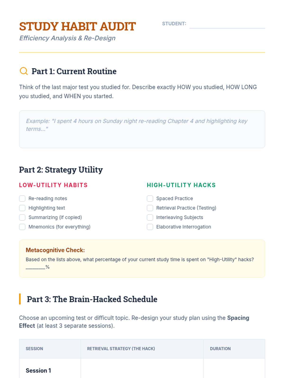Review of empirical evidence for spacing and testing effects over cramming. Students audit their own study habits and workshop high-utility cognitive strategies.