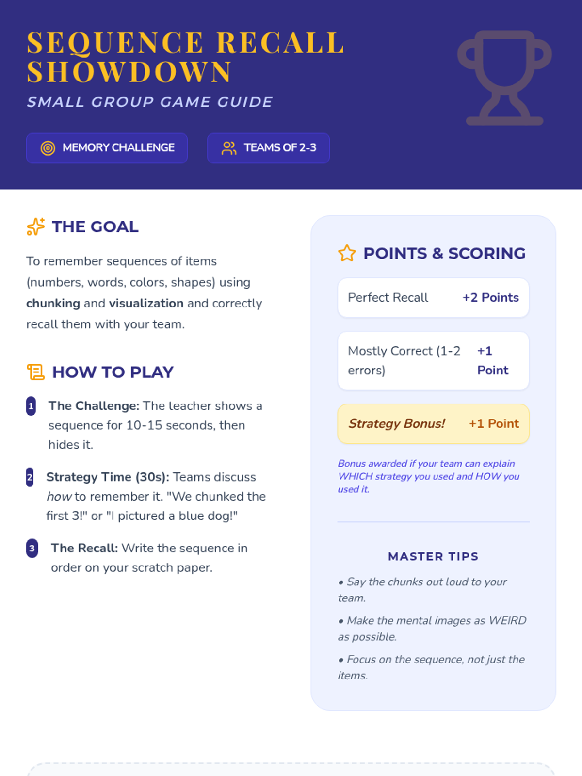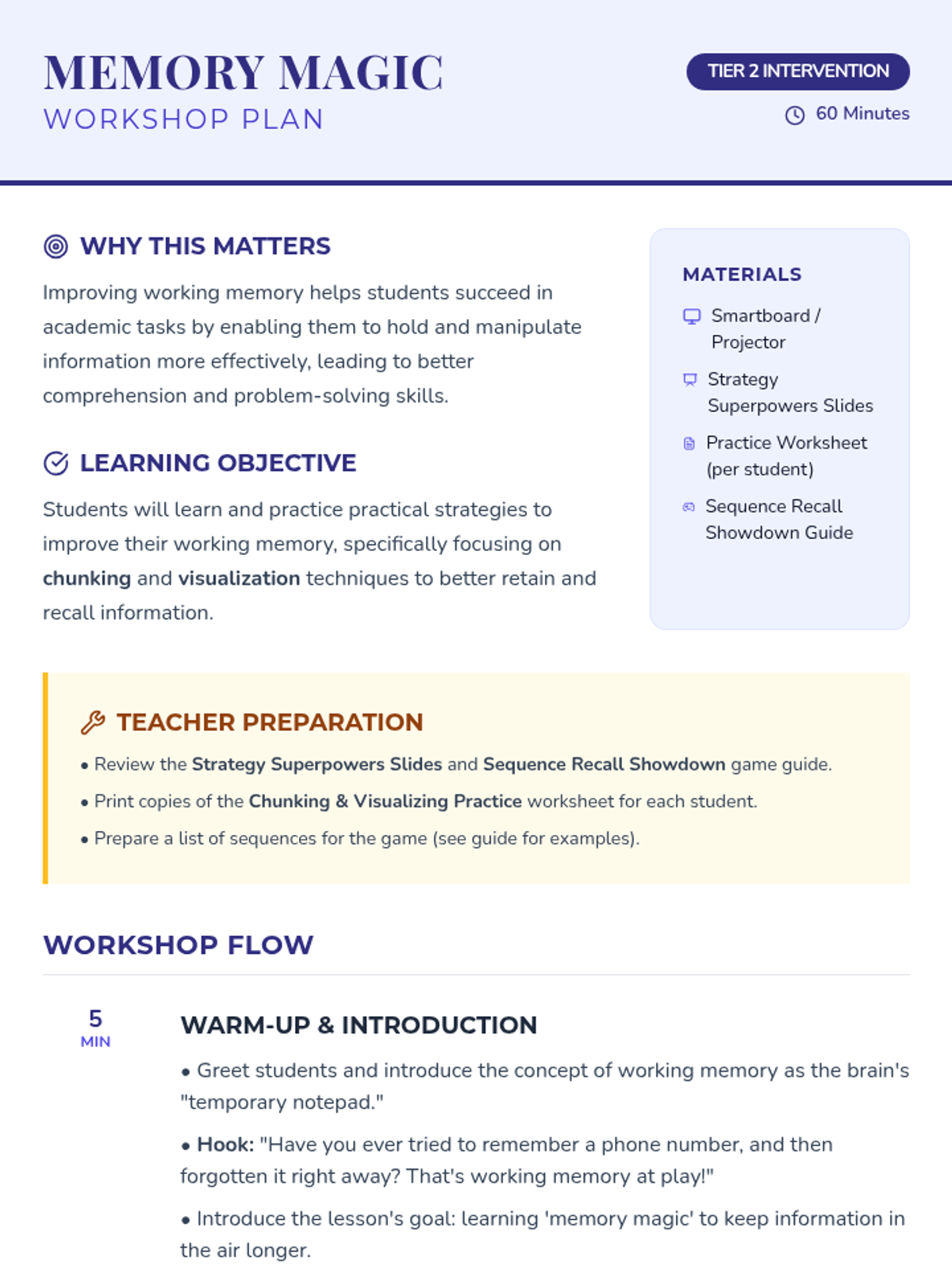 This Tier 2 intervention lesson introduces 7th-grade students to practical working memory strategies, specifically chunking and visualization, through direct instruction, guided practice, and a competitive recall game.