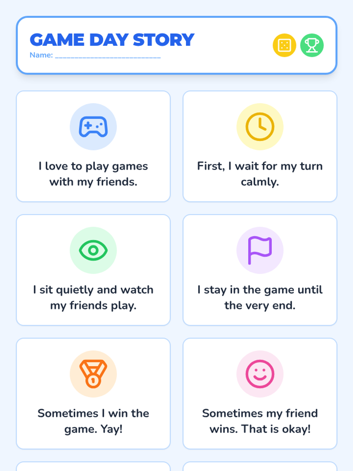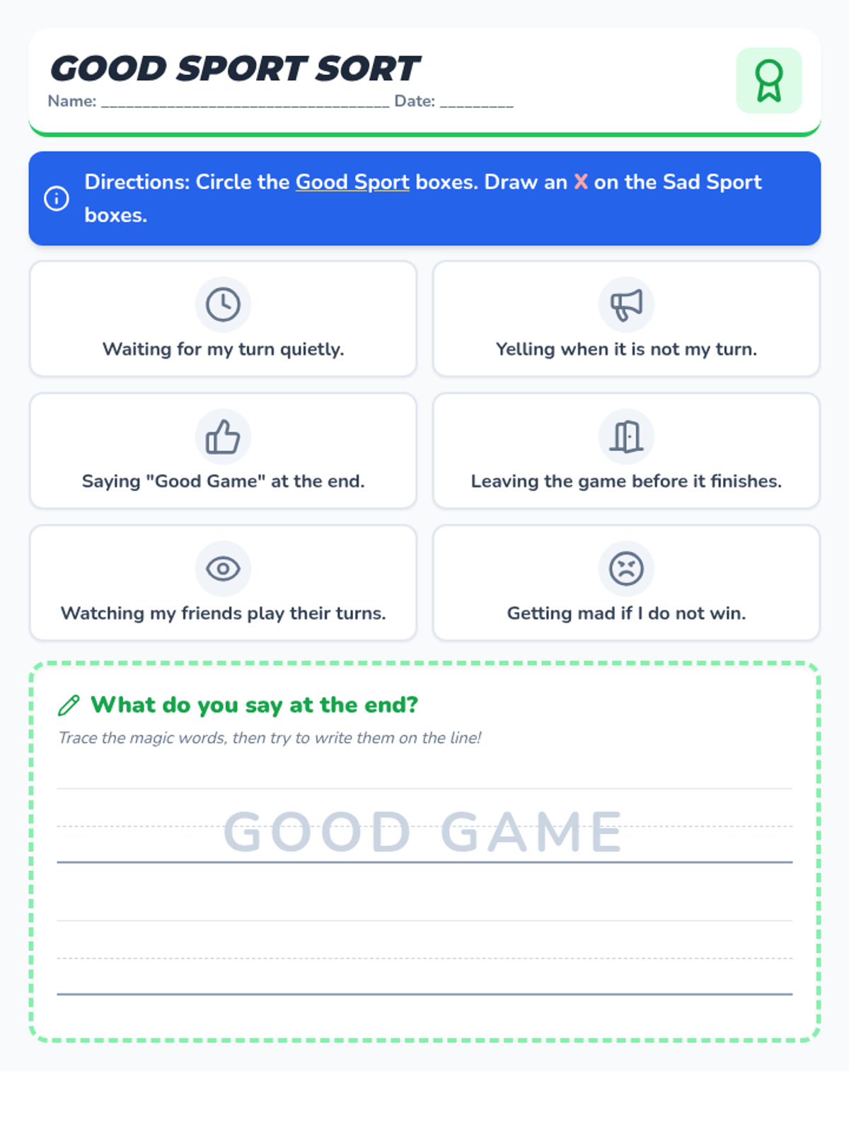 A lesson focused on teaching children how to be good sports by waiting for their turn and handling losing with a positive attitude.