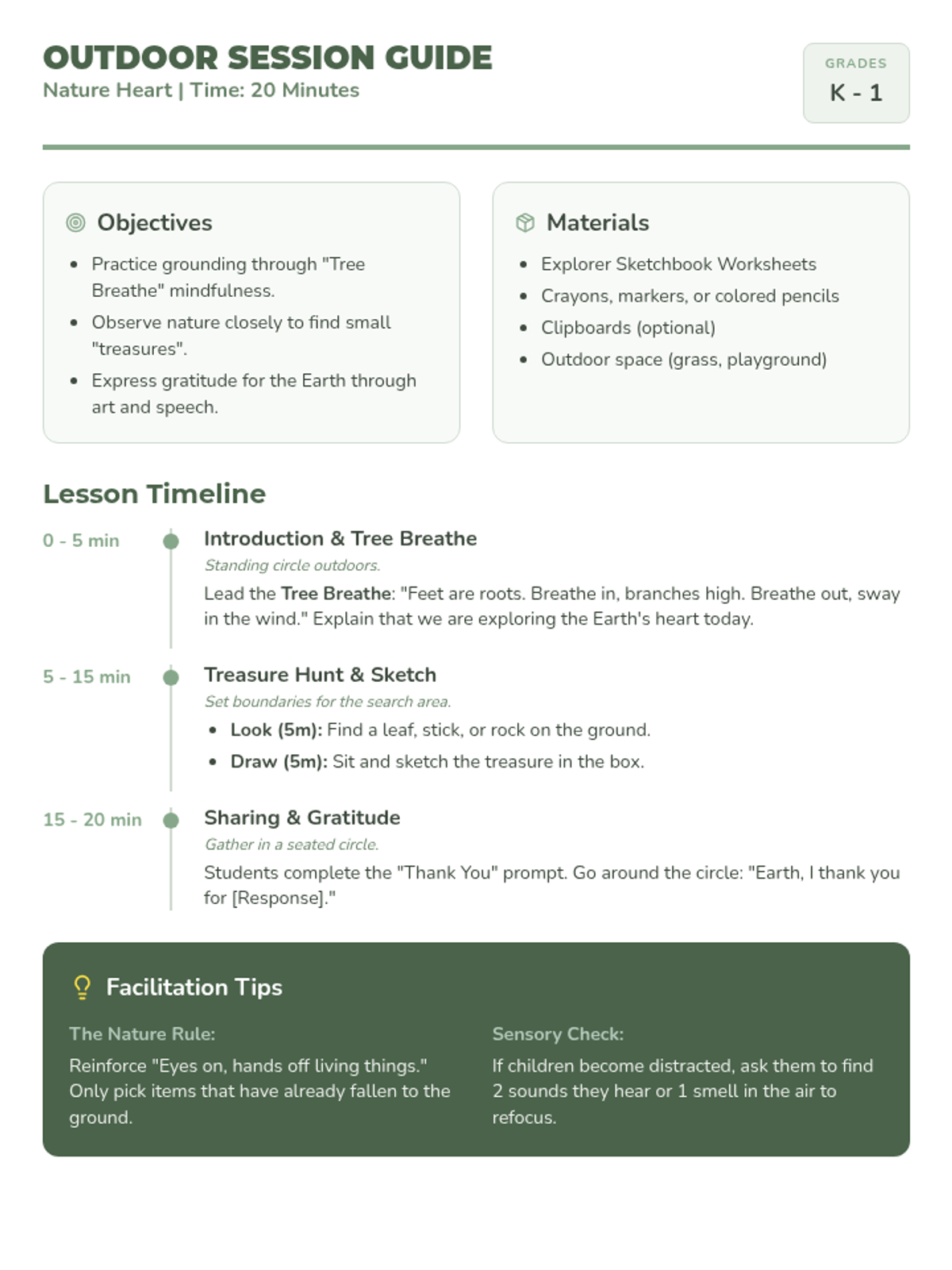 A nature-inspired lesson teaching Pre-K through 5th-grade students sensory regulation techniques to manage stress and social friction using environmental grounding.